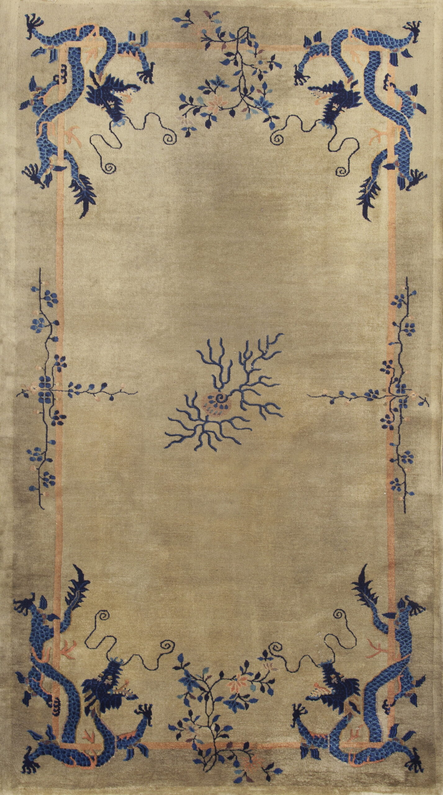 The central design is characterized by four powerful, stylized dragons rendered in deep indigo and sapphire blue, anchoring the corners of the field. These mythical beasts are complemented by delicate, trailing floral motifs that soften the structure and introduce a traditional Chinese sensibility.