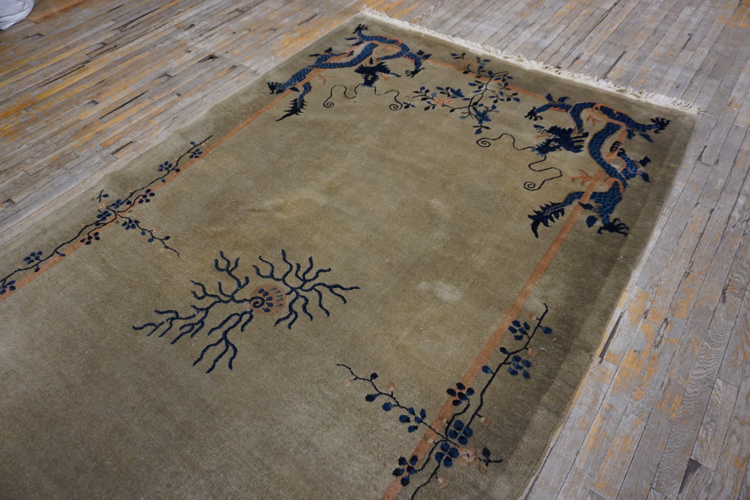 Dating precisely to 1925, this textile represents the height of the Art Deco influence on traditional Chinese weaving, characterized by open fields and minimal ornamentation. Its age, condition, and masterful execution solidify its place among highly desirable antique rugs and textiles of the early 20th century. This is a Room Size Rug (6ft x 11.06ft).
