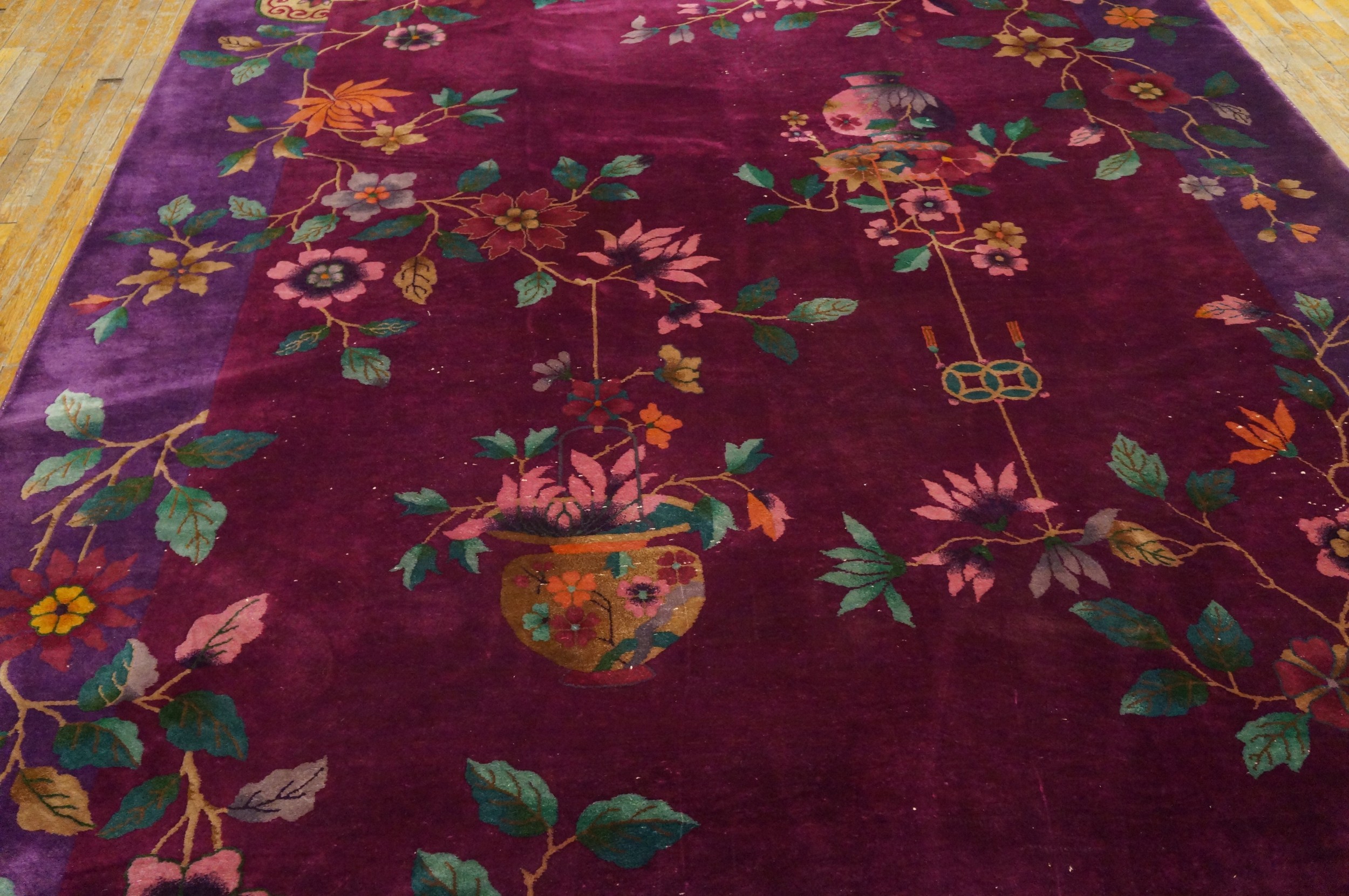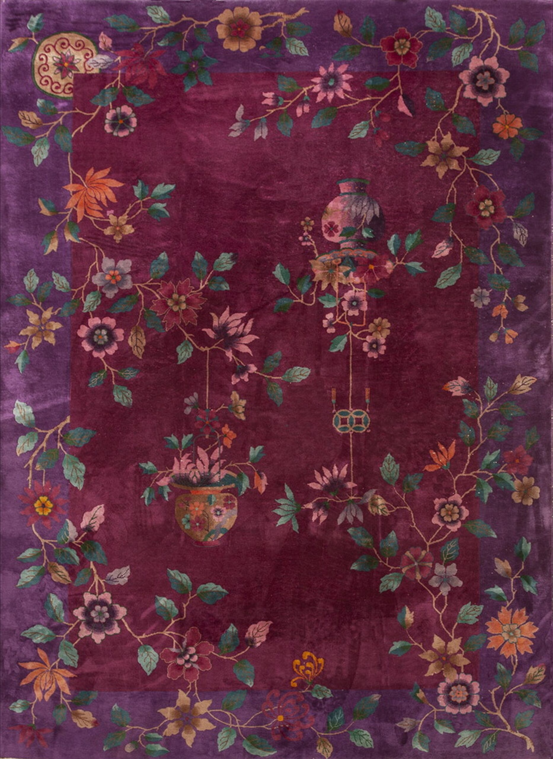 Characteristic of the finest 1920s weaving, the design incorporates traditional Chinese symbols, including suspended vases overflowing with stylized peonies and chrysanthemums. The composition is elegantly balanced, utilizing negative space to allow the rich, hand-knotted wool pile to capture the light and shift the intensity of the fuschia and purple tones across the surface.