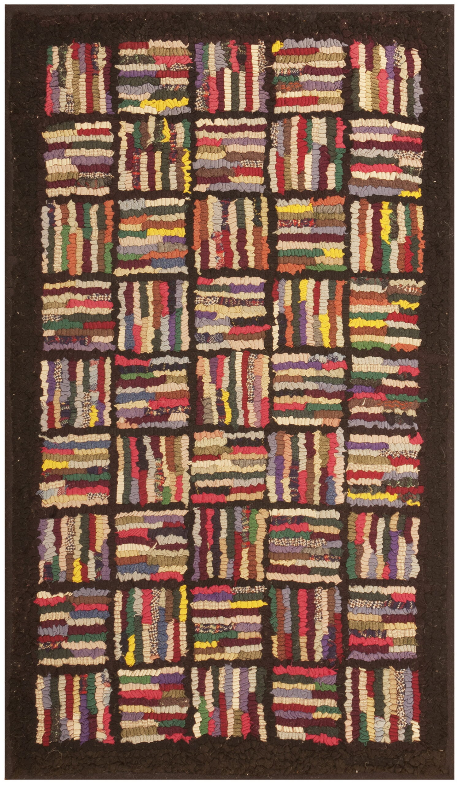 The design employs a striking grid structure, where individual rectangular blocks are filled with vertical or horizontal stripes of varying widths and hues. This highly organized chaos creates an engaging visual rhythm, defining the piece as an allover geometric rug where the pattern repeats seamlessly across the field without reliance on a central medallion or defined border motifs.