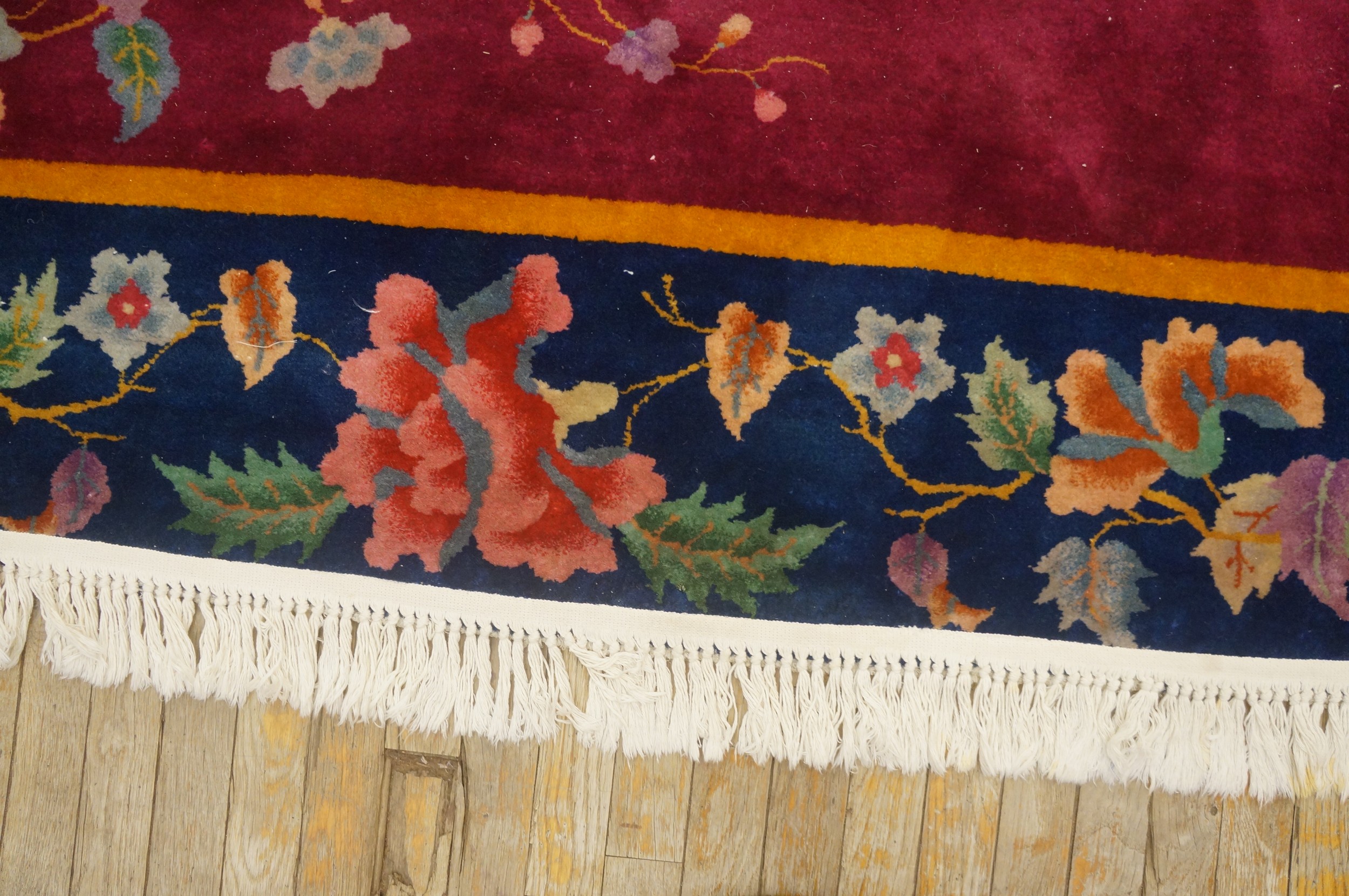 Hand Knotted Pile Coral / Salmon Pink Rectangle Wool 1920s Antique Rug, Circa Date: 1920s. This exceptional wool piece represents the height of early 20th-century Chinese Art Deco design. Its vibrant palette and stylized naturalism make it a superb example of antique rugs from this period, offering a sophisticated blend of Eastern motifs and Western aesthetic sensibilities.