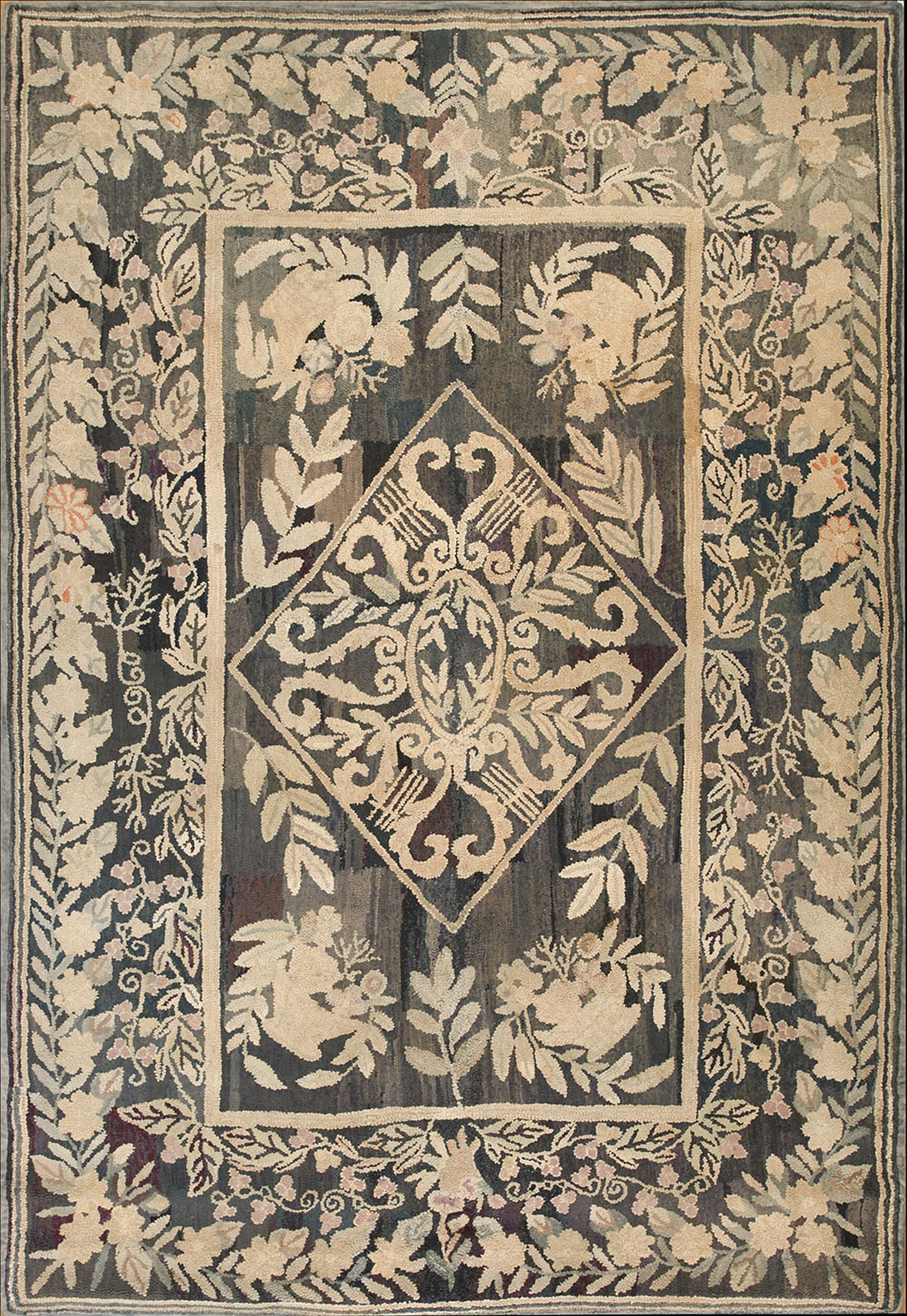 Hand Knotted Pile Floral Medallion Antique Wool American Usa 1930s Rug, Country of Origin: American USA Rugs, Circa Date: 1930s. This exceptional piece of textile history represents the finest output of the period. Its dense, hand-knotted wool pile and sophisticated palette of deep charcoal and cream establish it as a highly desirable antique rug.
