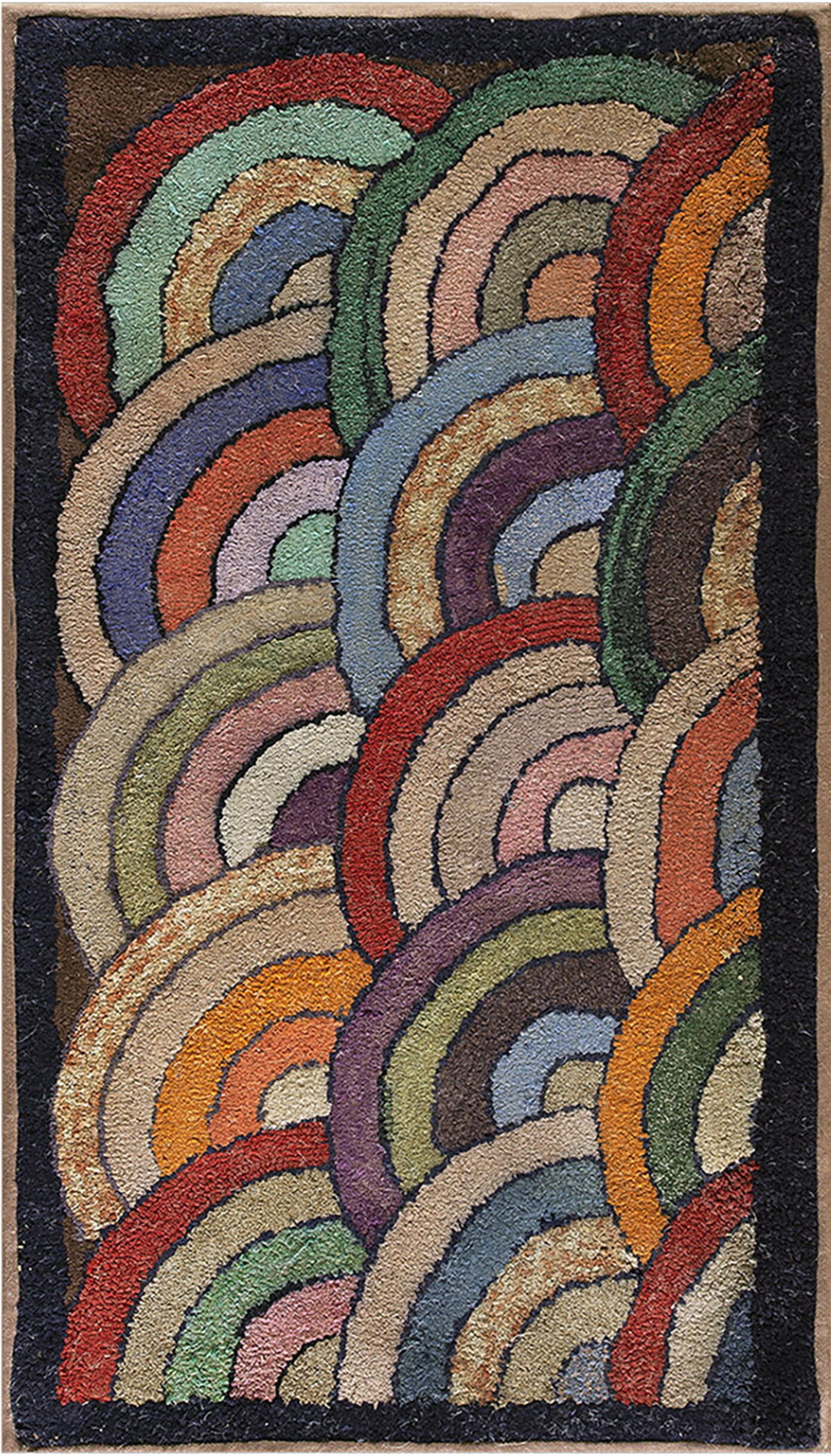 The design moves away from traditional floral or medallion layouts, embracing a bold, abstract composition of interlocking, concentric arches. This dynamic, repeating pattern creates a sense of movement across the field, reflecting the burgeoning Modernist aesthetic of the 1920s. The dense coverage of the field classifies this piece among allover rugs.