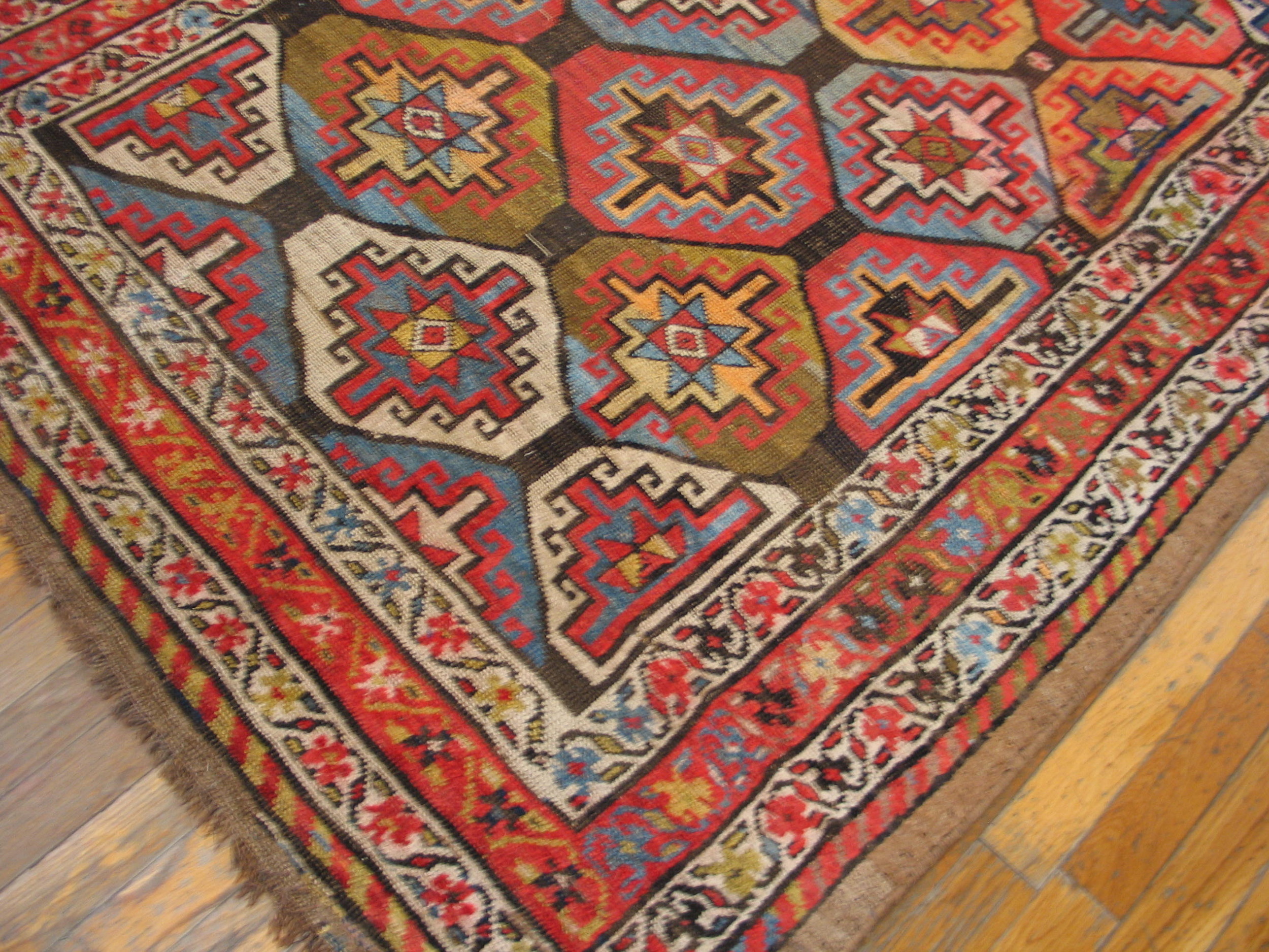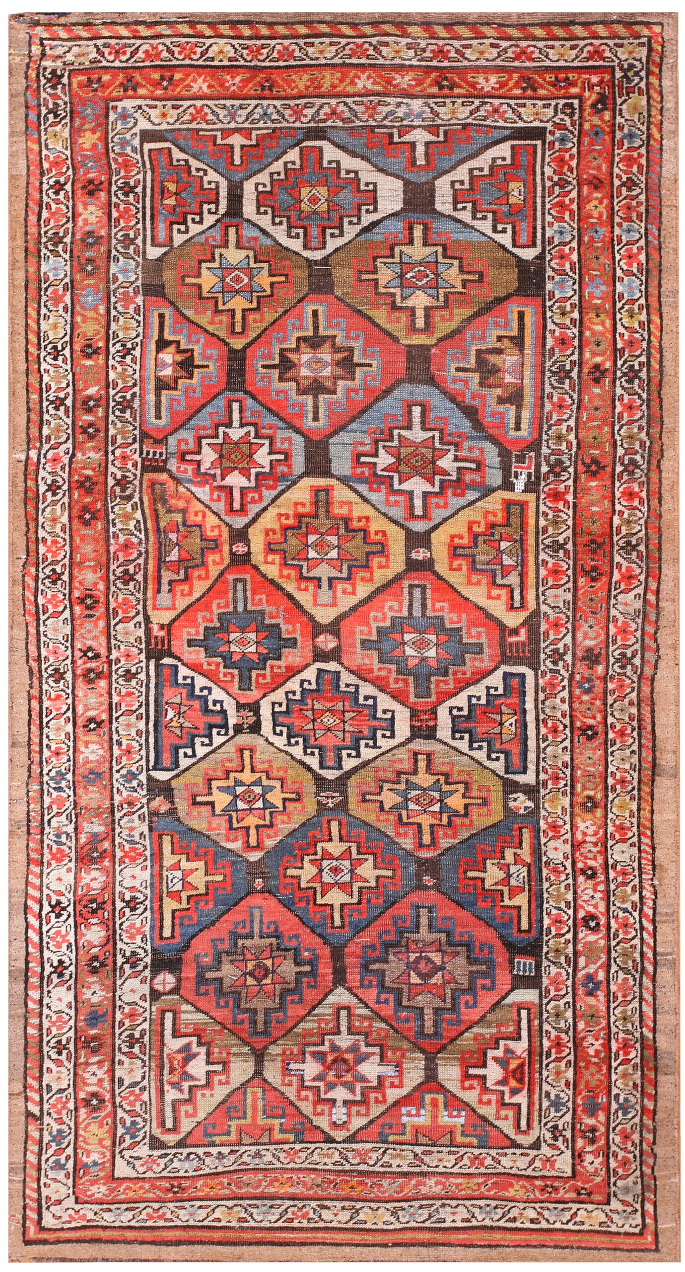 A sophisticated palette anchors the design, utilizing deep indigo, rich madder red, and striking ivory highlights against a foundation of brown earth tone color rugs. The subtle abrasions and patina acquired over more than a century of use contribute to the unique character and authenticity expected of fine antique rugs, offering depth that modern reproductions cannot replicate.