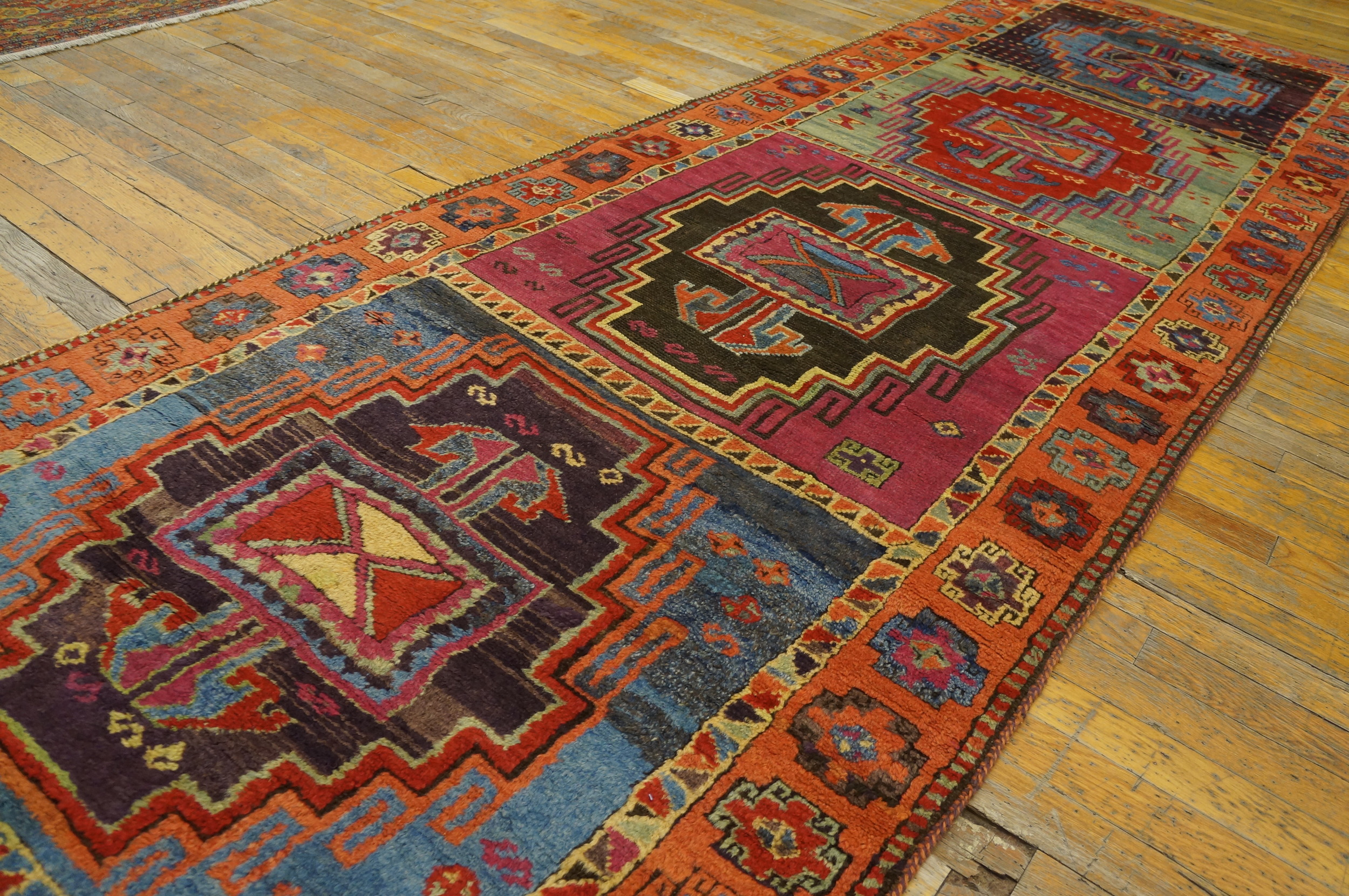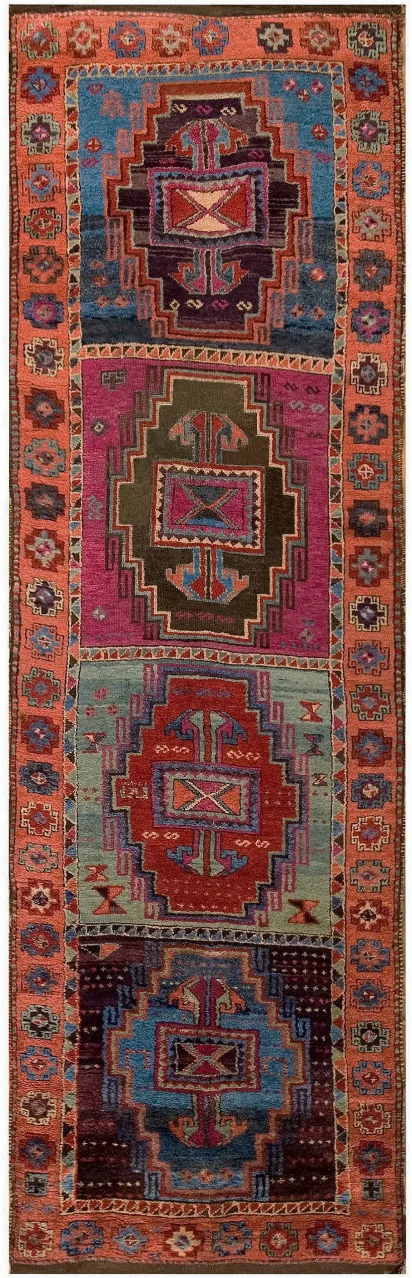 The palette is breathtakingly vivid, showcasing a masterful use of cochineal pinks, deep aubergine, and brilliant sky blues set against a warm terracotta border. The intensity and variety of these natural pigments create a stunning visual impact, classifying this textile among the most desirable multicolor jewel tone rugs from the period.