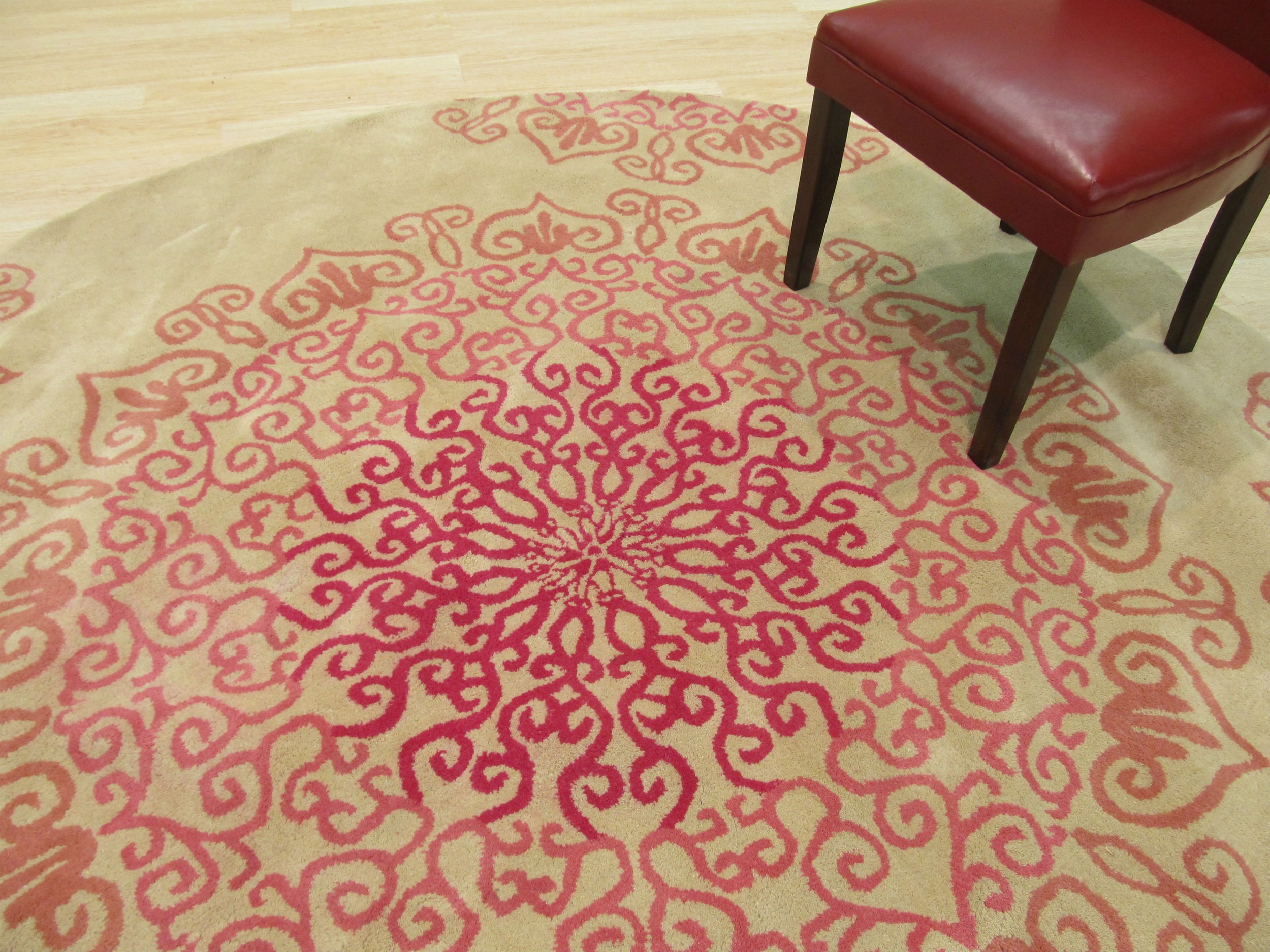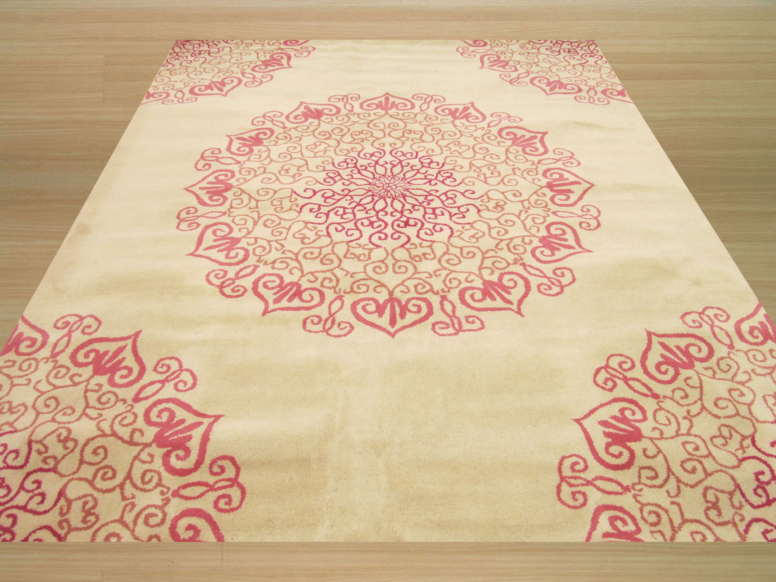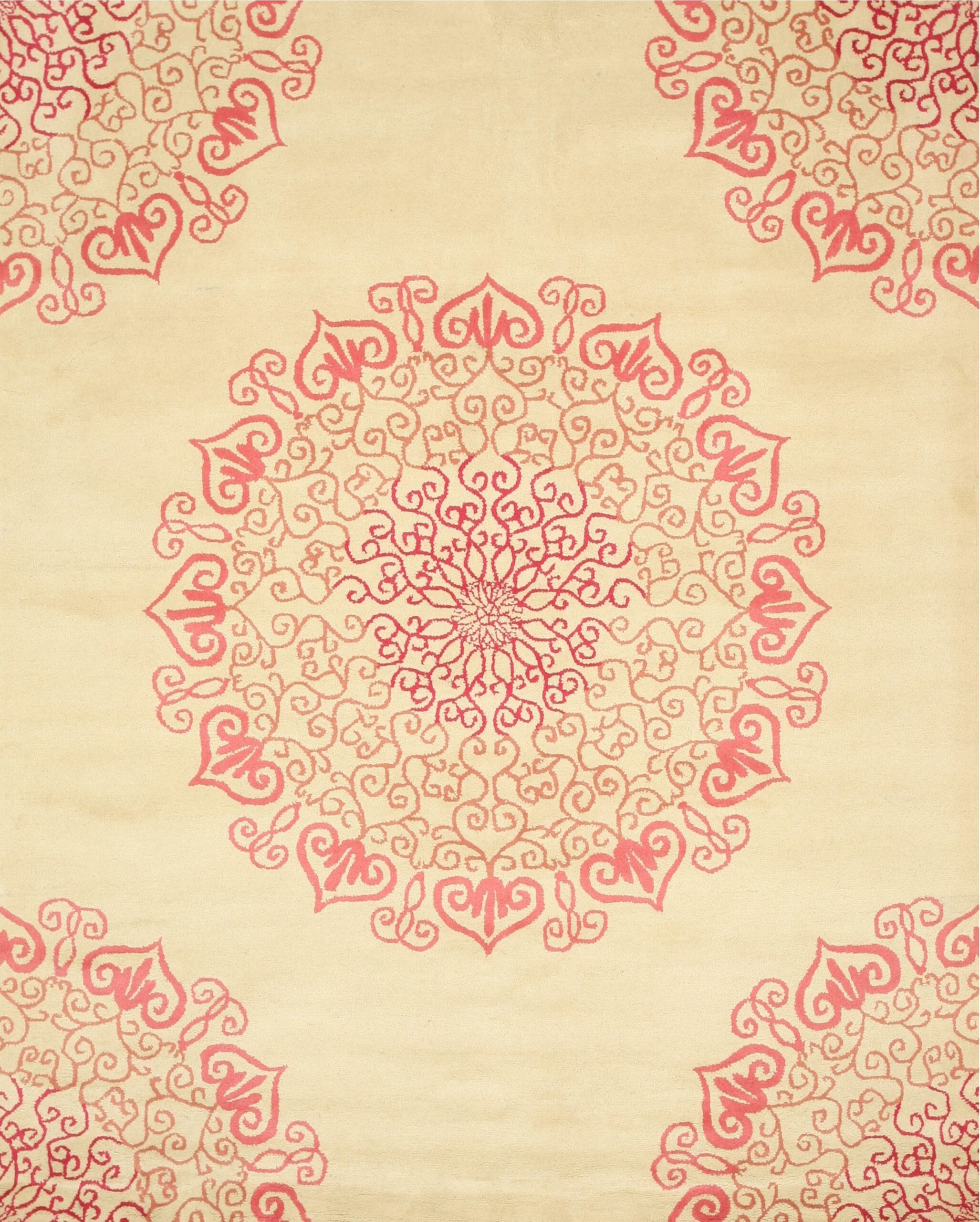 Harlow Nina Red Hand Tufted Wool Rug, Country of Origin: India. This striking piece blends traditional medallion structure with a bold, contemporary aesthetic. Crafted in the tradition of Indian rugs, the design features large, stylized circular motifs set against a neutral, creamy field, offering a fresh take on classic ornamental patterns.