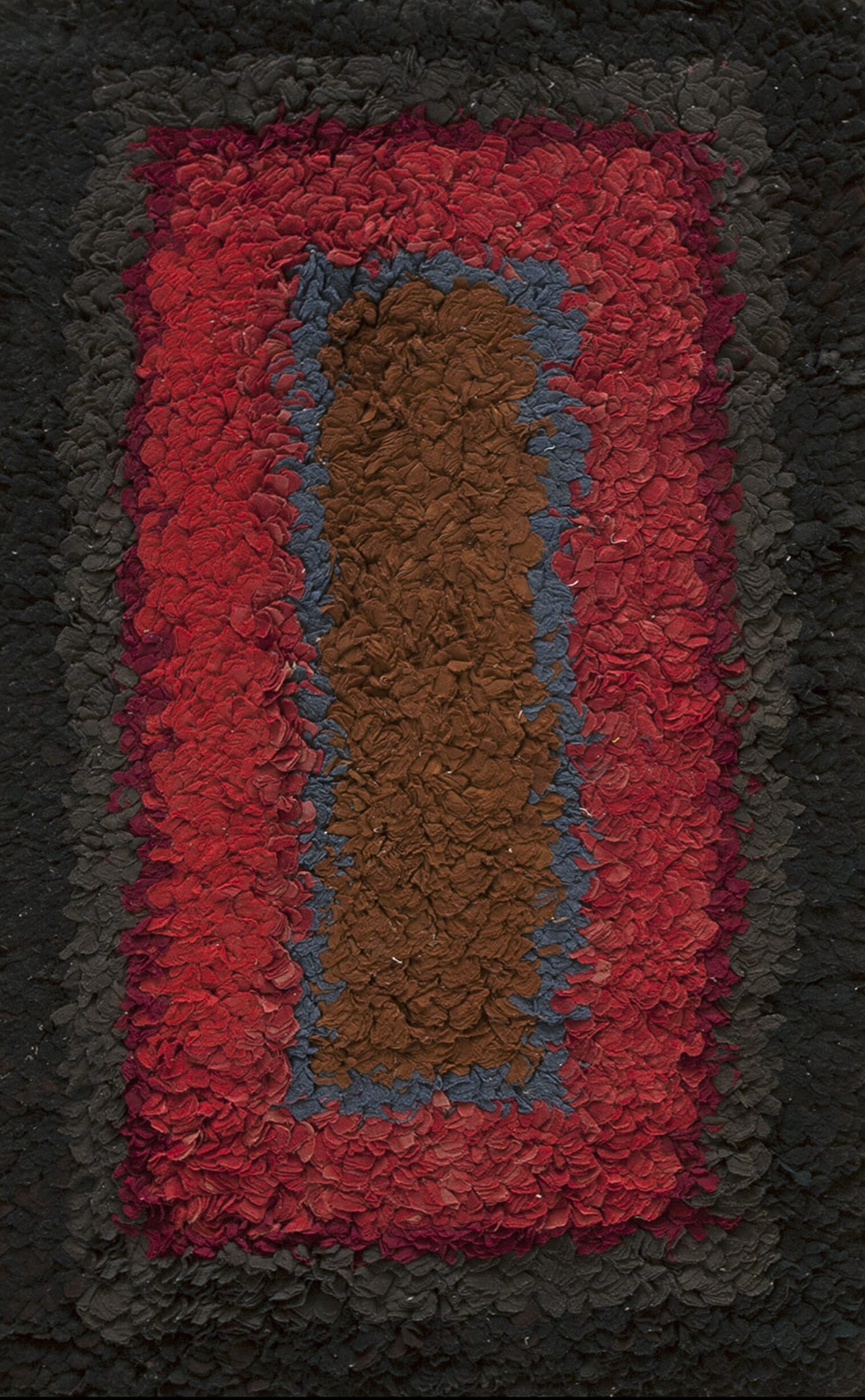Unlike the pictorial scenes often associated with earlier hooked pieces, this composition utilizes a highly abstract, modern structure. The design is based on stacked, vertical rectangular forms, emphasizing pure color fields and strong linear boundaries. This minimalist approach aligns it with the aesthetic principles of geometric rugs, offering a powerful visual anchor despite its modest scale.