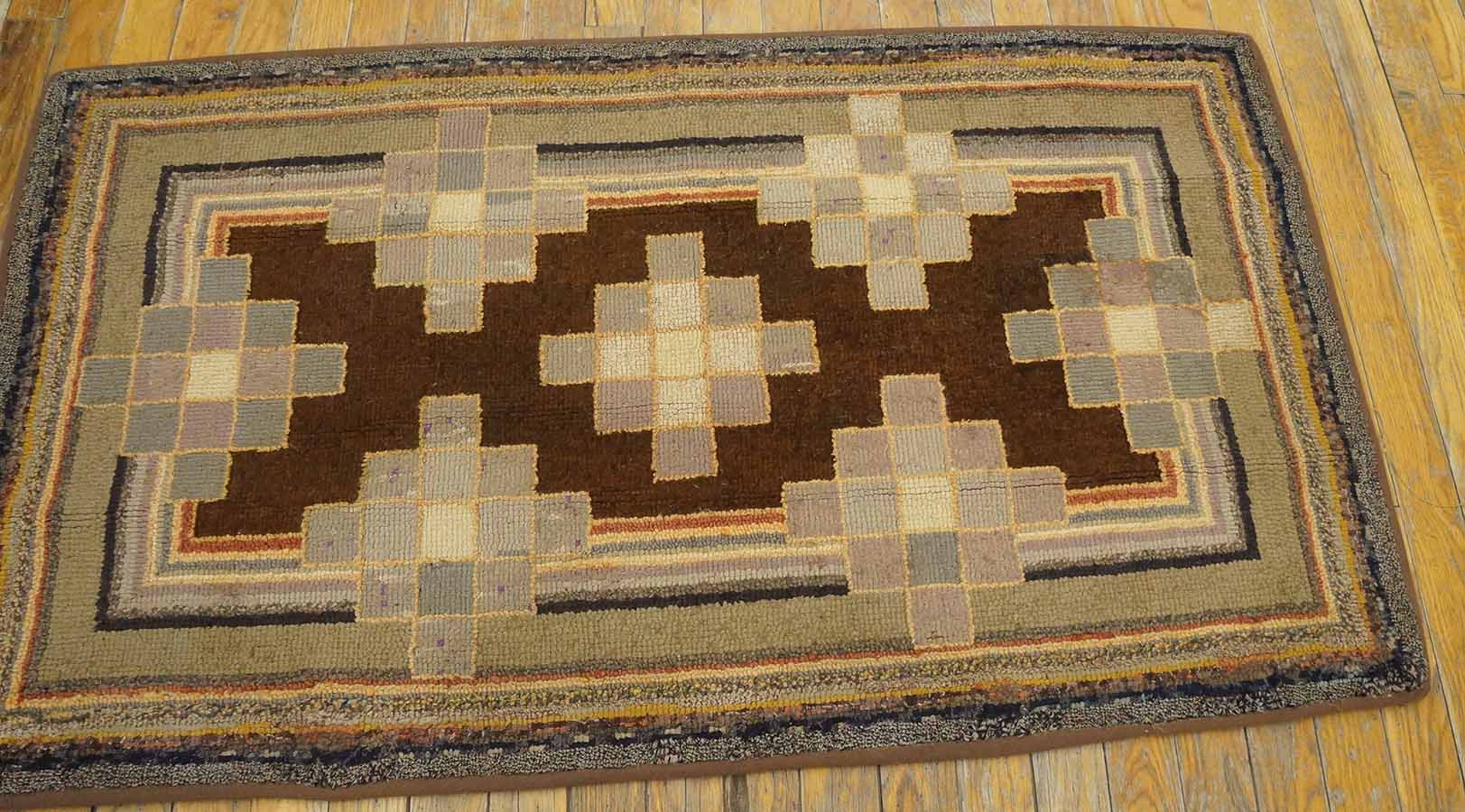 Hooked Wool Antique American 1925 Small Scatter Size Multicolor Rug, Circa Date: 1925. This exceptional example of an American hooked rug captures the creative spirit of early 20th-century folk art. Crafted during the height of the Arts and Crafts movement, this piece offers a robust texture and a highly graphic design, presented in a versatile small scatter size.