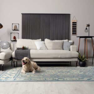 Detailed borders feature repeating stylized floral and arrow motifs rendered in contrasting shades of light and deep cerulean blue against a cream ground. The overall scale and density of the pattern suggest this piece is ideally suited for defining a main living area or dining space, often classified among desirable room size rugs.