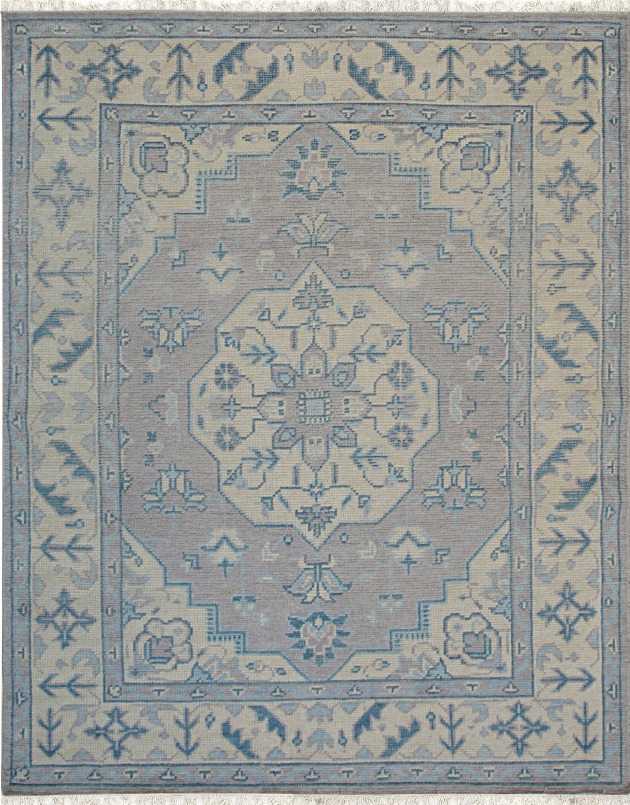 The central field utilizes a muted, dusty gray or lavender hue, providing a calming backdrop for the intricate stepped medallion design. This subtle coloration allows the rug to integrate seamlessly into diverse interior settings, appealing particularly to those seeking gray color rugs that offer depth without overwhelming the visual space.