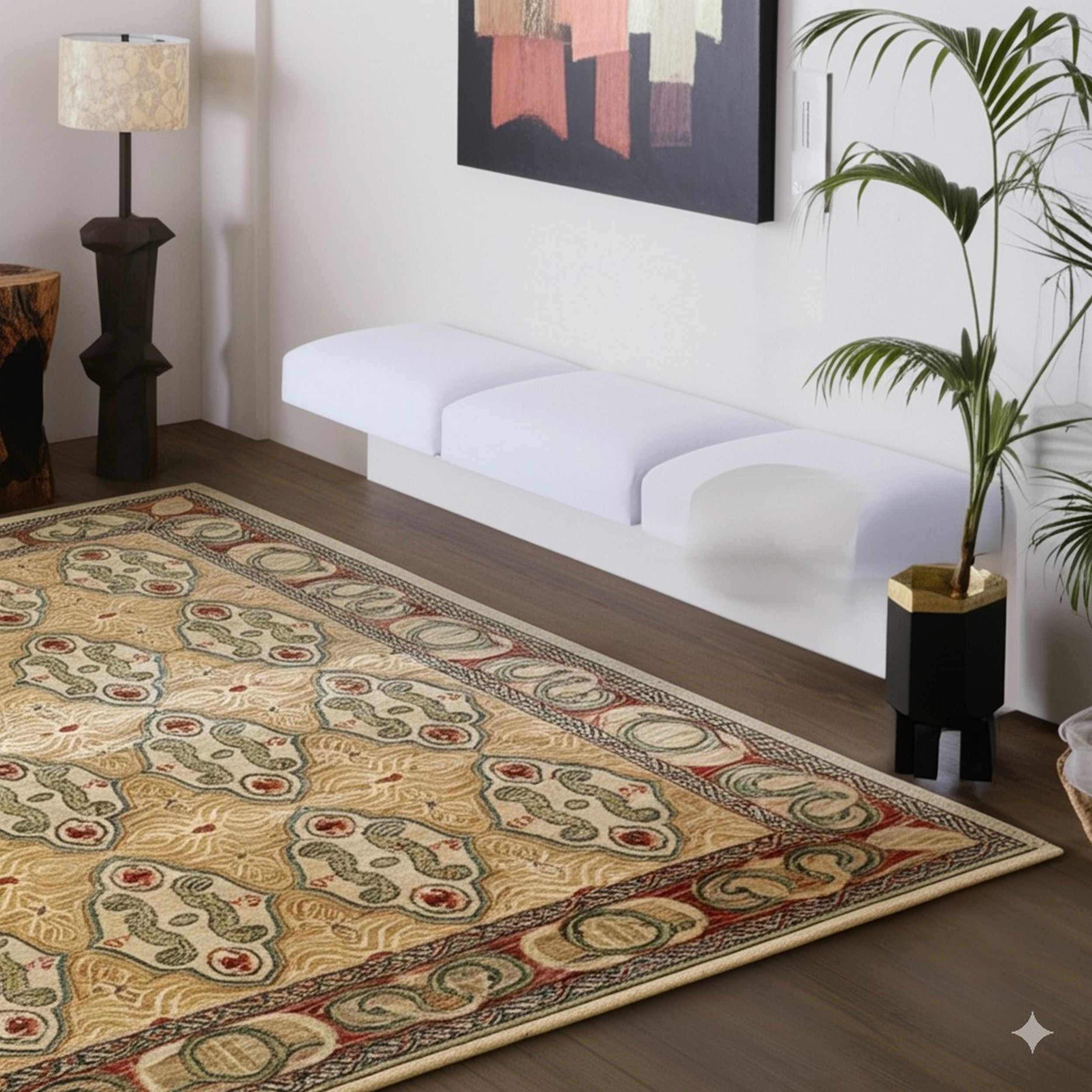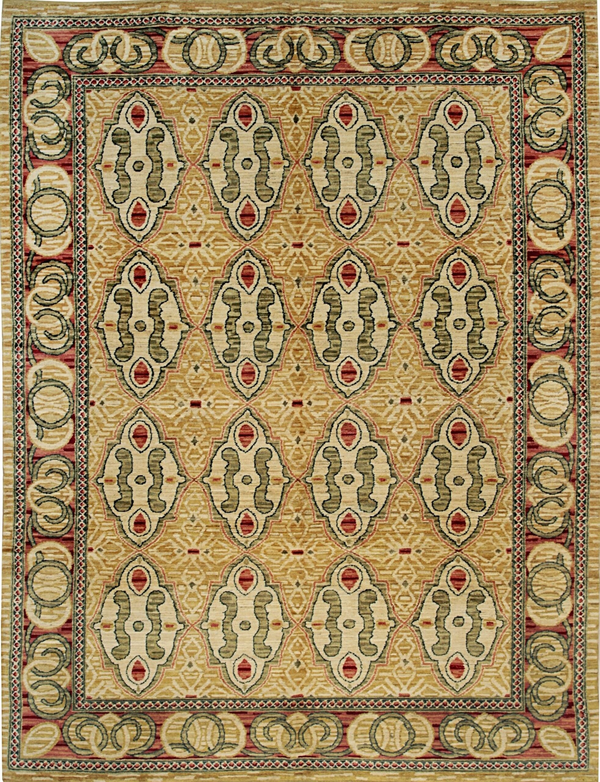 The field features an all-over repeating pattern of stylized ogee medallions, rendered in soft ivory and sage tones against a shimmering gold-beige ground. The careful use of shading and abrash creates depth, while subtle accents of deep rose introduce a sophisticated counterpoint to the dominant beige color palette.