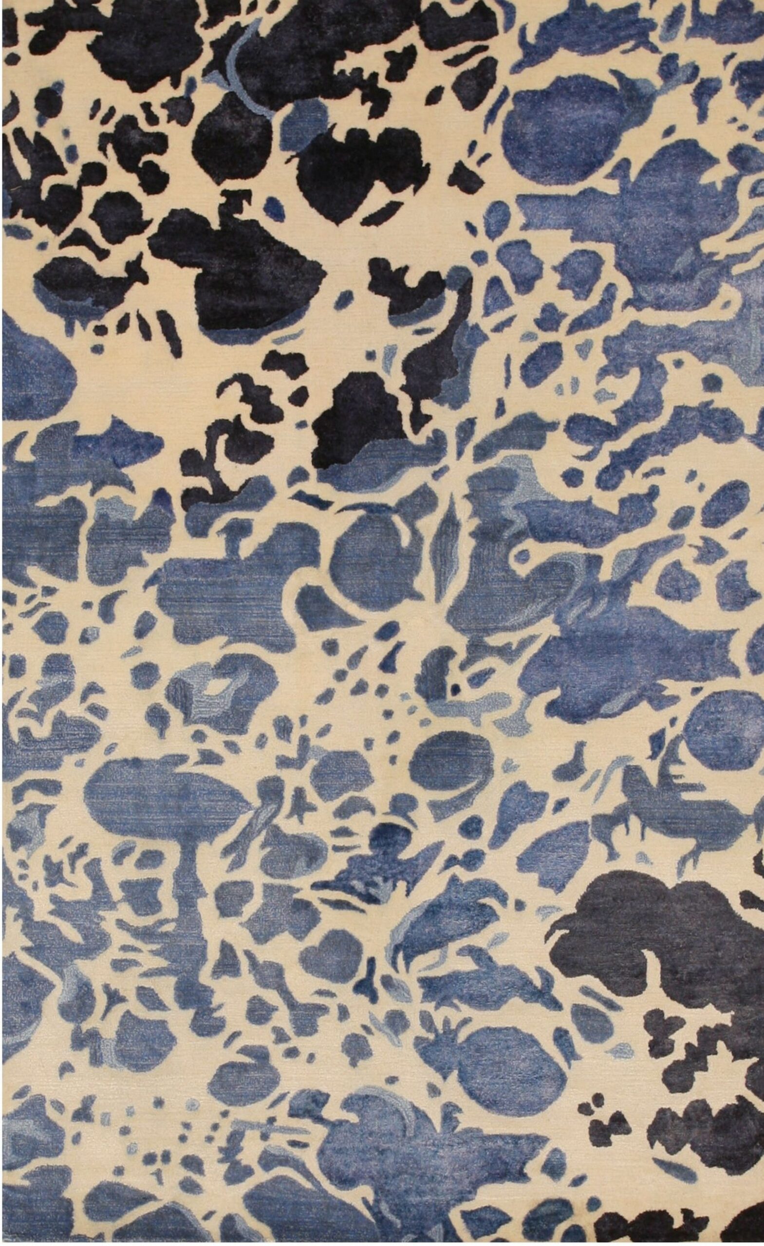 Iris Jasmine Ivory Hand Tufted Wool & Viscose Rug, Country of Origin: India. This striking contemporary piece offers a dynamic, abstract interpretation of organic forms, utilizing a rich interplay of deep indigo and soft ivory tones. The design suggests movement, reminiscent of water or cloud formations, making it a powerful statement piece among new area rugs.