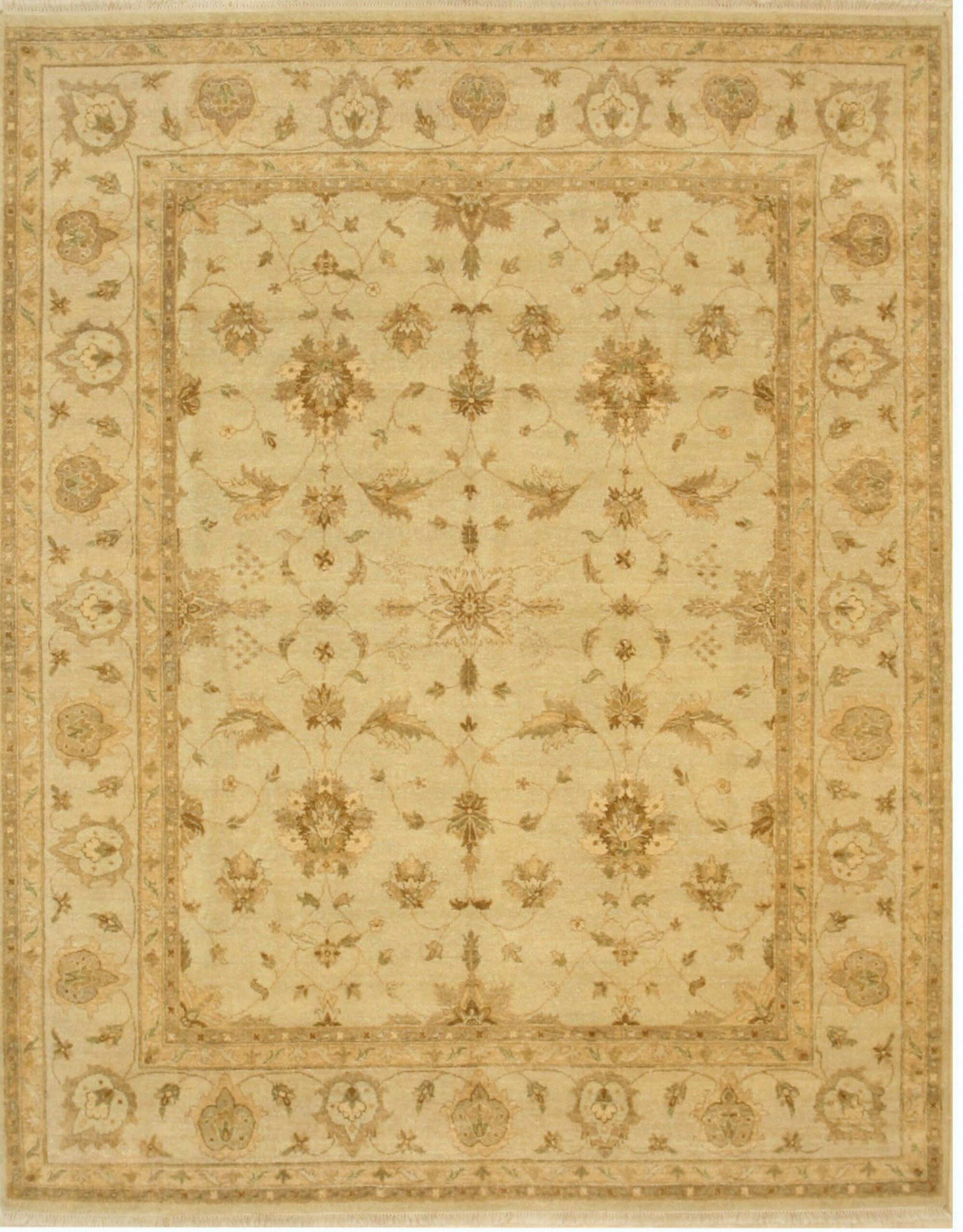 Hand-knotted from premium wool, the texture is soft yet durable, offering a luxurious foundation for any space. The palette is exceptionally versatile, dominated by a warm, luminous field of ivory beige cream that allows the subtle secondary colors—soft taupes, moss greens, and muted browns—to define the intricate vine work without overwhelming the eye.