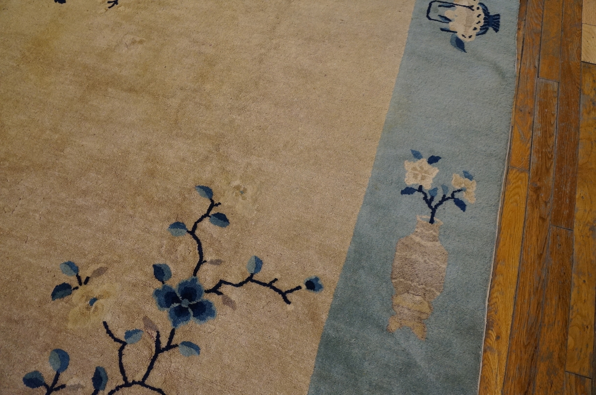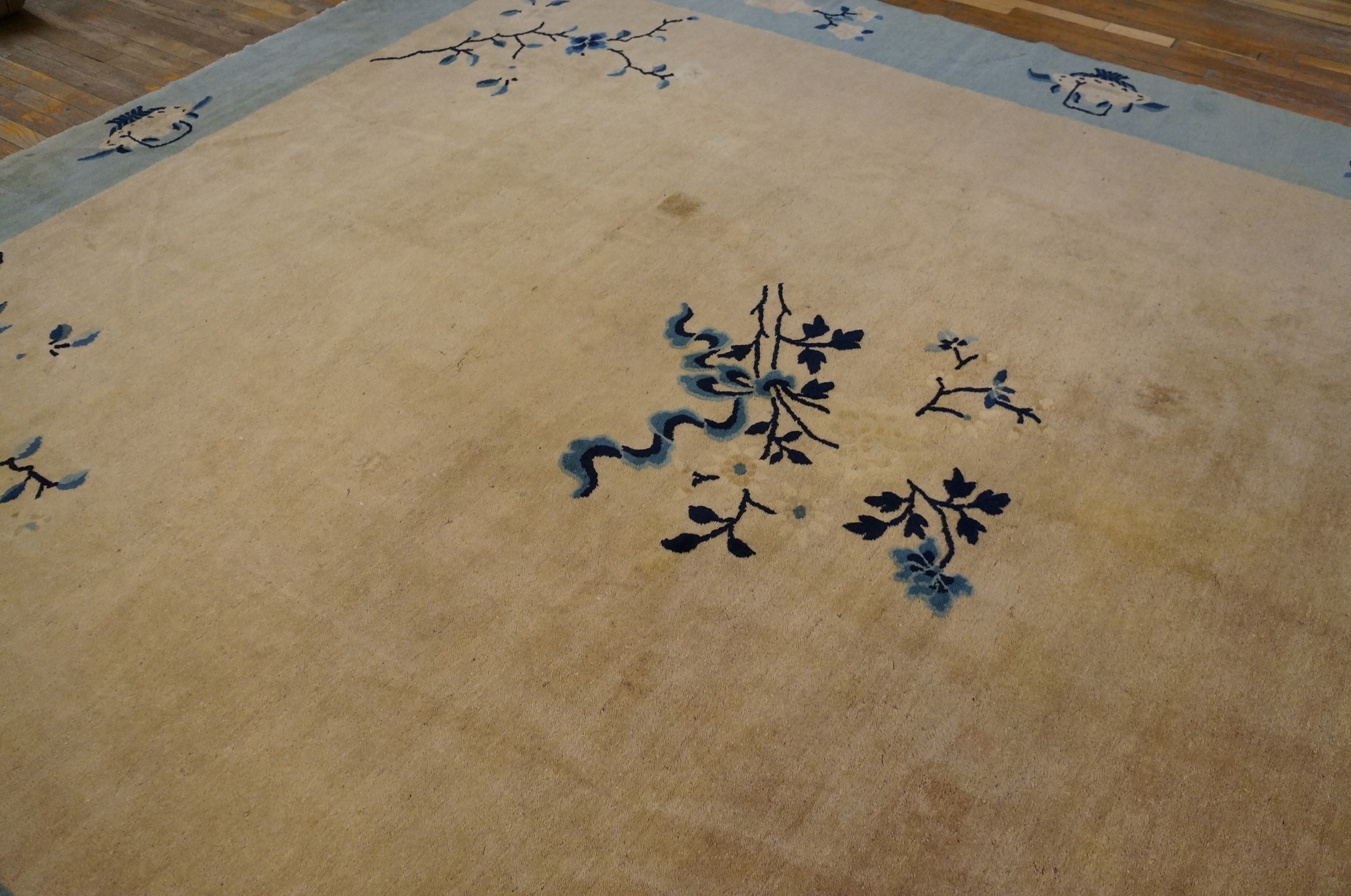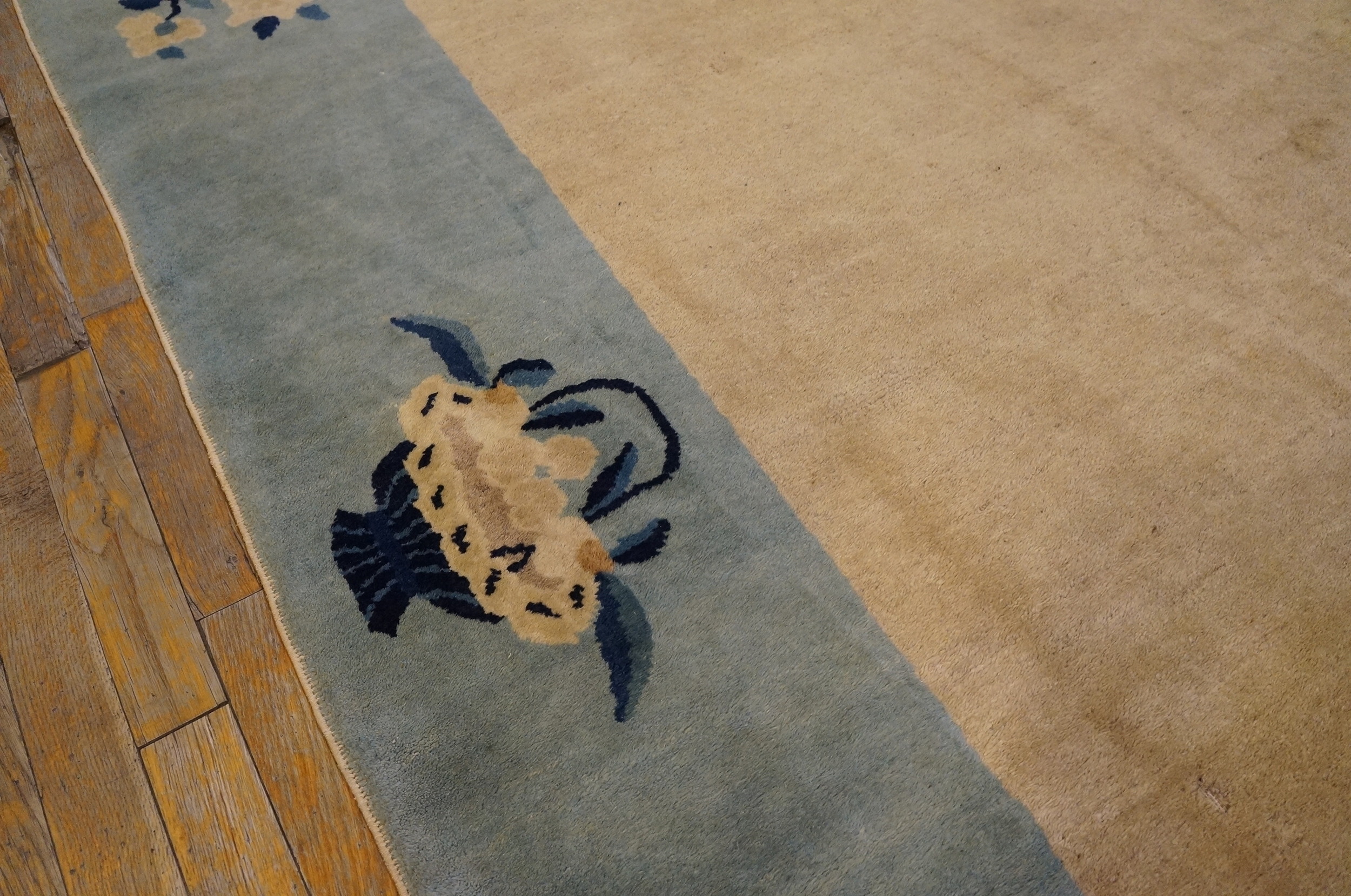 Measuring as a true room size piece, this rug offers substantial coverage suitable for a formal dining area or a spacious living room. Its soft, muted tones and refined Peking knotting technique ensure it integrates seamlessly into both traditional and contemporary interiors, offering enduring sophistication.