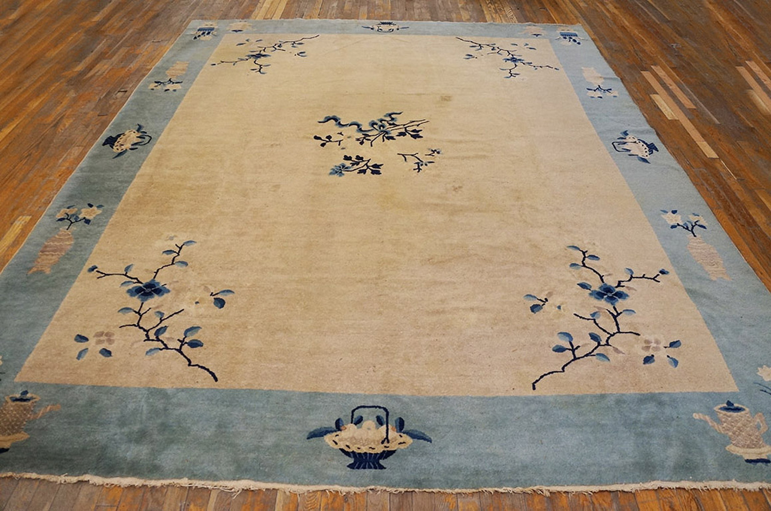 Ivory 1900s Chinese – Peking Knotted Rectangle Antique Wool Room Size Rug, Circa Date: 1900s. This exceptional Peking-style weaving represents the height of early 20th-century Chinese textile art. Woven from high-quality, durable wool, this piece is a superb example of antique wool craftsmanship, characterized by its restrained elegance and subtle color palette.