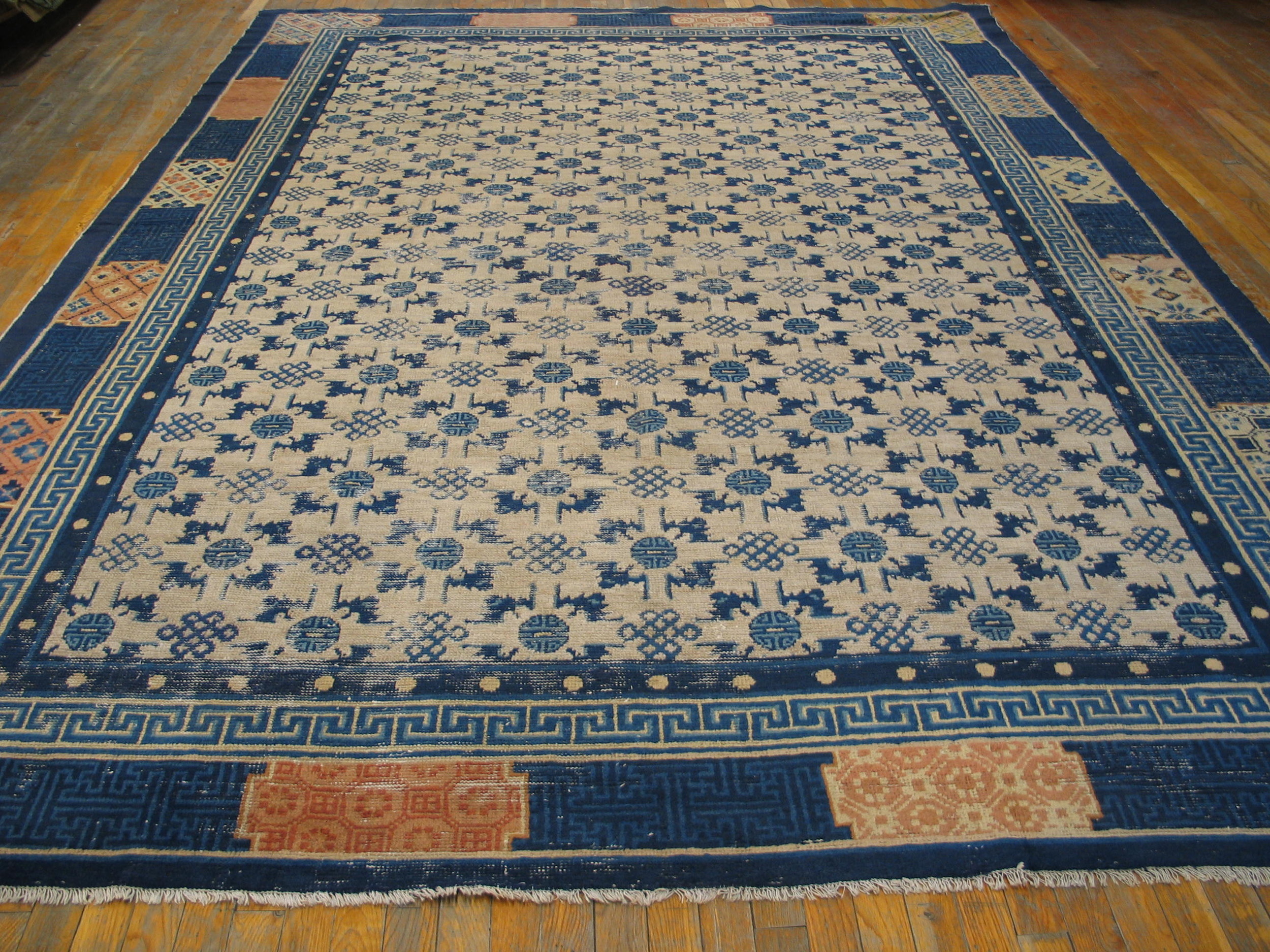 The substantial dimensions of this weaving qualify it as a true room size rug, offering monumental scale suitable for a grand reception area or formal dining space. This Ningxia artifact is not merely floor covering, but a profound statement of history and artistic mastery, preserved beautifully since the Qing Dynasty.