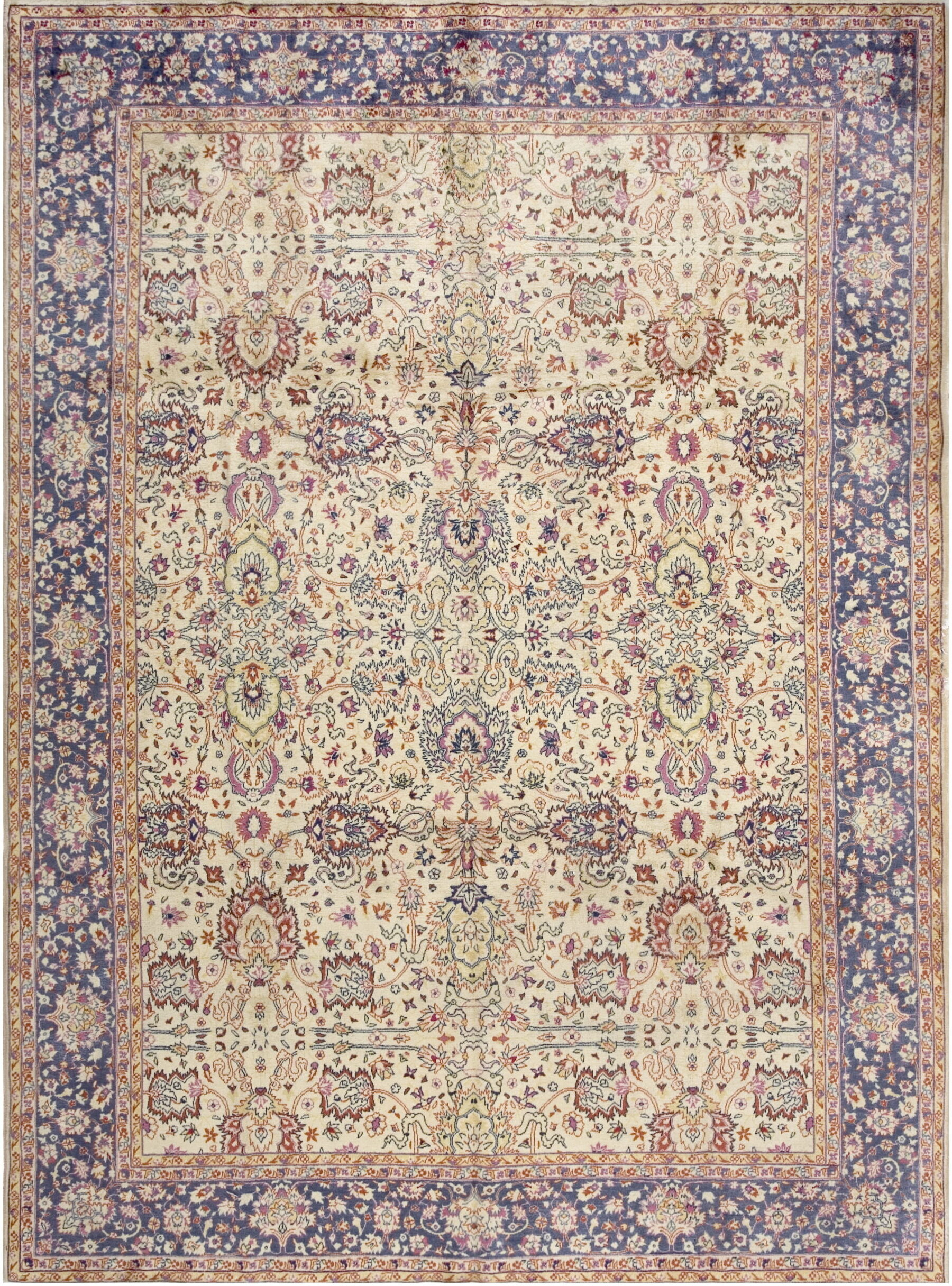 The central field eschews a strong medallion in favor of a sophisticated repeating pattern. This design is characterized by an elegant, symmetrical distribution of intricate palmettes and stylized blossoms, creating a balanced and harmonious aesthetic across the surface. This continuous flow defines it as one of our exceptional allover rugs.