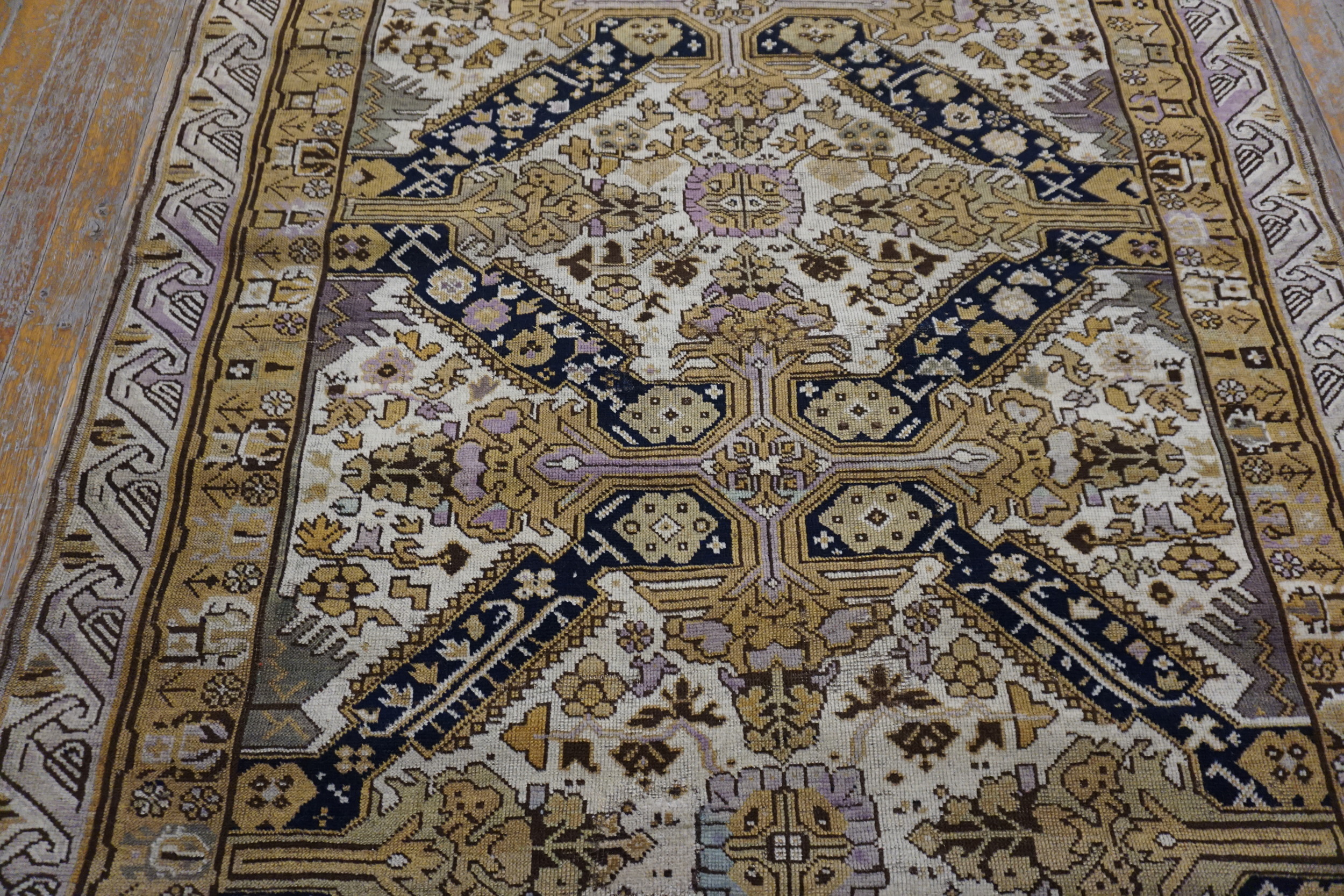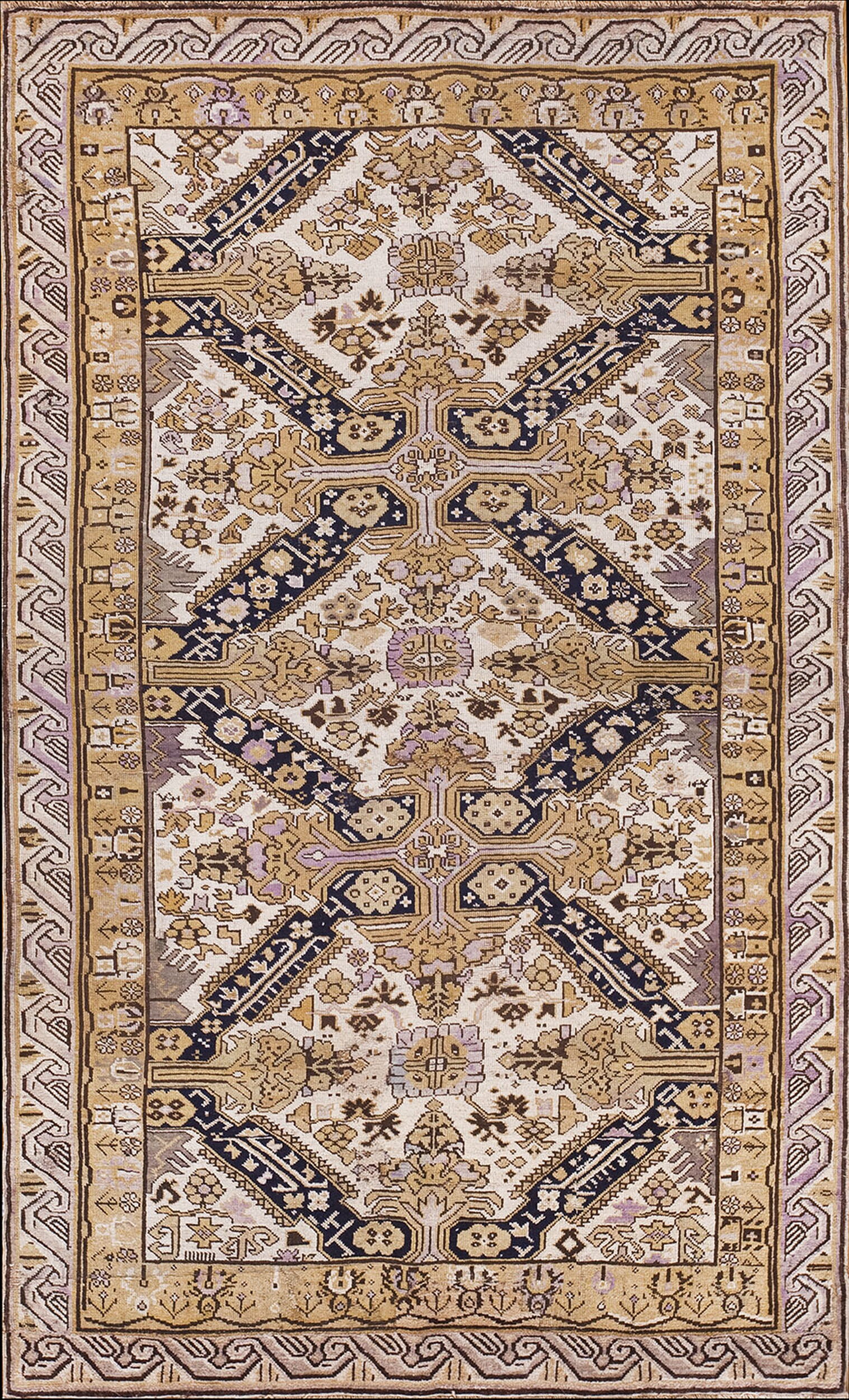 Antique Caucasian – Zeichur Small Scatter Size Wool Ivory Rug, Circa Date: 1930s. This exceptional piece represents the enduring geometric tradition of antique rugs from the Caucasus region. The Zeichur style, known for its finely articulated patterns and robust construction, is evident in the precise execution of the motifs across the field, showcasing the high level of technical skill inherent in early 20th-century weaving.