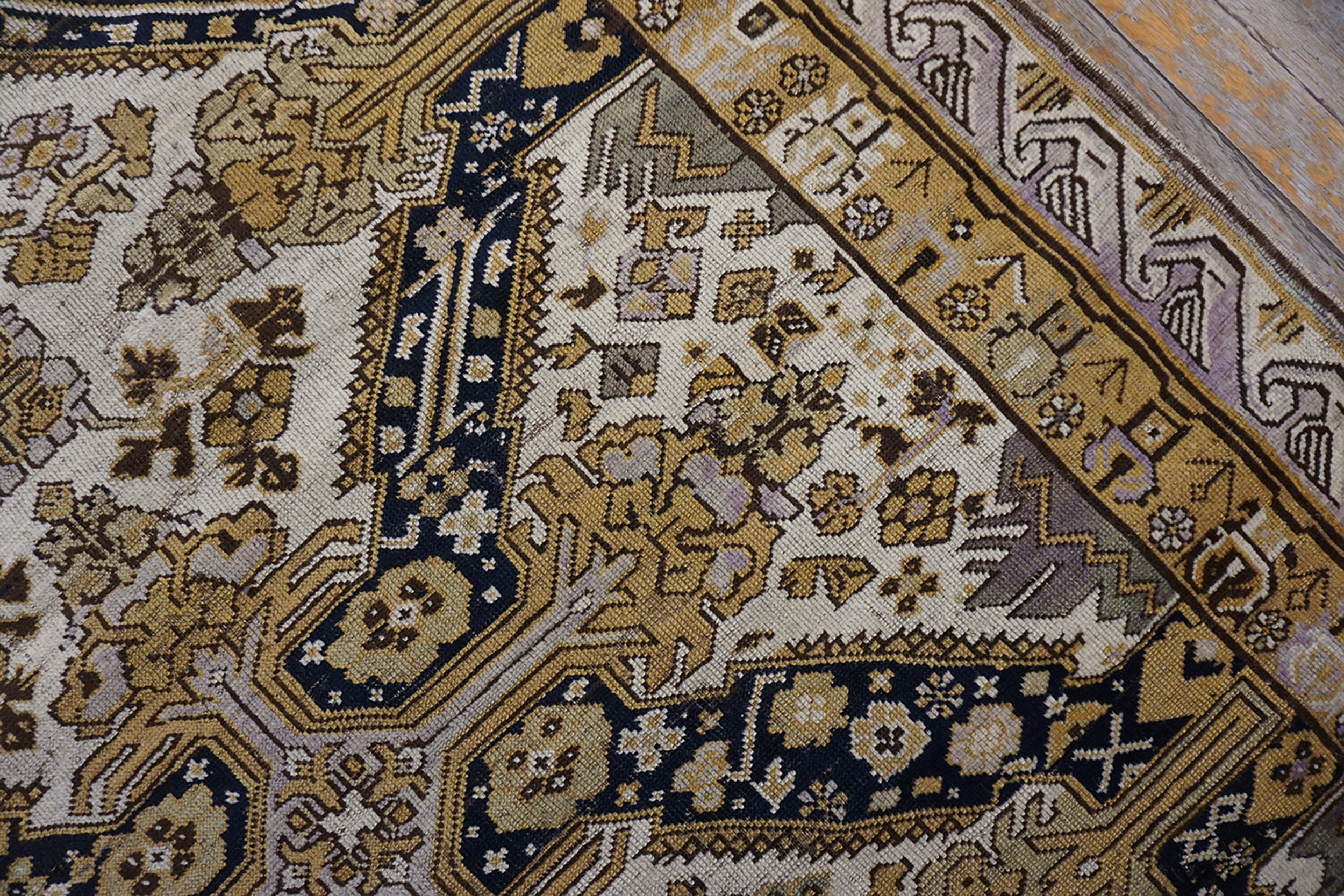 The field is dominated by a luminous, softly aged ground, placing this textile among desirable ivory color rugs. This neutral foundation provides a striking contrast to the secondary palette, which utilizes rich indigo blues, warm saffron yellows, and unexpected touches of soft lavender and brown, hallmarks of the natural dyes employed during this period.