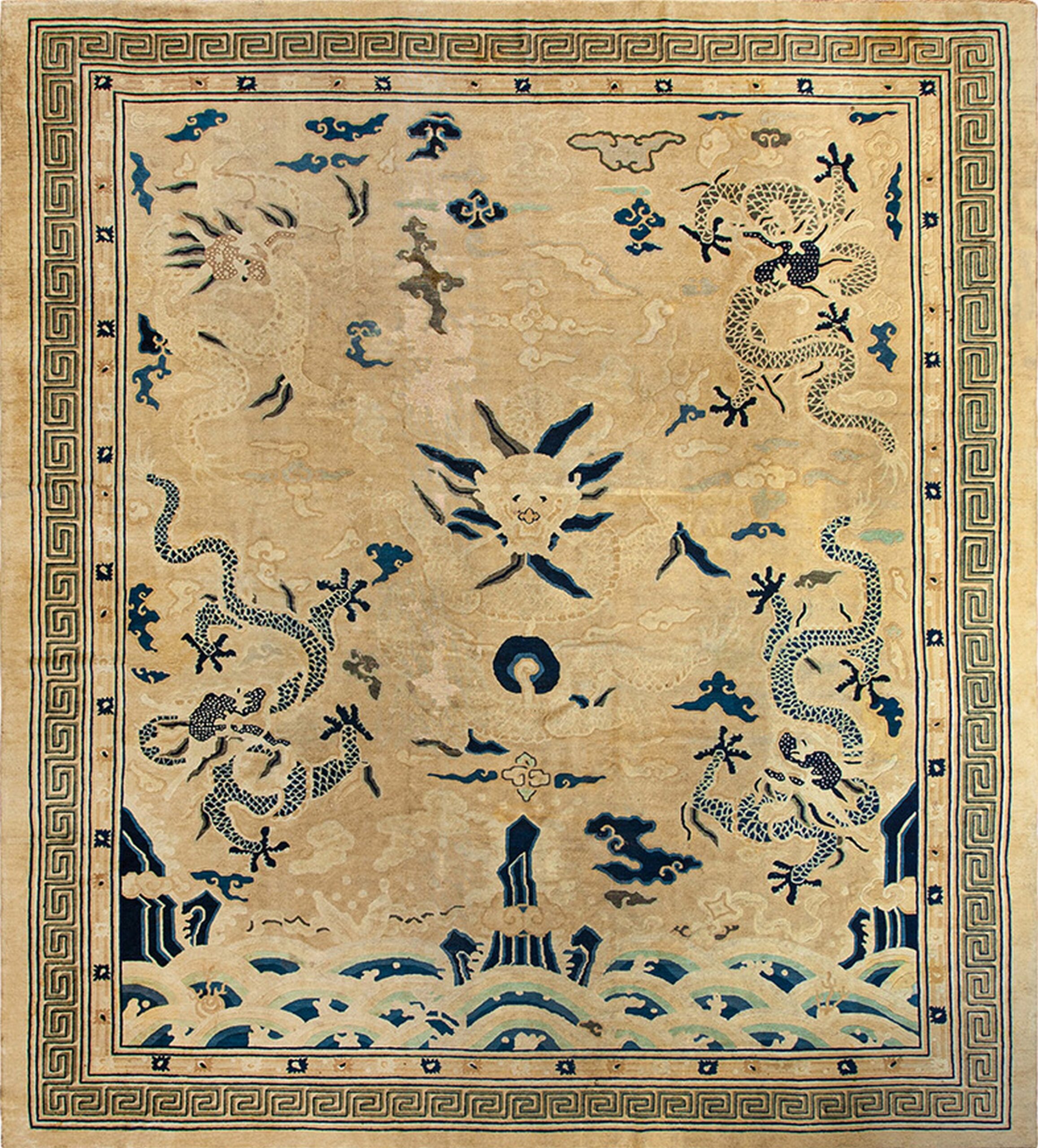 This nineteenth-century Peking carpet from China is a monumental and highly symbolic “Imperial-style” textile, representing the height of the Qing Dynasty’s aesthetic influence on the Beijing workshops. While many Peking rugs are known for their floral or scholar-taste designs, this square-shape room-size specimen is a significantly rarer find, featuring the powerful and ancient iconographies of the Dragon and the Cloud Band.