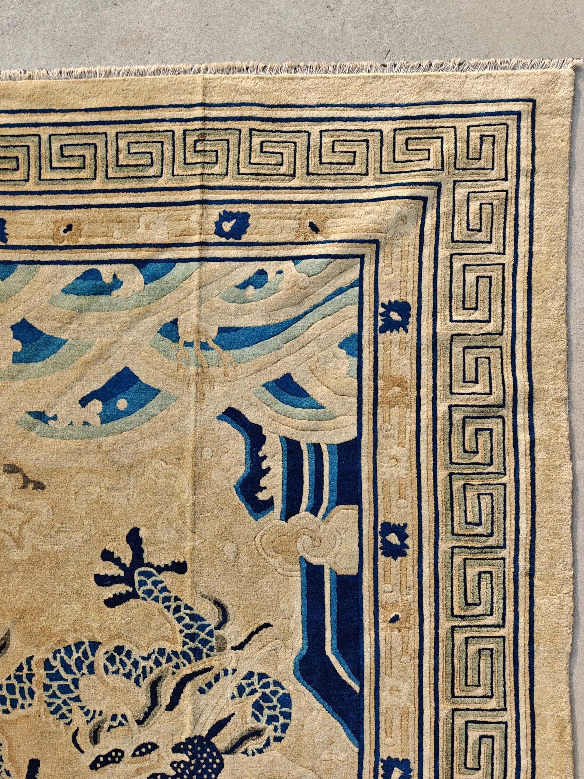 Technically, the antique Chinese Peking carpets are prized for having lush, high-grade wool pile and substantial, “meaty” handle. The wool used in these urban workshops was sourced from high-altitude sheep and was exceptionally rich in natural lanolin, resulting in a velvety surface with a subtle, healthy sheen. A defining characteristic of this era is the hand-carving or “embossing” technique, where the weaver hand-clipped the wool around the dragon and clouds to create a sculptural depth, making the celestial figures appear to float above the ivory field.