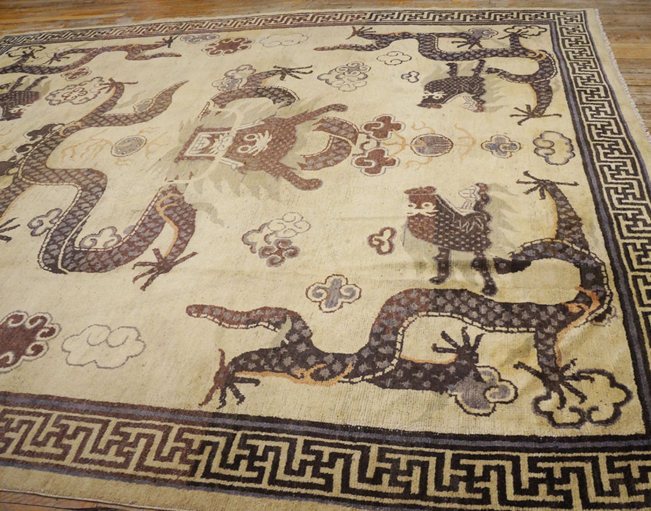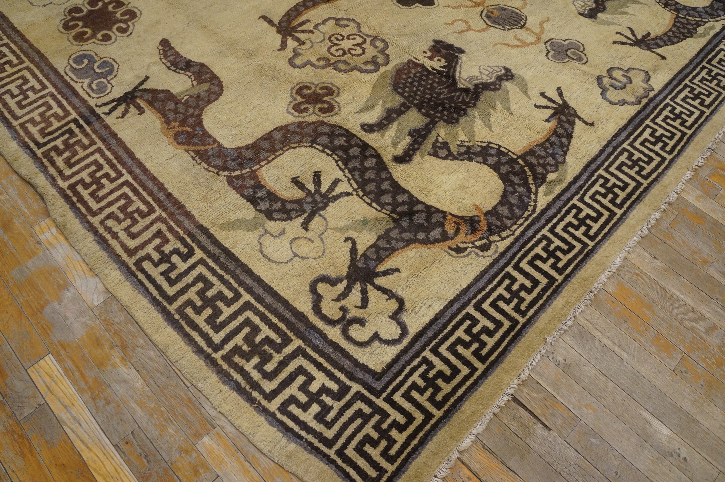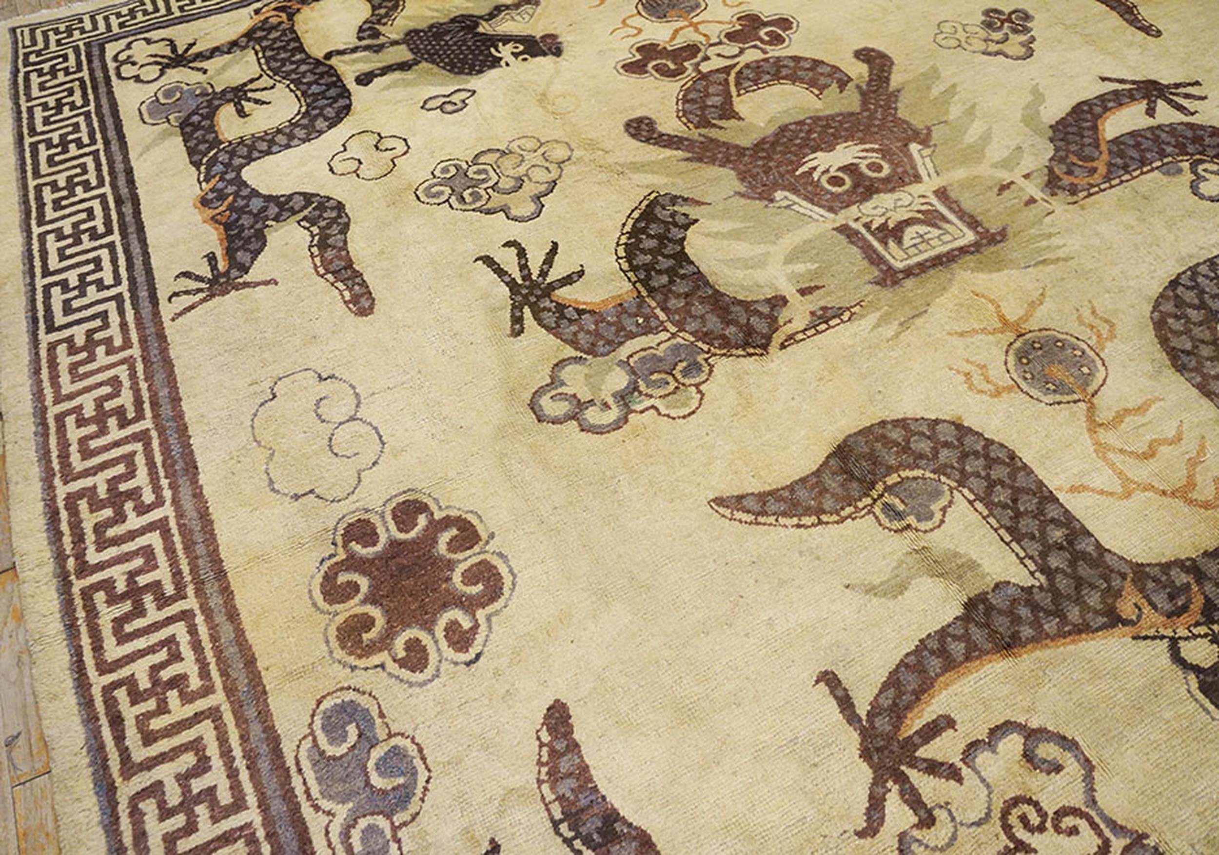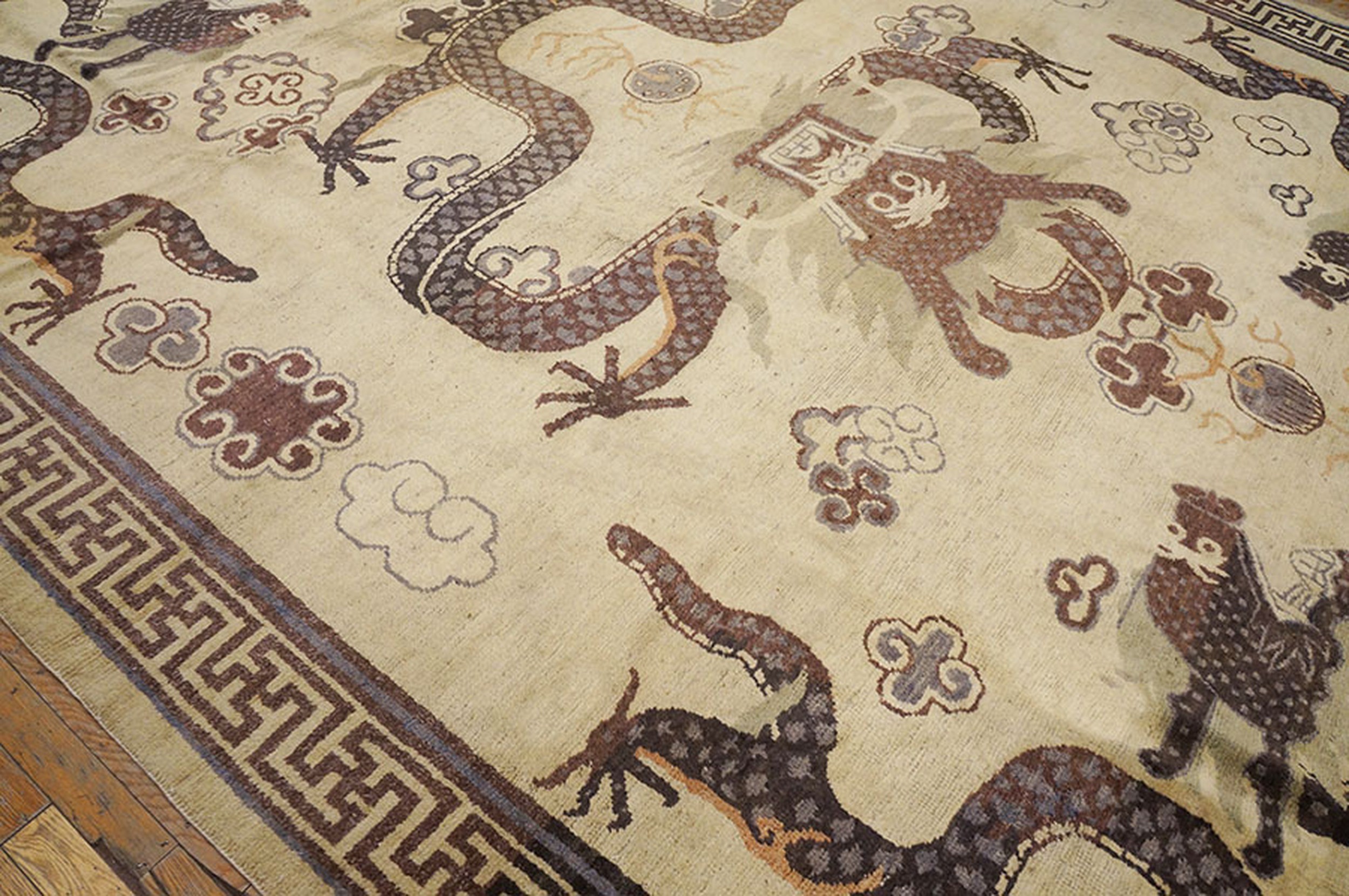 This magnificent room-sized antique Chinese carpet, dating from the late nineteenth century, is a superlative example of Mongolian-influenced weaving, a style that represents the powerful intersection of Buddhist cosmology and imperial Chinese artistry. Historically, rugs from the Mongolian border regions (often classified as Ningxia or Suiyuan) were distinct from the floral-heavy designs of the coastal cities, instead favoring a bold, symbolic language that reflected the spiritual and nomadic heritage of the northern steppes. This specific specimen features a luminous ivory field—a choice that was exceptionally rare and prestigious, as it provided a “sacred canvas” for the most potent of all Asian motifs: the Imperial Dragon.