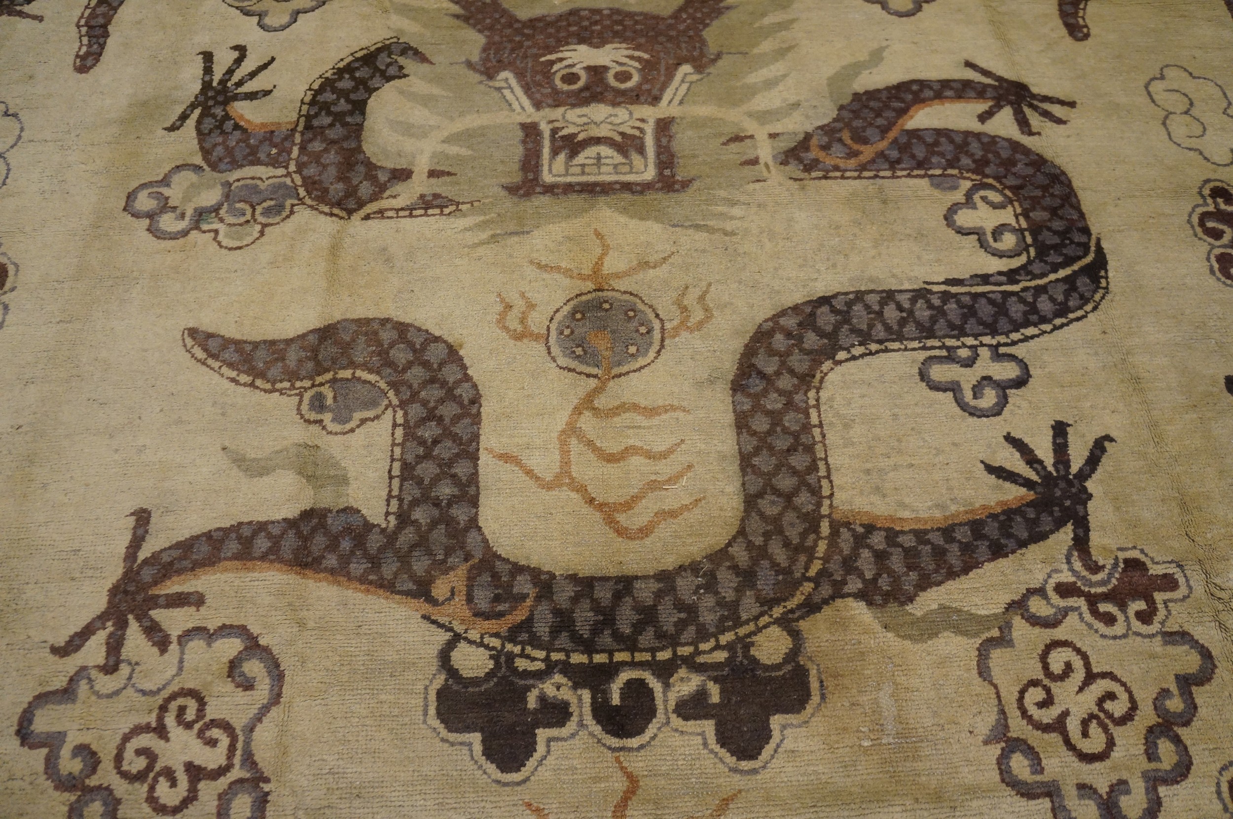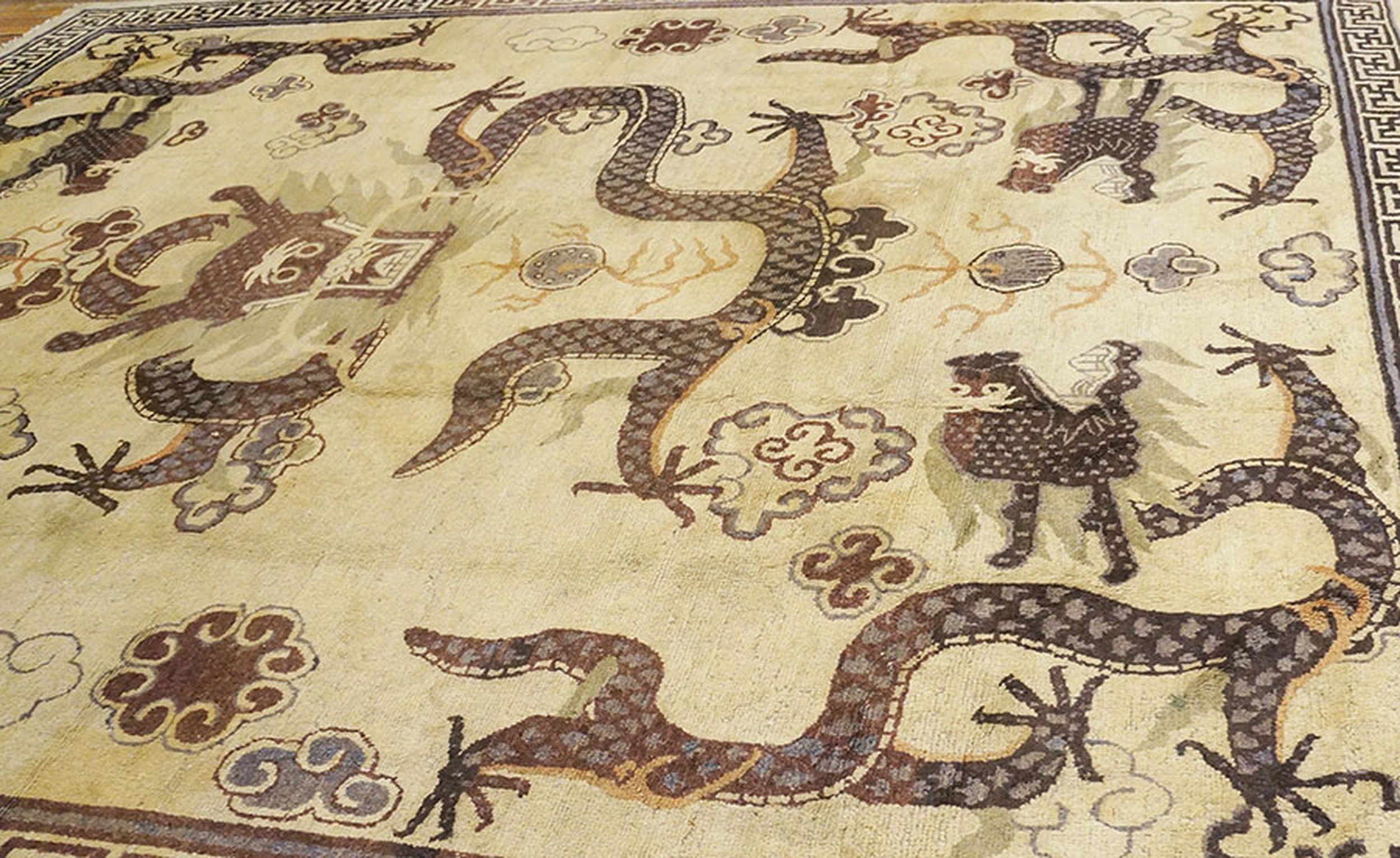 The composition is dominated by the rhythmic interplay of five-clawed dragons designs amidst a field of stylized clouds and “pearls of wisdom.” In Chinese mythology, the dragon is not a creature of terror but a celestial guardian of water, weather, and imperial authority. The “room-size” scale of this piece is particularly significant; most Mongolian rugs were produced as smaller “pillar rugs” or meditation mats, making an oversized ivory carpet like this a likely commission for a high-ranking monastery or a noble residence. The dragons are rendered in a “primitive-sophisticated” style, where the raw power of the tribal line meets the disciplined iconography of the Qing Dynasty court. The ivory ground serves to amplify the tonal depth of the dragons, which were often dyed with mineral pigments and local mountain plants to achieve a palette of earthy ochres and indigoes.