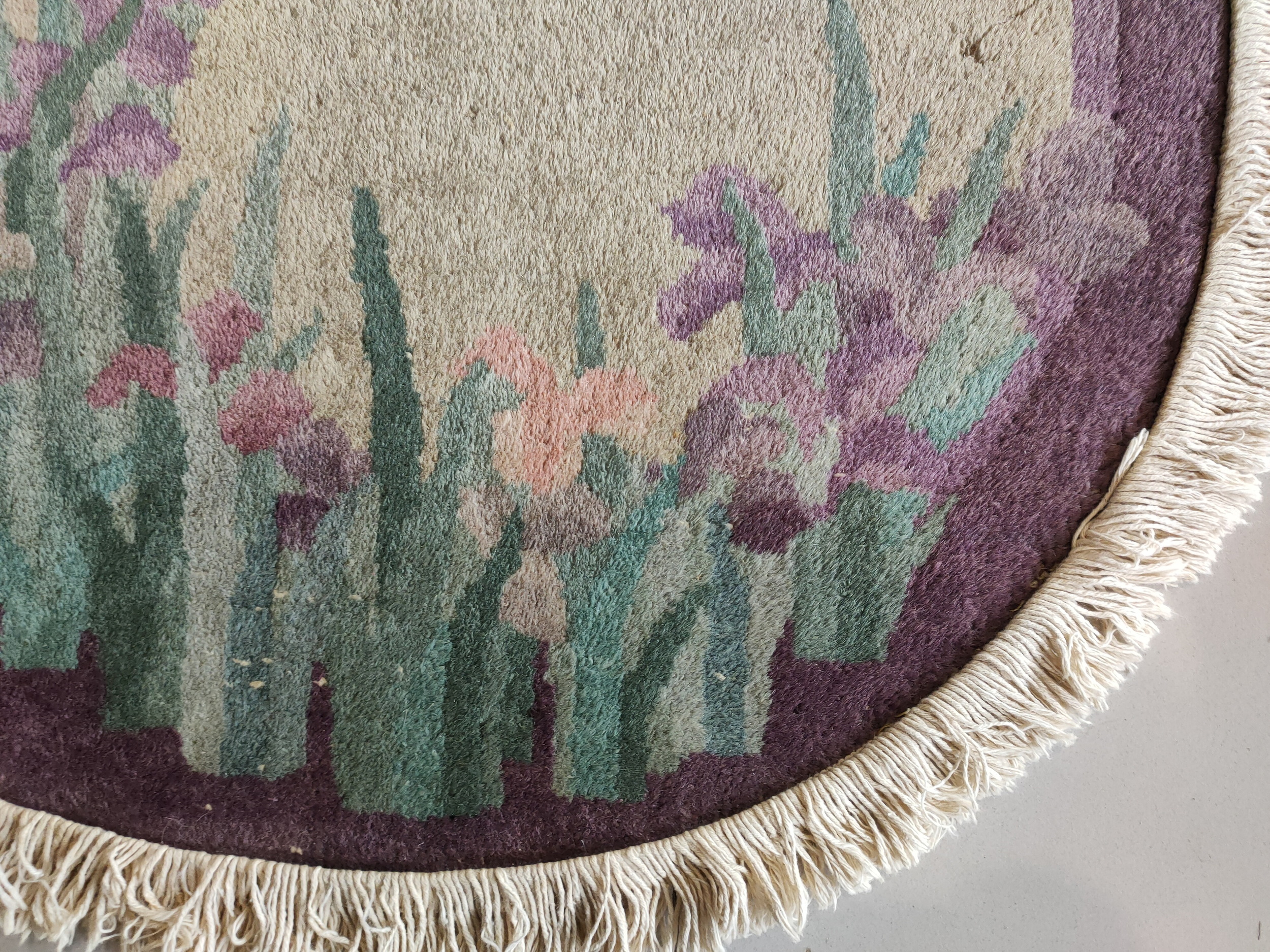 Antique Chinese Chinese – Art Deco Ivory 1920s Rug, Circa Date: 1920s. This exceptional oval Art Deco carpet represents the pinnacle of early 20th-century Chinese weaving, combining traditional craftsmanship with the streamlined aesthetics of the Jazz Age. Its unusual shape and sophisticated color palette distinguish it among antique rugs of the period.