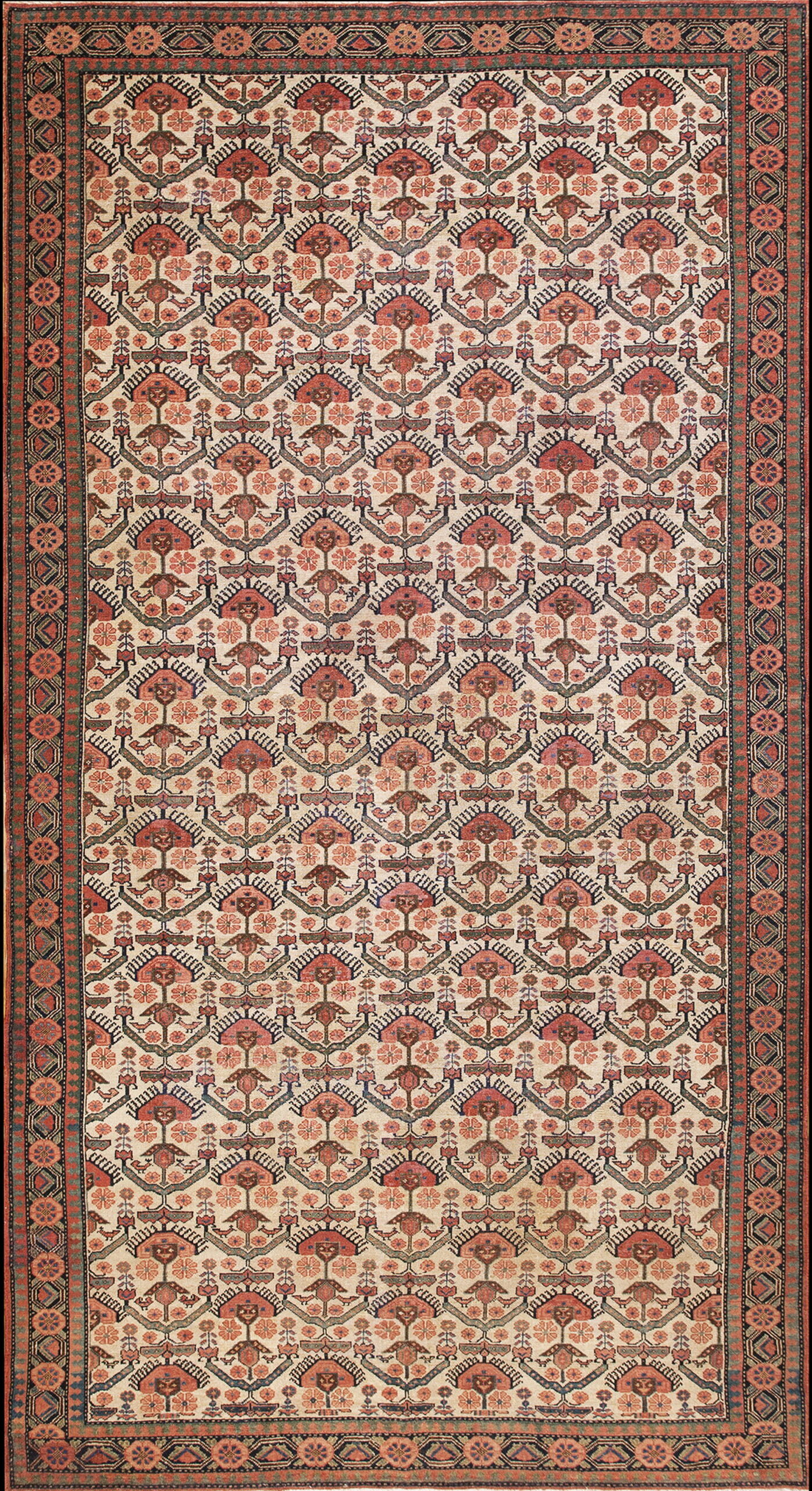 The field features a striking, finely knotted repeating pattern set against a luminous ivory color ground. This light foundation allows the secondary colors—rich terracotta, soft salmon, and deep indigo accents—to achieve maximum clarity and visual depth. Such masterful use of negative space elevates this piece beyond typical provincial production.