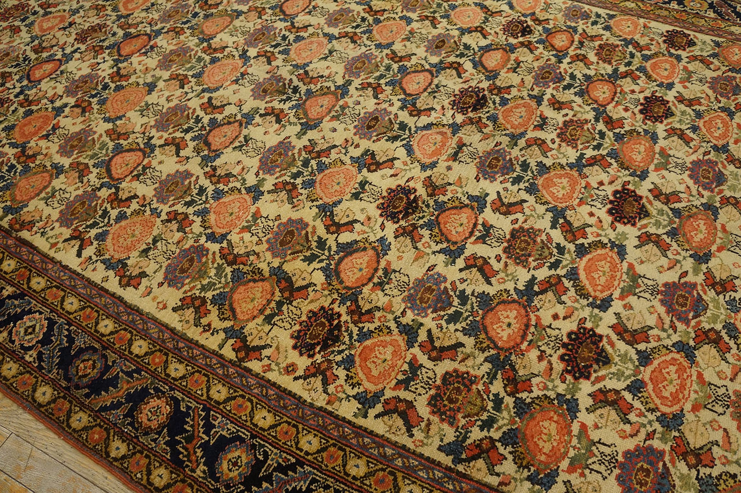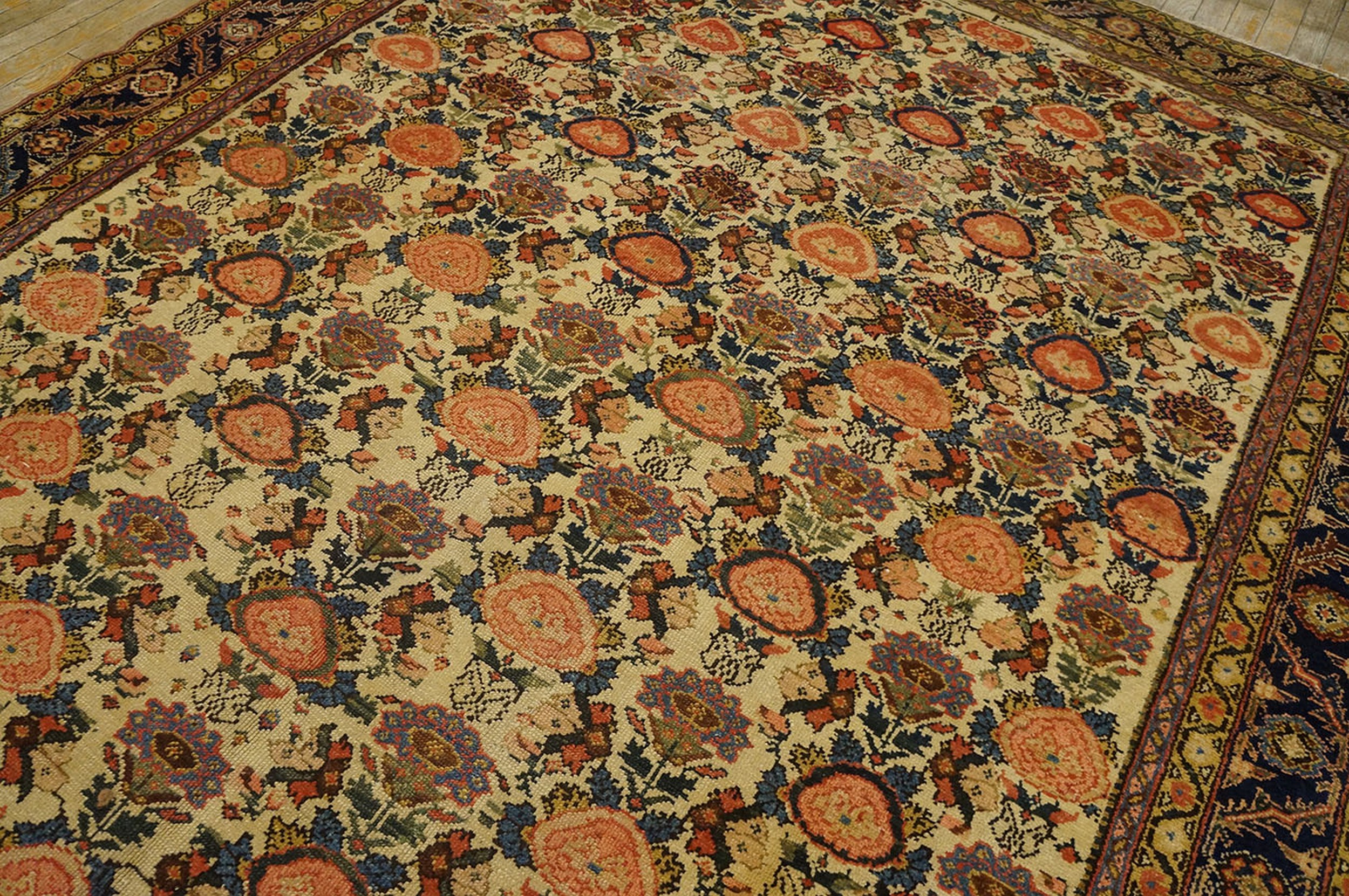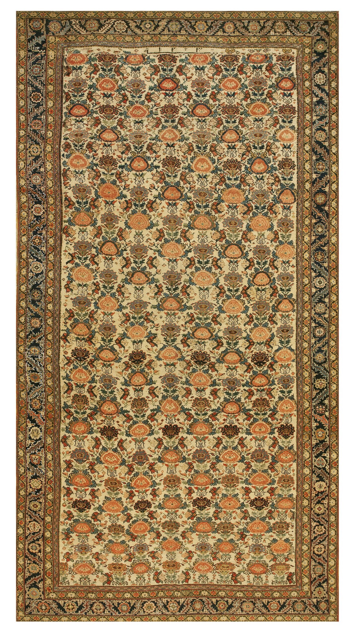 The field presents a highly saturated, all-over repeating design of stylized blossoms and palmettes. This intricate botanical arrangement is set against a luminous ground of soft ivory wool, allowing the rich terracotta, deep indigo, and russet tones of the pattern to achieve maximum visual depth. The masterful application of cochineal and vegetable dyes ensures a patina that only two centuries of careful preservation can achieve.
