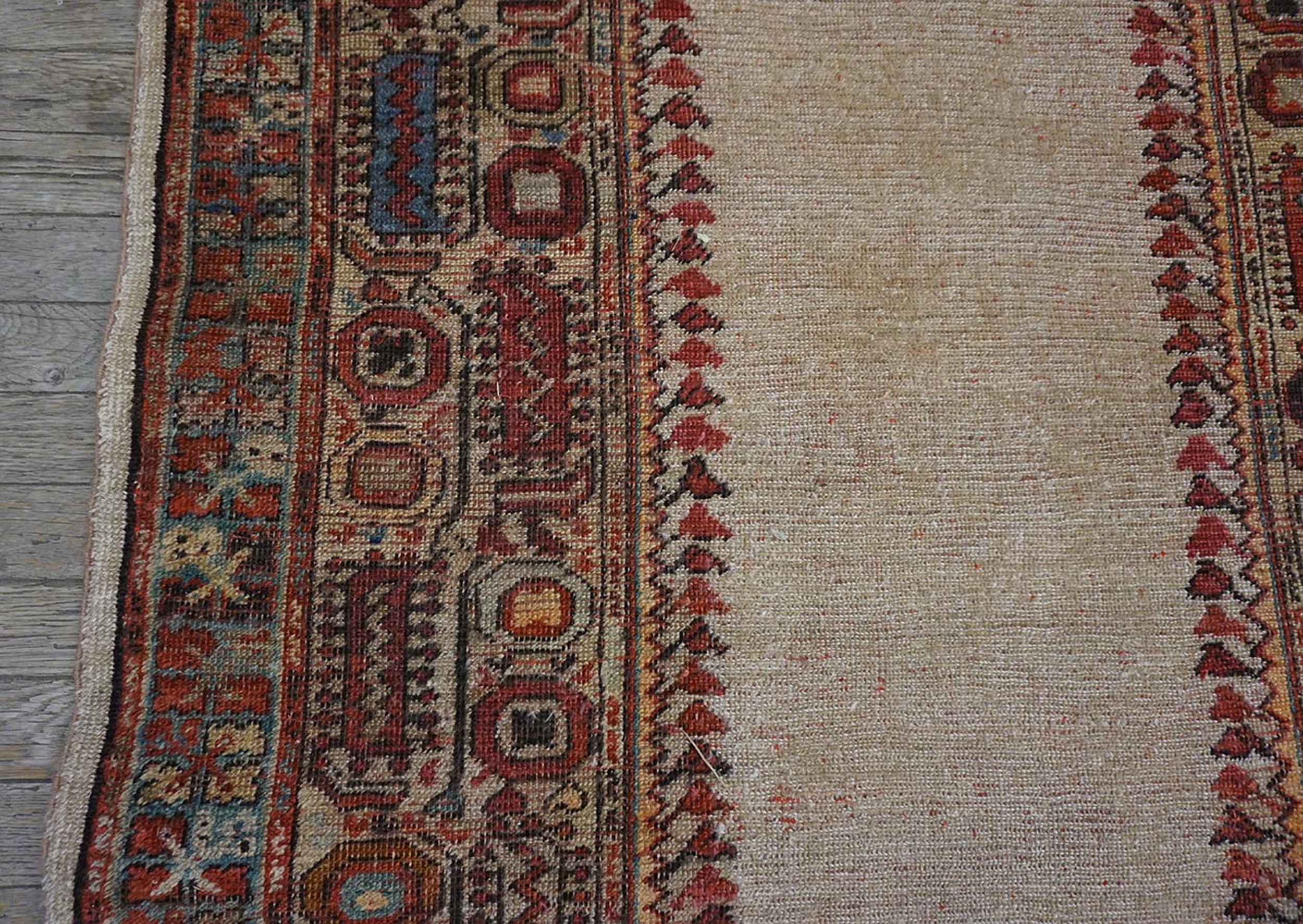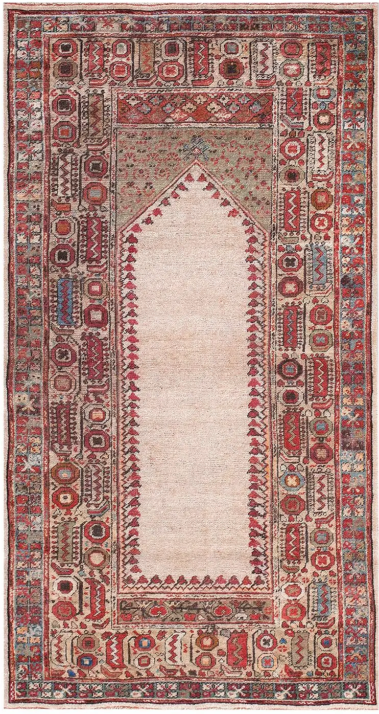 Characteristic of 19th-century Ghiordes work, the guard stripes and main border employ highly abstracted motifs, including stepped medallions and stylized zigzags. These bold, primal forms underscore the enduring appeal of geometric rugs woven in Western Turkey during the late Ottoman period.