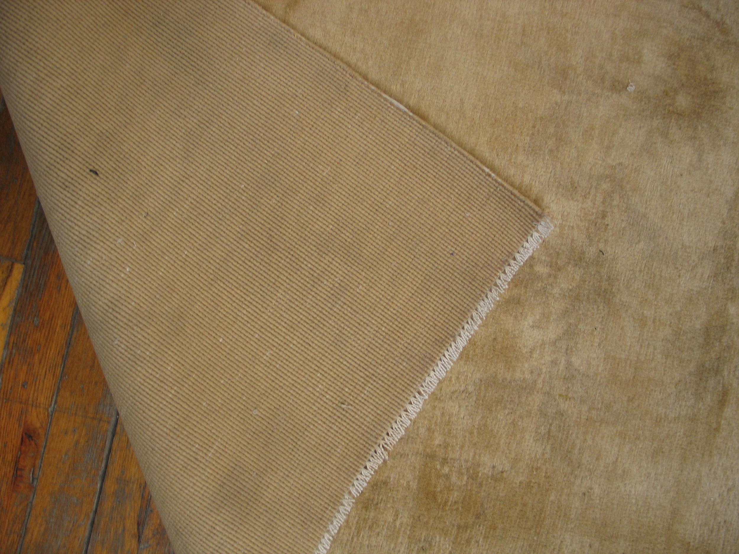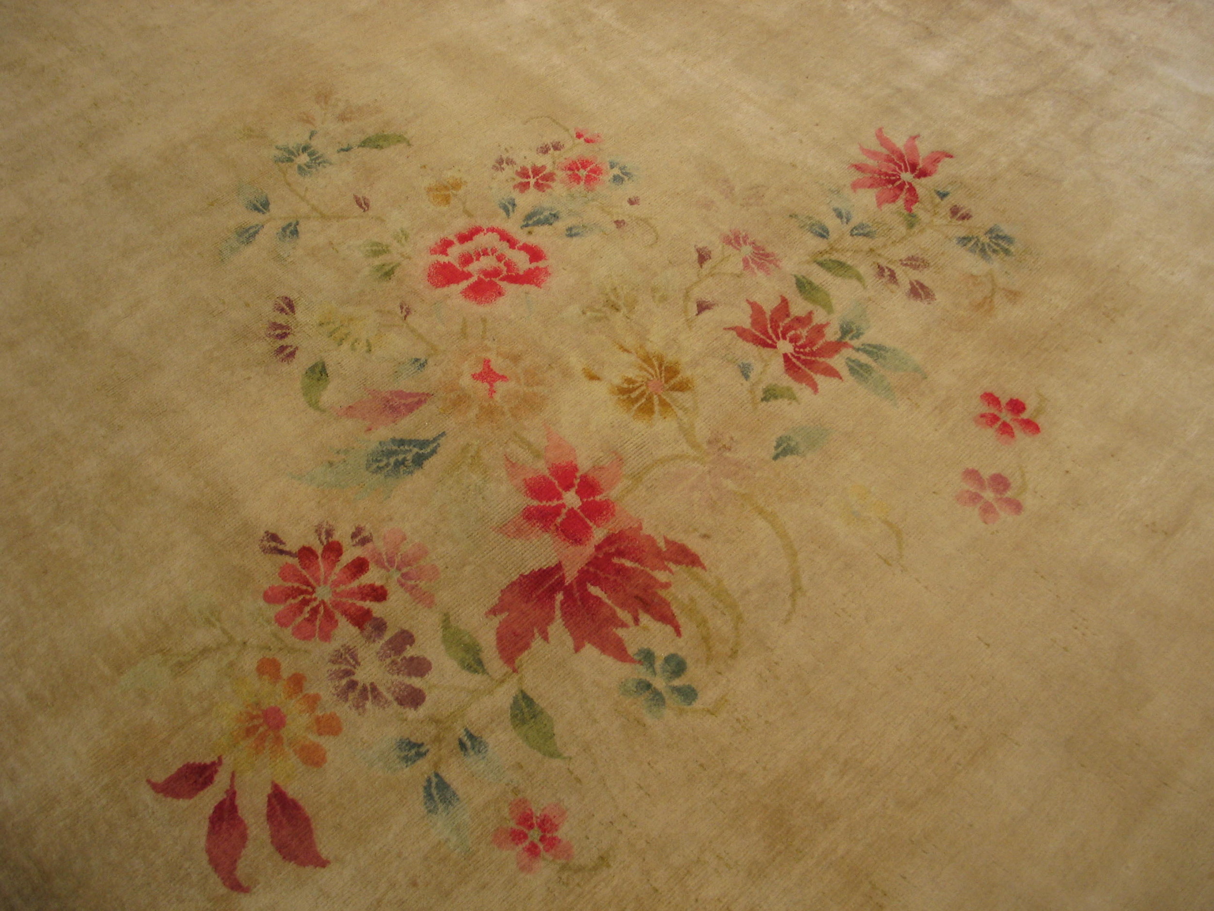 The design features asymmetrical sprays of blossoms and vines, rendered in muted tones of rose, pale yellow, and sage. This artistic approach distinguishes it from more formal, centralized patterns, placing it among the most sought-after floral rugs of the era, where naturalism and spontaneity were highly valued.