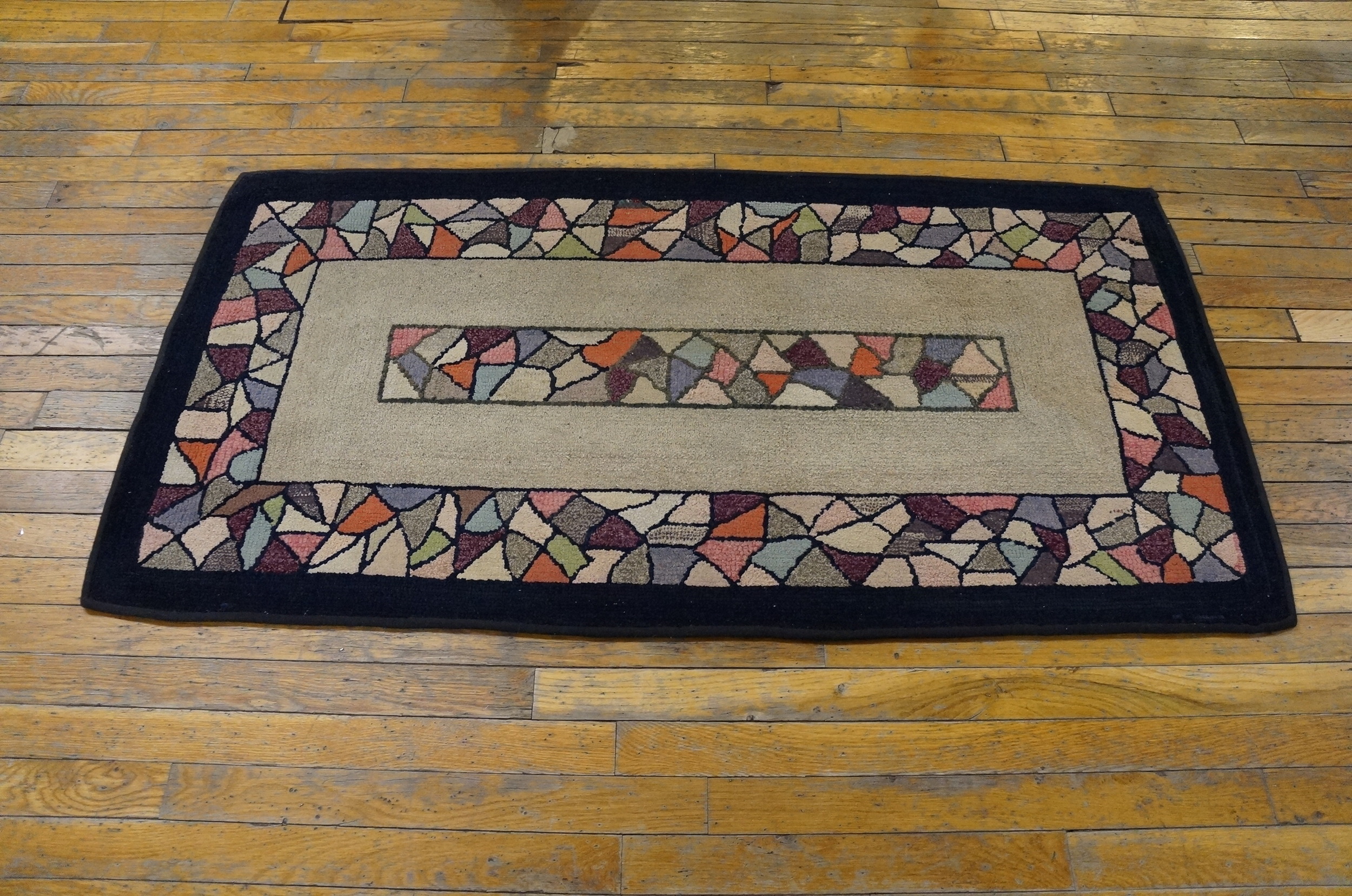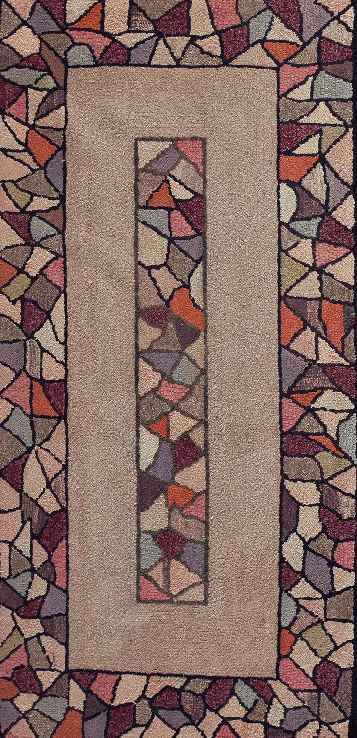 Reflecting the modernist sensibilities of the 1930s, the design relies heavily on geometric rugs principles. The irregular, tessellated shapes creating the border and the central medallion strip suggest a playful yet structured approach to abstraction, moving away from traditional European or Oriental motifs.