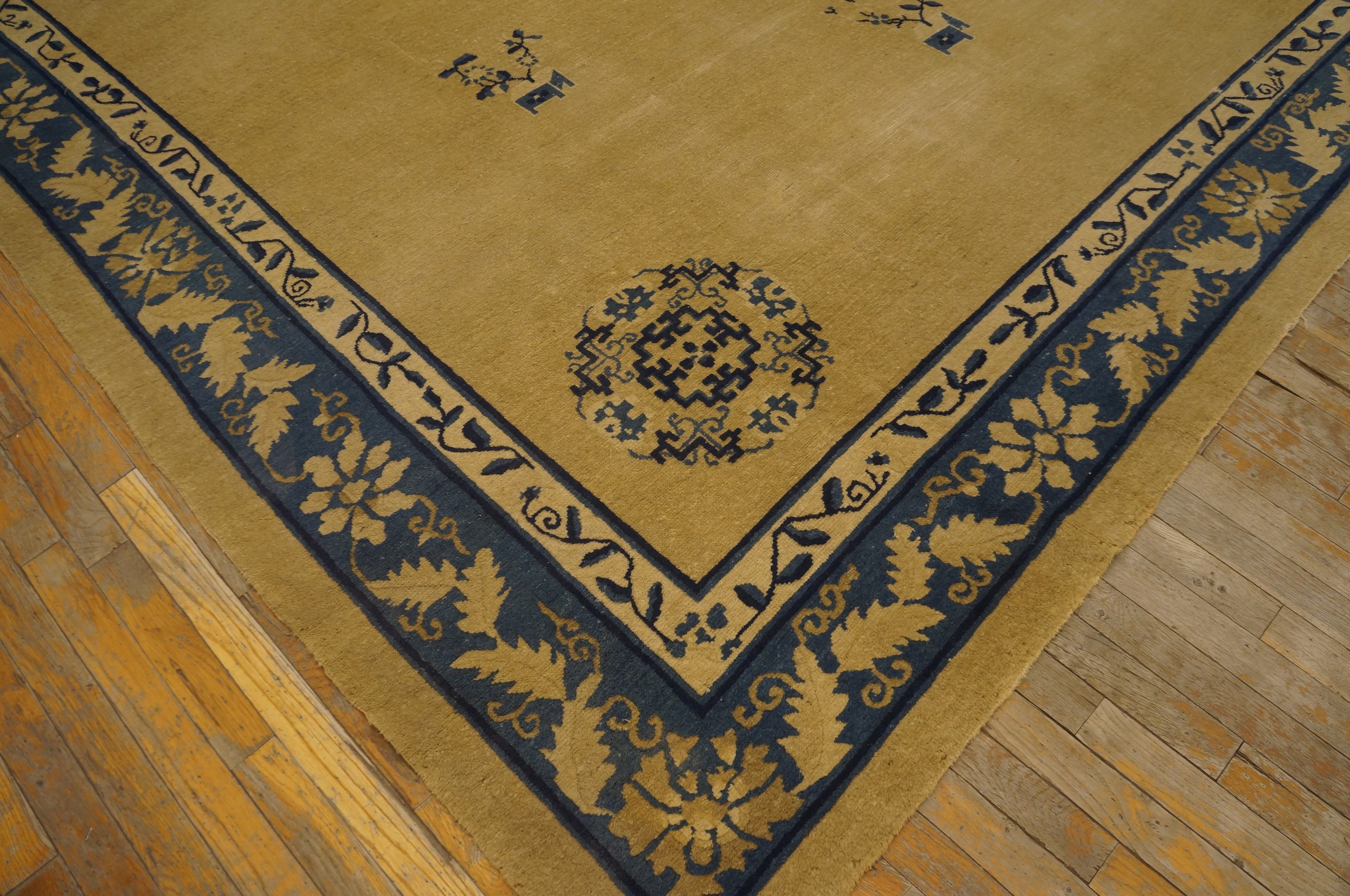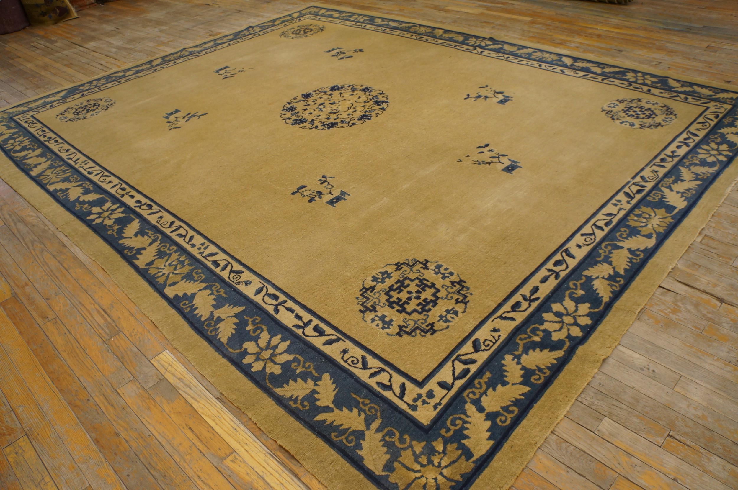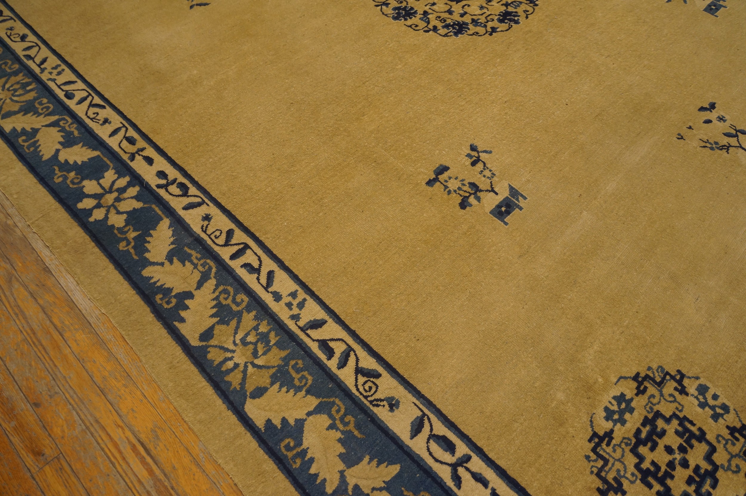 Flanking the central space is a magnificent, multi-layered border system featuring stylized foliage and classical Chinese fretwork. The deep blue main stripe is adorned with lighter, scrolling floral motifs, framing the composition with authority. Such well-preserved antique rugs from the Republican era are highly sought after for their unique blend of Eastern tradition and Western modernism.