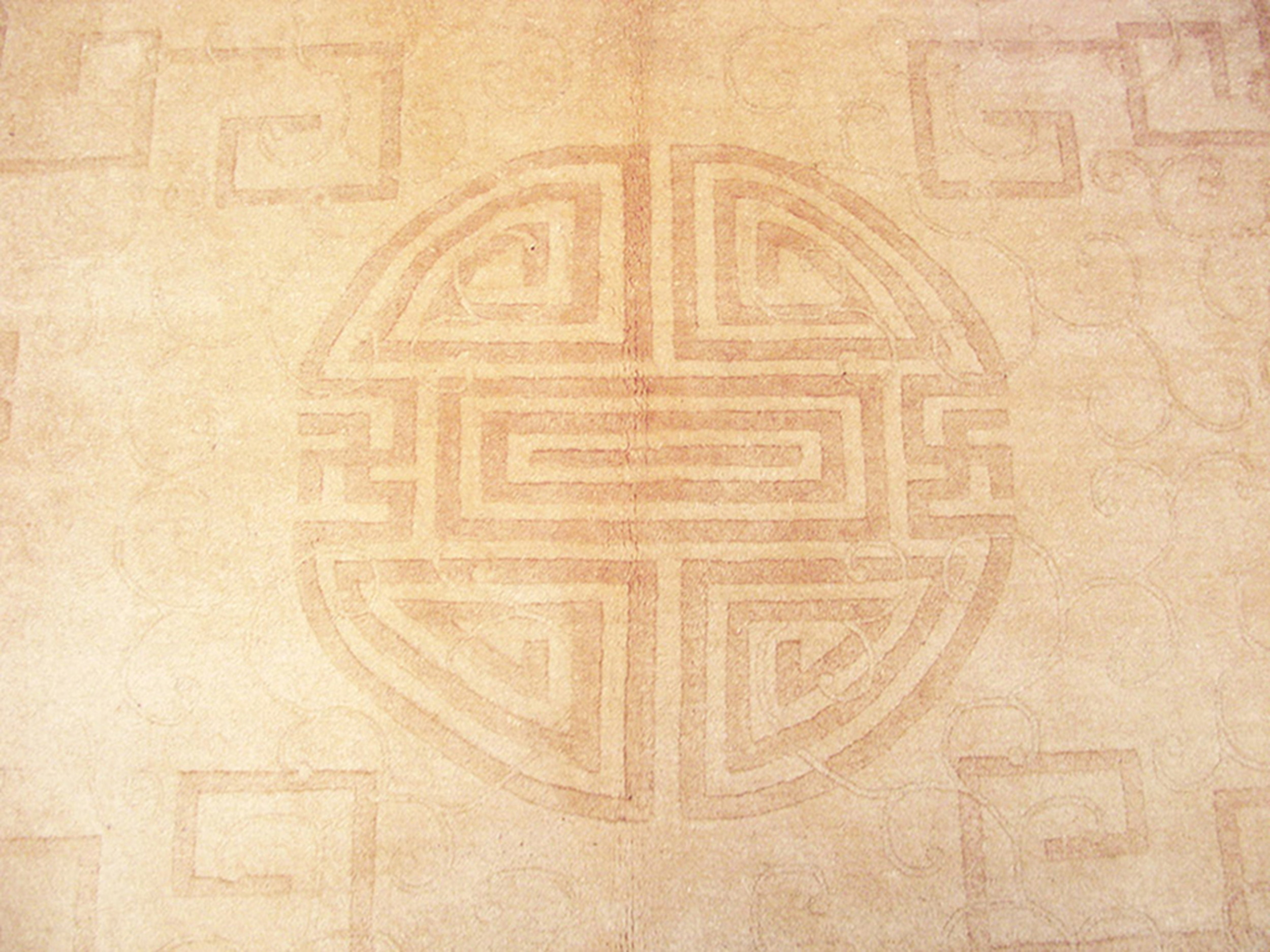 The field is rendered in a soft, luminous ivory beige cream tone, characteristic of the most desirable Chinese carpets of this era. This expansive light ground allows the intricate, tone-on-tone patterning to emerge subtly, emphasizing texture and luminosity over high contrast.