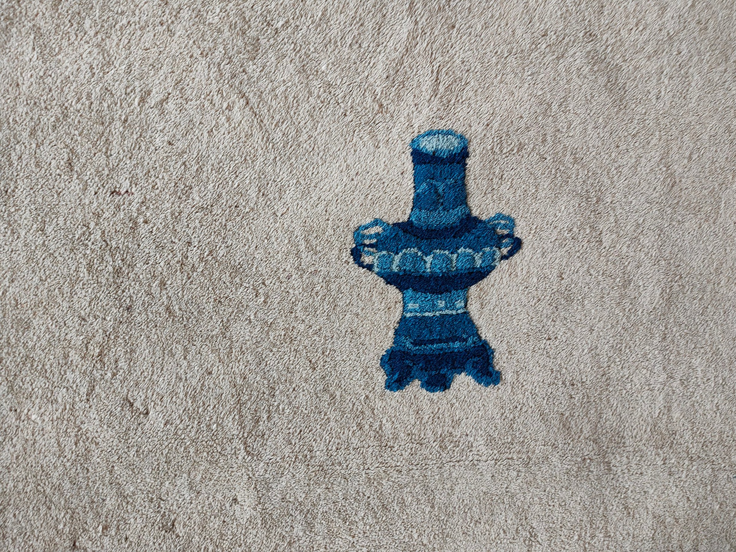 The palette is anchored by a magnificent Antique Ivory foundation. This “parchment” or “clotted-cream” ground has mellowed over more than a century into a warm, sun-drenched tone that reflects light with a soft, matte glow. Against this luminous stage, the floral motifs are rendered in a sophisticated range of Indigo Blue, Slate, and Midnight. Because this is an antique specimen, the natural dyes exhibit a beautiful “watercolor” abrash, where the blues shift in tone like the surface of a deep lake, giving the simple palette a three-dimensional depth and a sense of historical gravity.