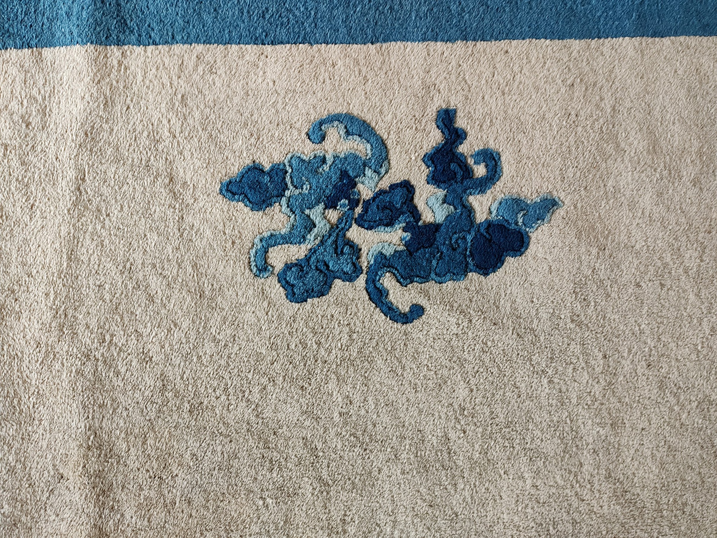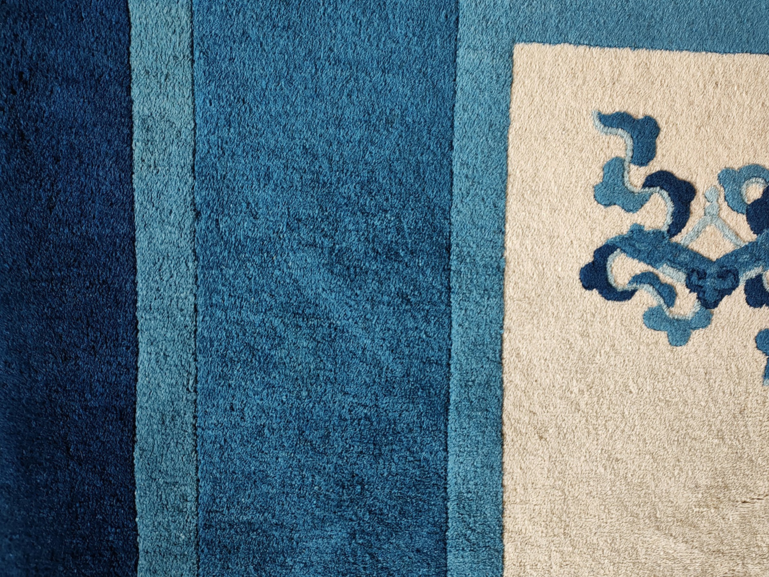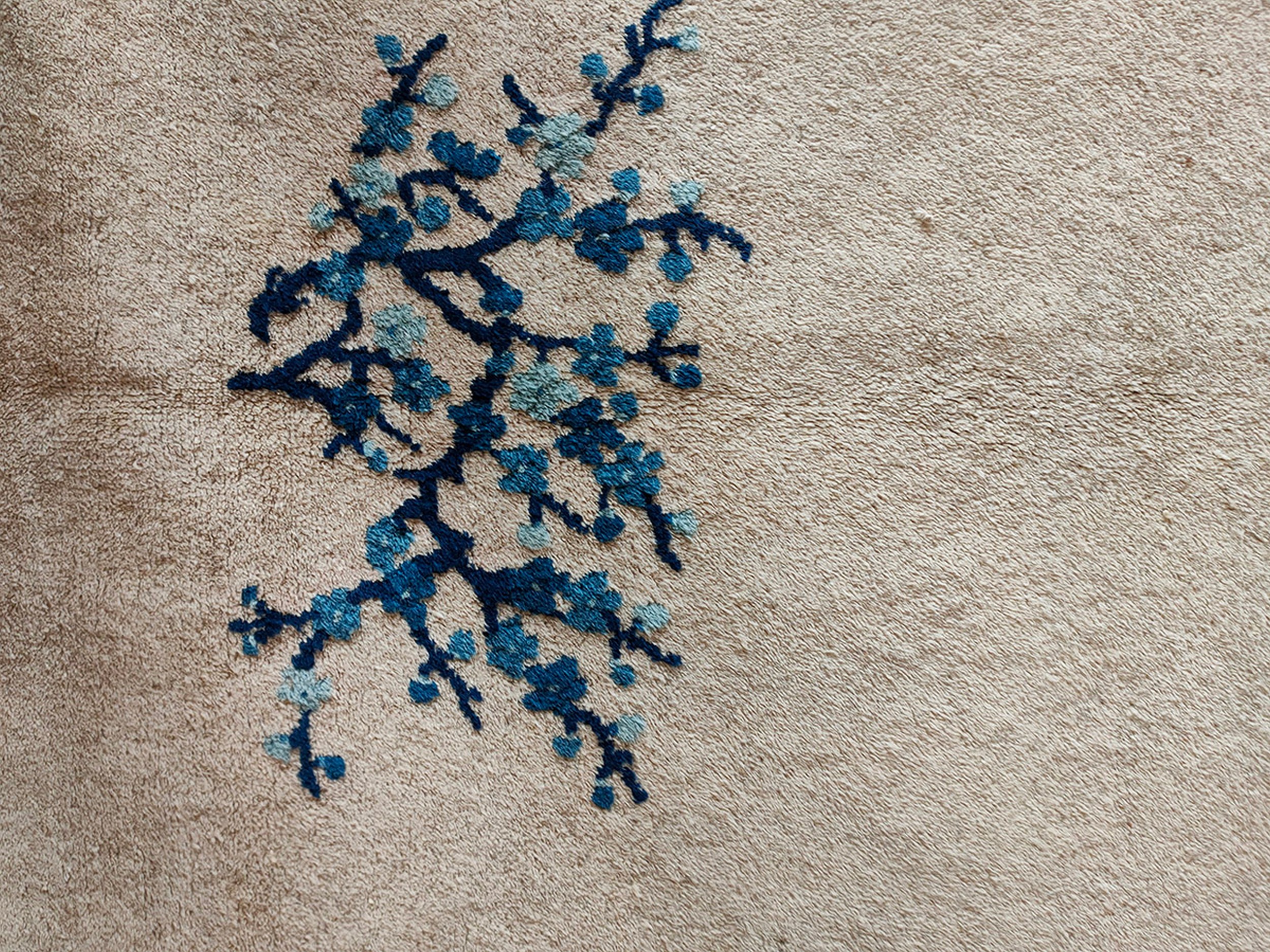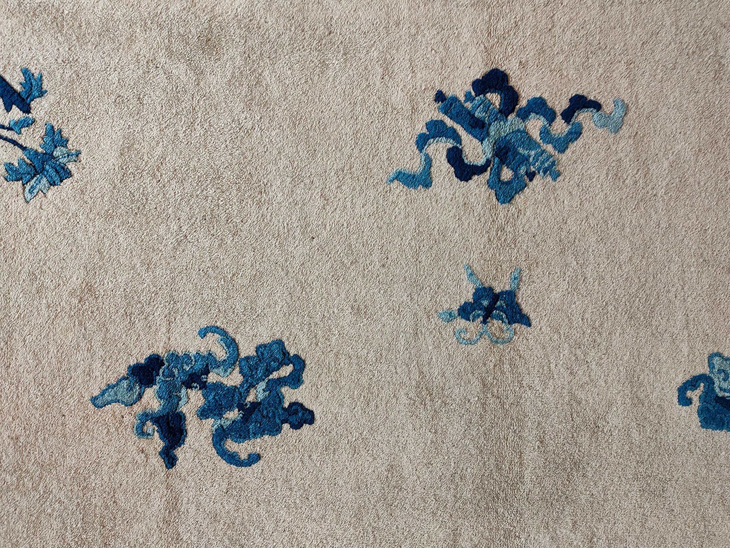Technically, antique Chinese Peking carpets of this caliber are prized for their lush, high-grade wool pile and substantial, “meaty” handle. The wool used in these urban workshops was often sourced from high-altitude sheep and was rich in natural lanolin, resulting in a velvety surface with a subtle, healthy sheen. A hallmark of this tradition is the hand-carving or “embossing” technique, where the weaver hand-clipped the wool around the floral motifs to create a sculptural depth, making the blossoms appear to lift away from the ivory field.