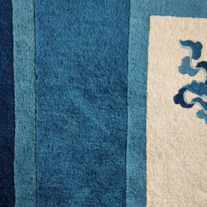 This nineteenth-century Chinese Peking carpet is a luminous and serene example of the “Qing Dynasty” aesthetic, capturing a moment of classical restraint before the more flamboyant Art Deco movement of the 1920s. Originating from the prestigious workshops of Beijing (Peking), this room-size area rug is a masterclass in the “scholar’s taste”—a design philosophy that prioritizes negative space, symbolic clarity, and a tranquil, monochromatic soul.