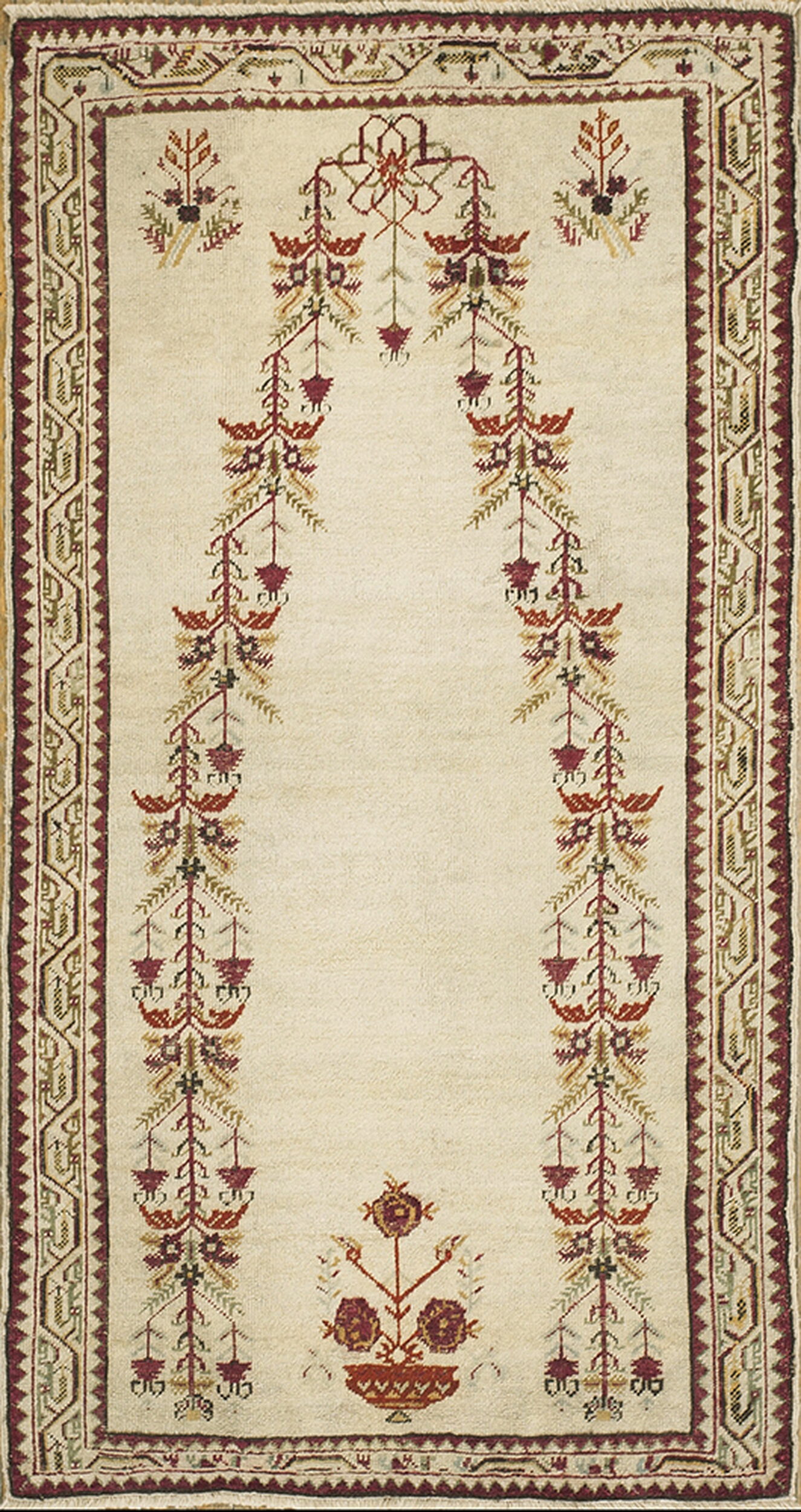 The central niche is framed by highly stylized floral motifs that ascend vertically, creating the traditional archway characteristic of prayer rugs. These botanical elements are rendered with a geometric precision typical of 19th-century Ghiordes work, demonstrating a sophisticated balance between naturalistic inspiration and abstract form.