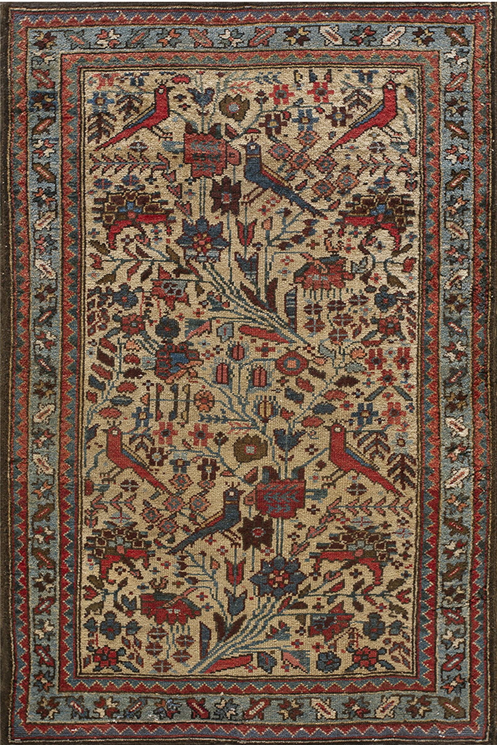 The field features a captivating, dense composition of stylized flora and fauna, characteristic of Malayer village work. Prominent avian motifs, including stylized birds in striking red and blue, are interspersed among flowering vines and geometric abstractions, creating a vibrant allover pattern that draws the eye across the entire surface.