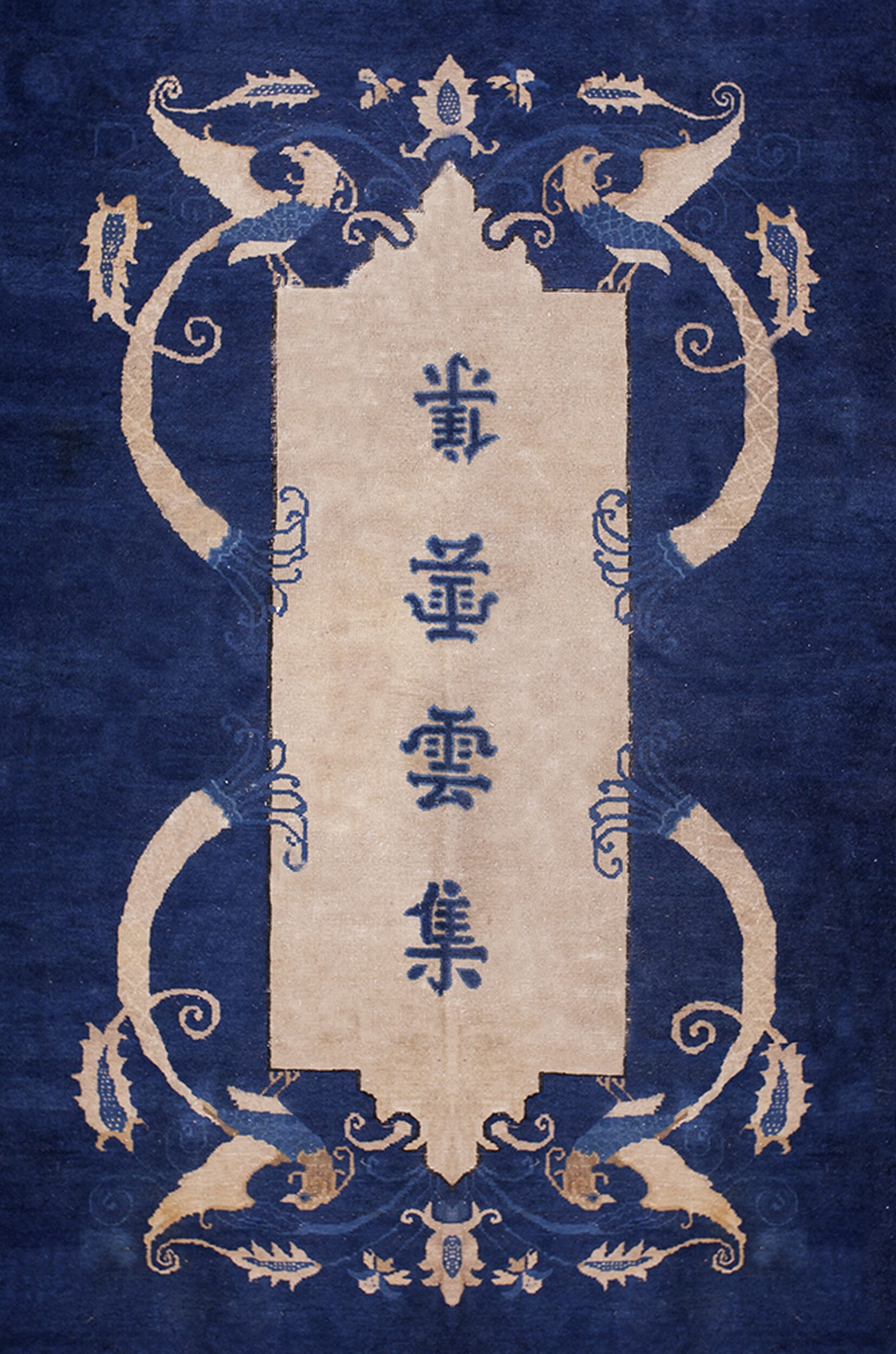 The design centers on a rectangular ivory cartouche containing elegant, stylized calligraphy, framed by sweeping, curvilinear branches and mythical birds rendered in the same pale tone. This sophisticated composition reflects the revival of classical Chinese art forms adapted for the Western market, making it a highly desirable example of antique rugs.