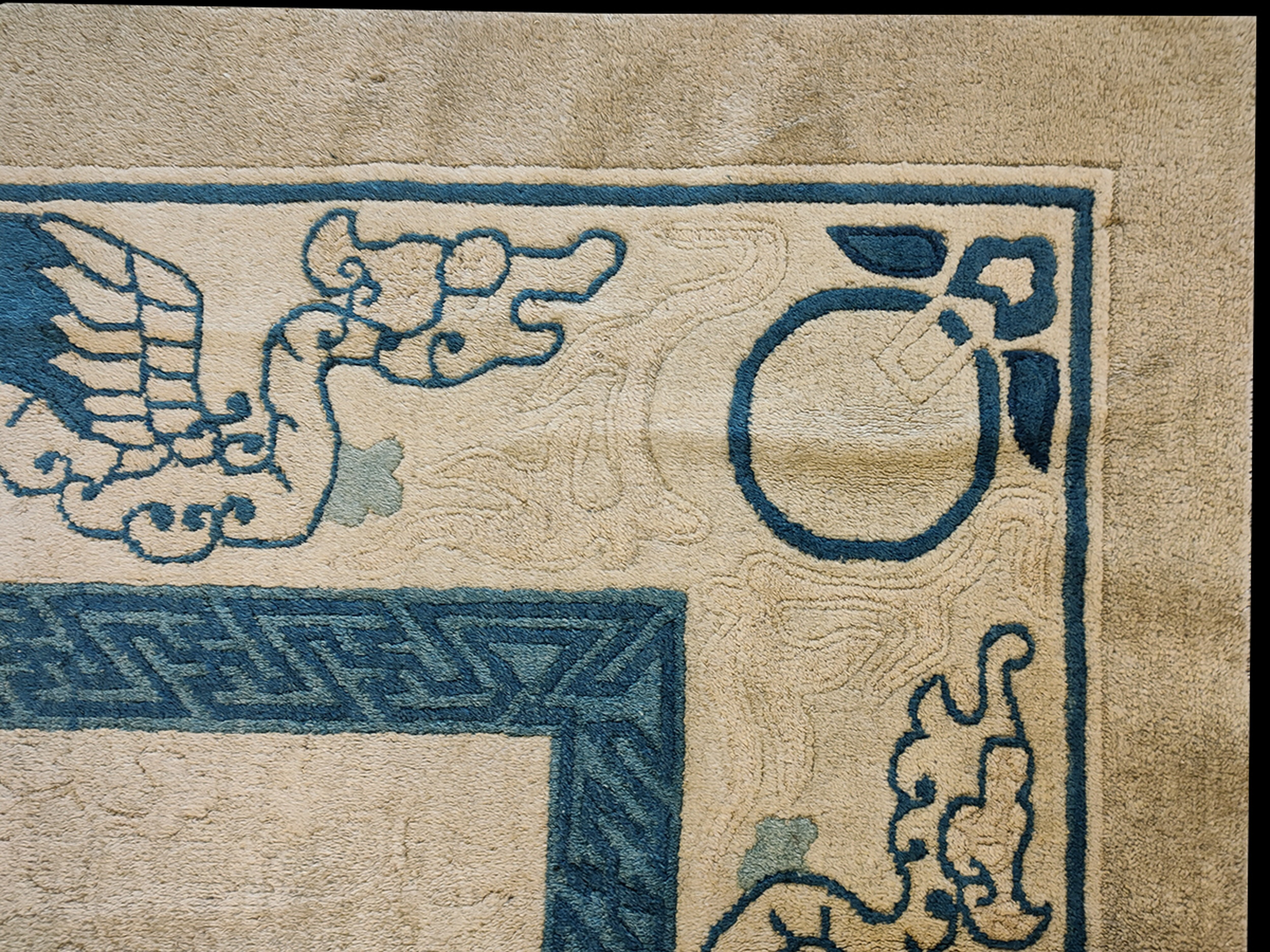 While the corner spandrels feature traditional curvilinear dragon or cloud imagery, the primary border employs a striking, angular Greek Key design. This juxtaposition of traditional organic forms with strong geometric rugs elements creates visual tension and emphasizes the rug’s architectural structure.