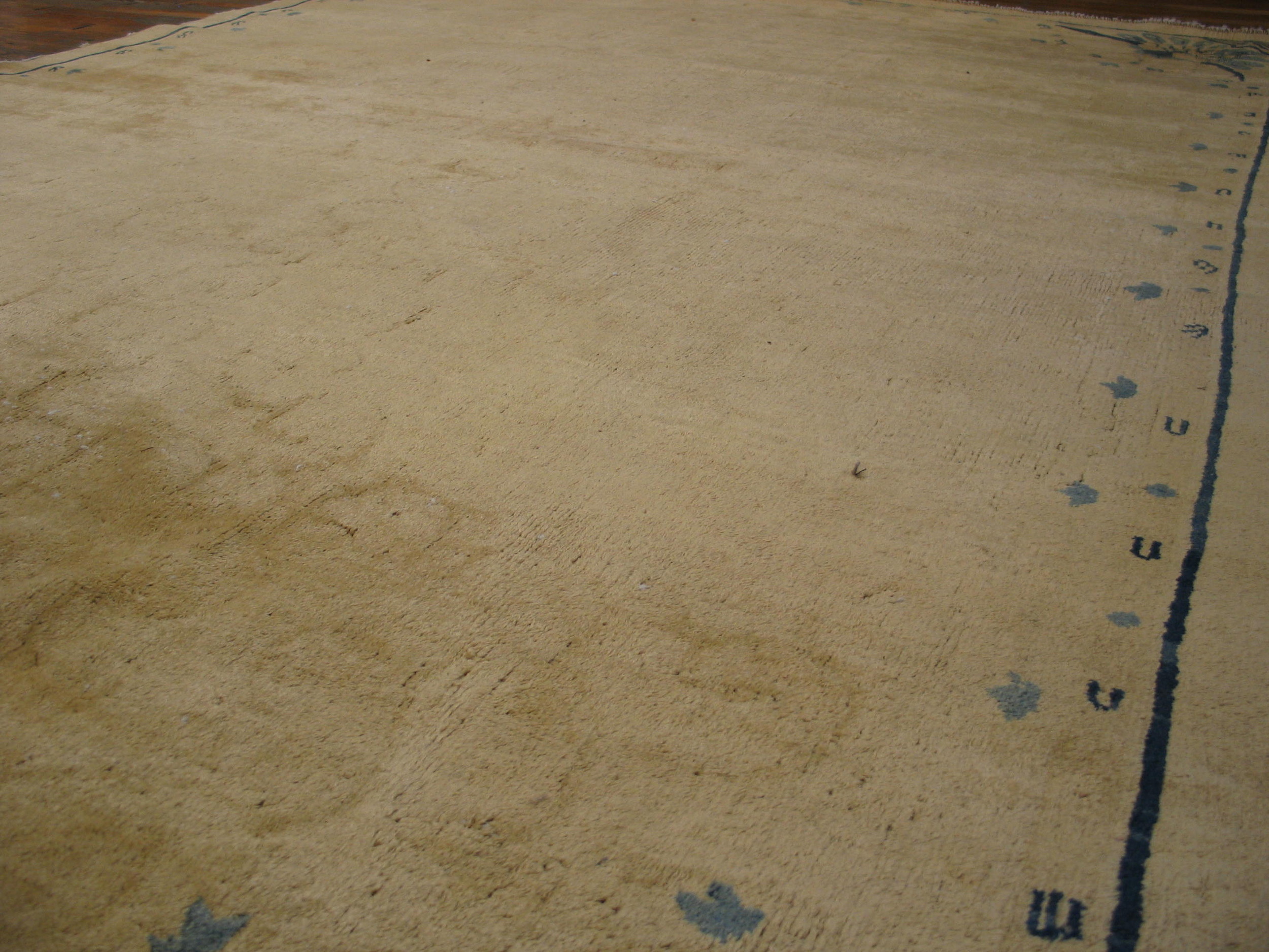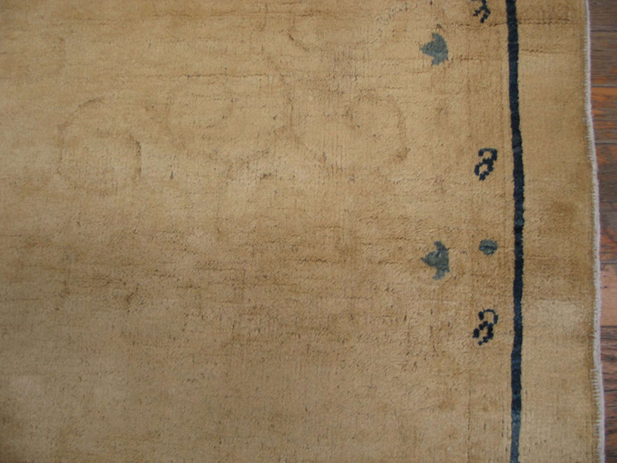 The design is characterized by a remarkable openness, allowing the texture of the hand-knotted wool pile to take precedence over heavy ornamentation. The subtle decoration is confined primarily to the borders and corner spandrels, featuring stylized, dark blue elements that contrast sharply yet harmoniously with the light ground. This emphasis on negative space highlights the sophistication of the subtle floral design.