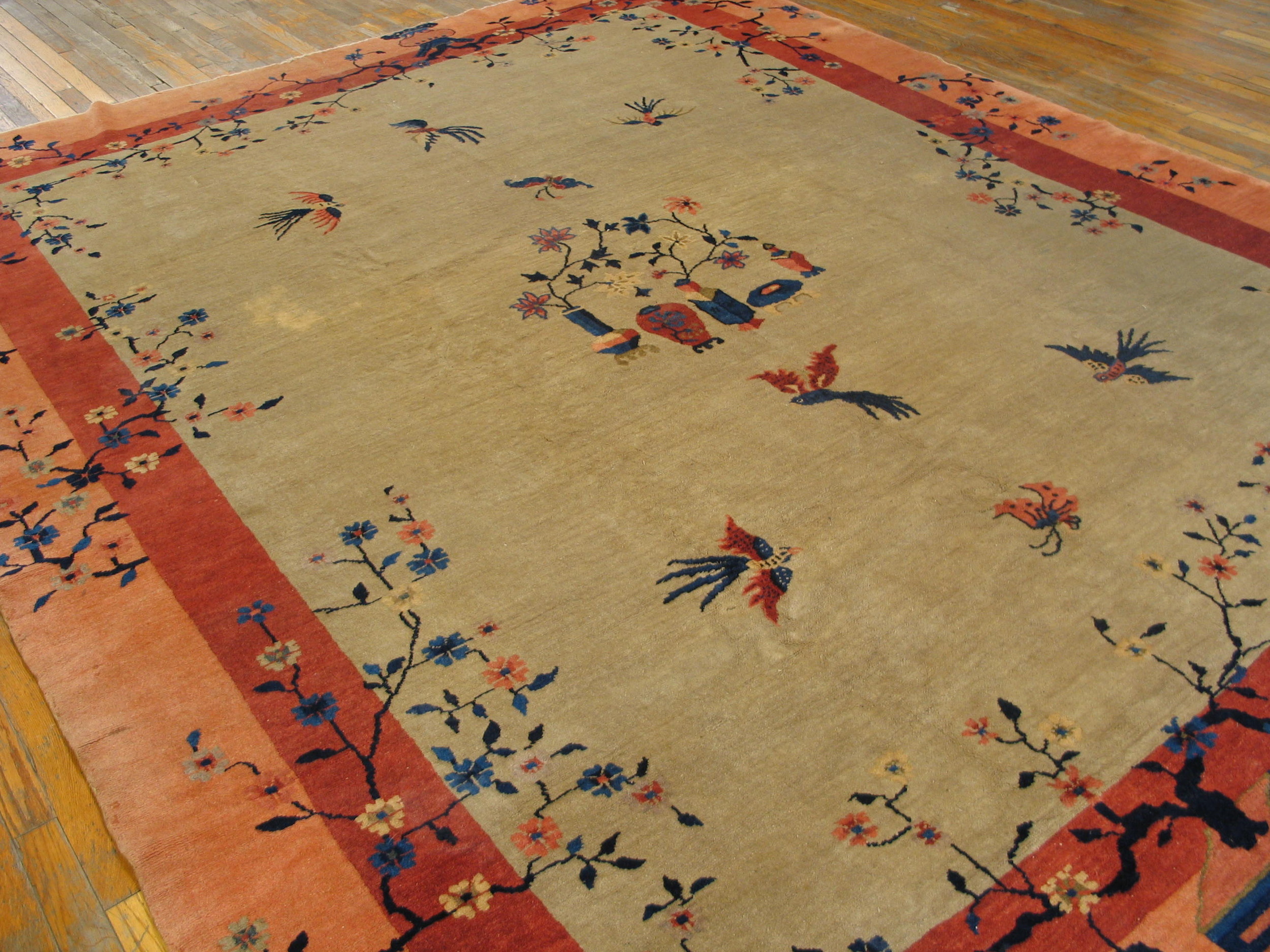 Adorning the field and framing the perimeter are delicate, naturalistic motifs. Flying birds, stylized butterflies, and traditional Chinese vessels are interspersed among trailing branches of blossoms, creating a serene, open composition. This emphasis on nature and organic forms places it firmly within the tradition of floral rugs that defined the finest Peking workshops.