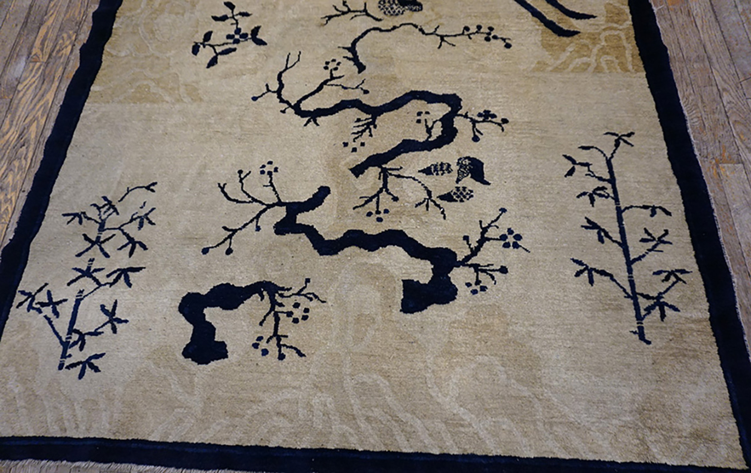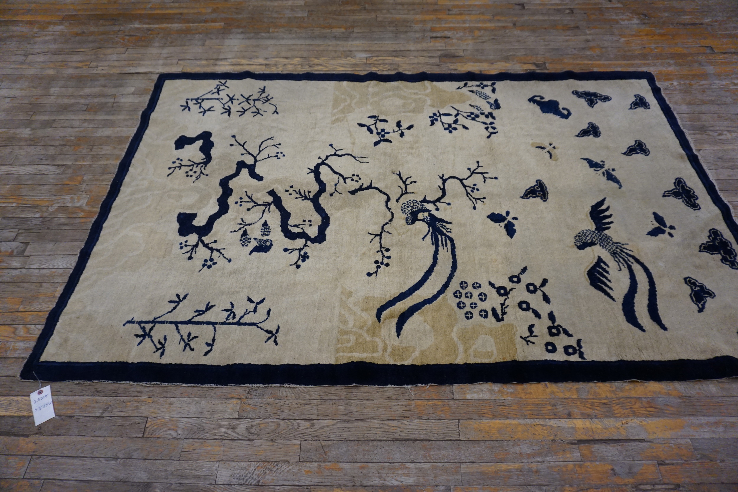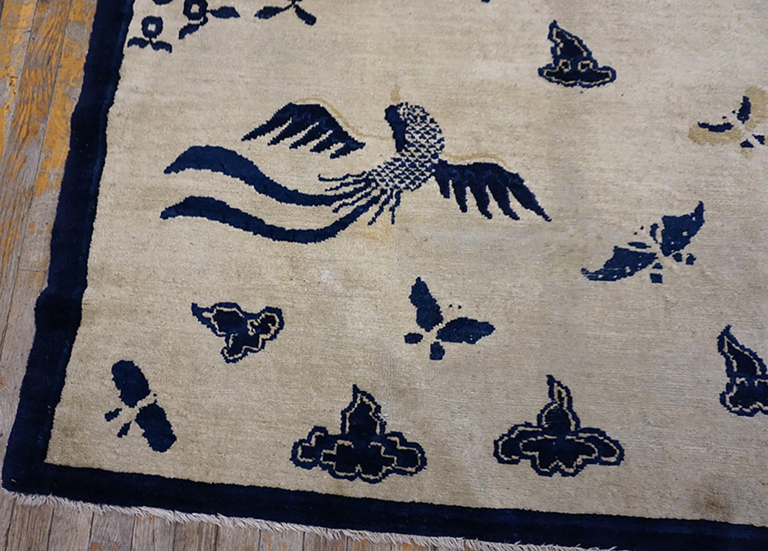 The design is distinctly pictorial, featuring stylized trees, soaring phoenixes, and scattered butterflies rendered in a bold, contrasting blue. These floral rugs and naturalistic elements are executed with the characteristic sparse elegance of the Peking style, emphasizing negative space and graceful line work.