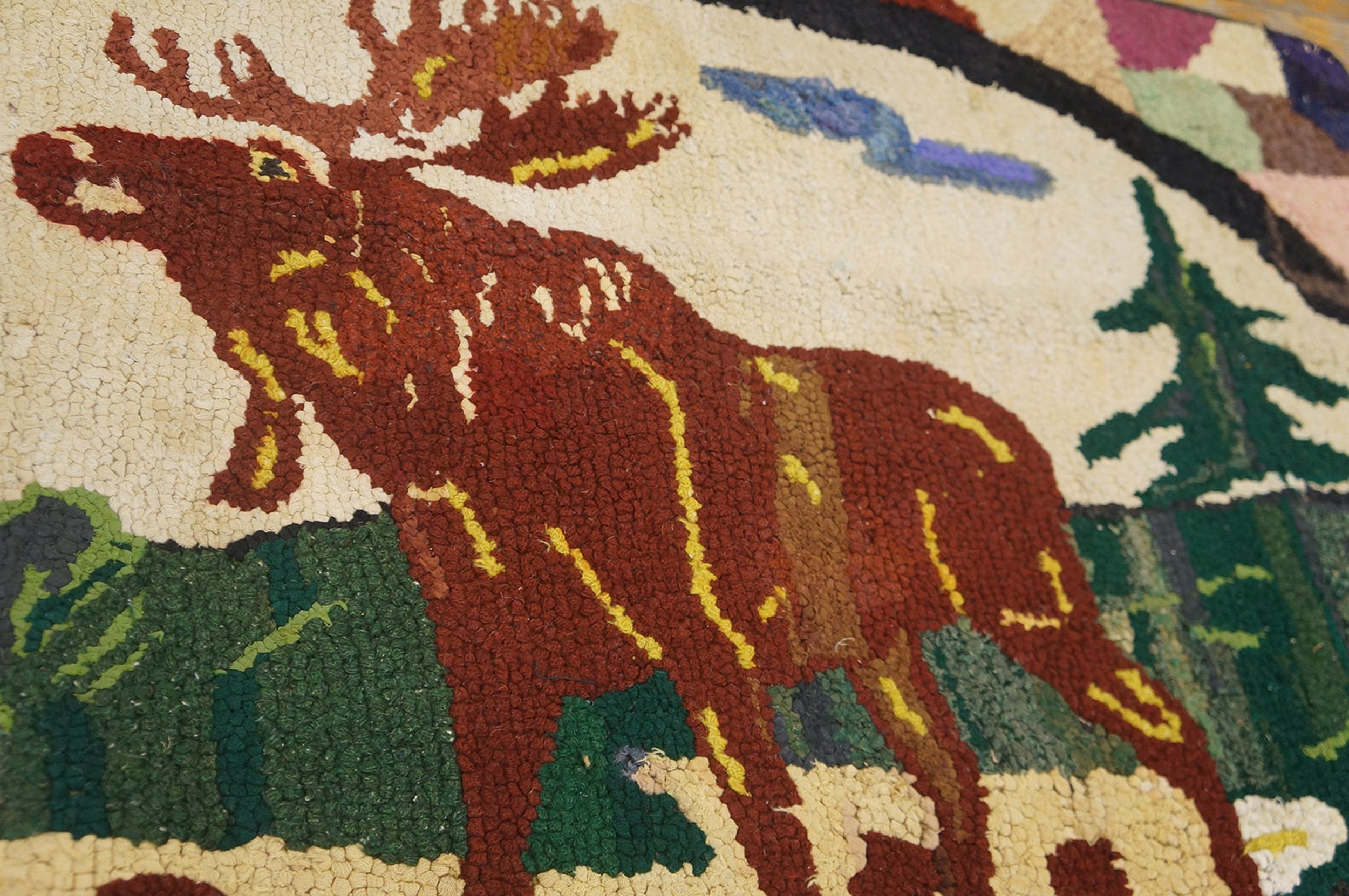 The borders often serve as a simple, grounding frame—sometimes a dark “mottled” edge that “locks in” the lightness of the ivory scenic field. To possess this Antique Moose Pictorial rug is to own a monument to the American creative spirit. It is a work that bridges the gap between domestic utility and narrative fine art—a hand-wrought sanctuary of historical charm and rugged, folk-art brilliance.