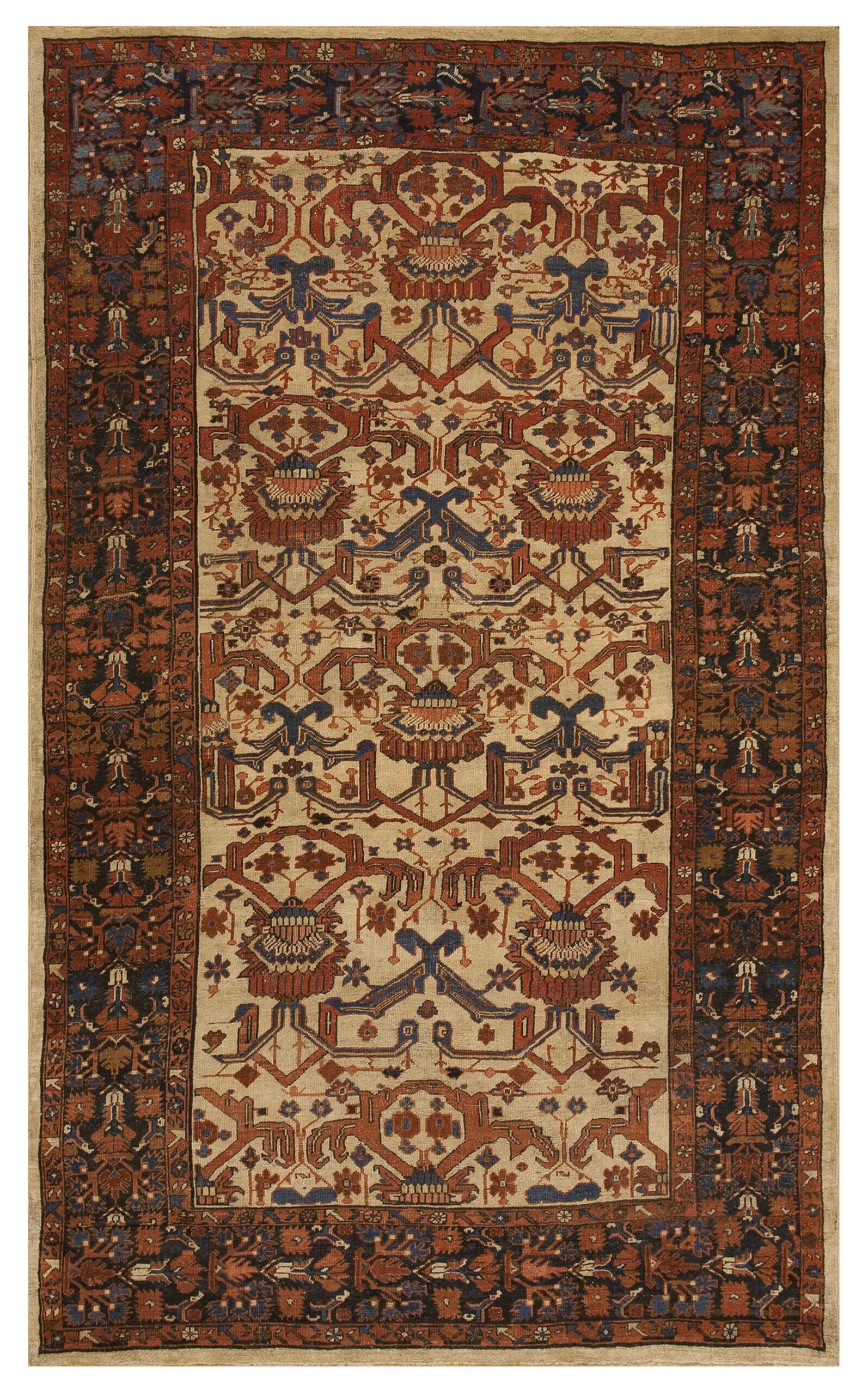 Woven in the northwestern region of Iranian Persian rugs, this textile exhibits the bold scale and graphic clarity often associated with village production. The open field is populated by oversized, repeating medallions and stylized botehs, rendered with a primitive yet majestic hand. The wool quality is superb, reflecting the high standards of natural dyeing prevalent during the Qajar era.
