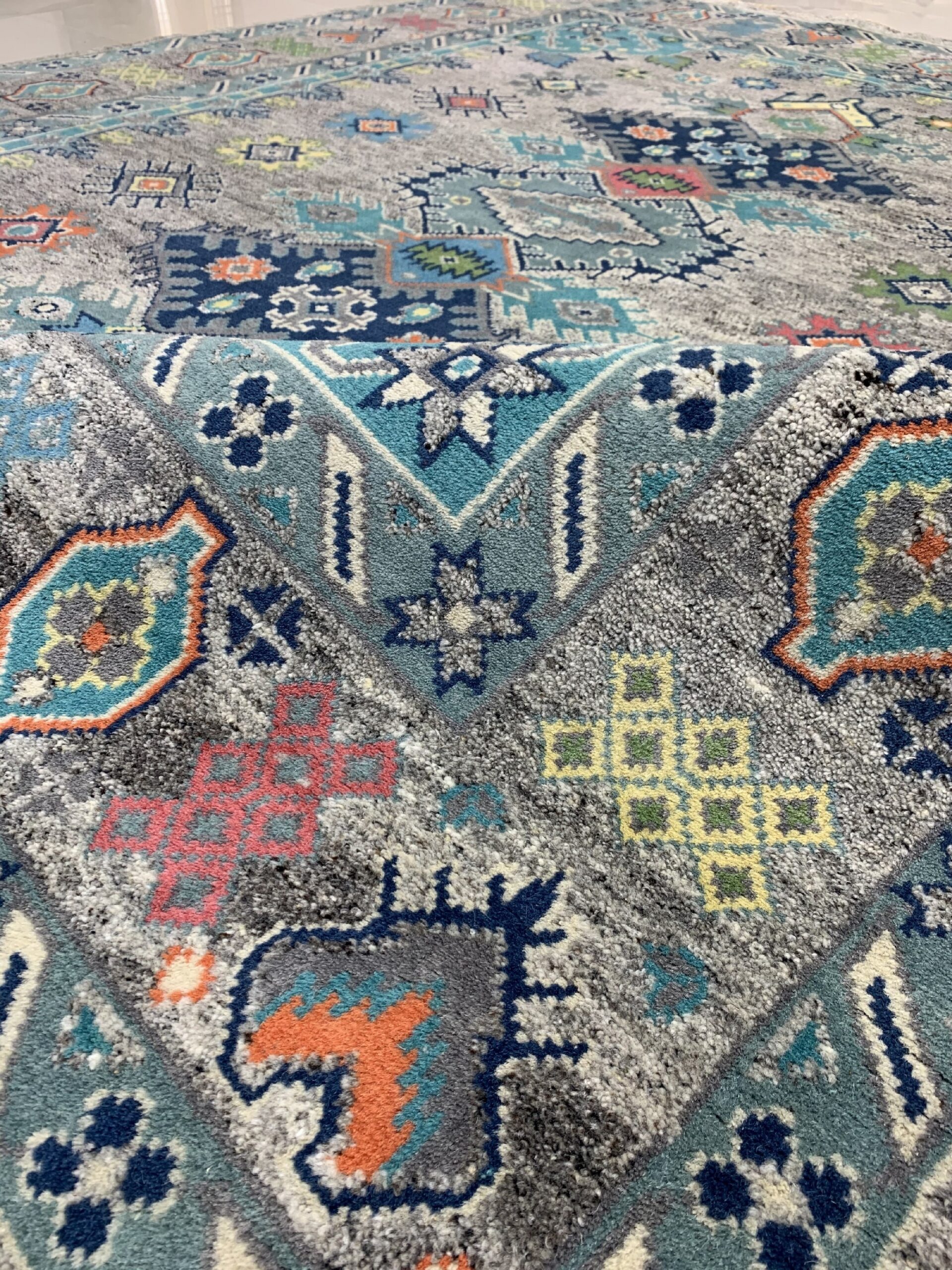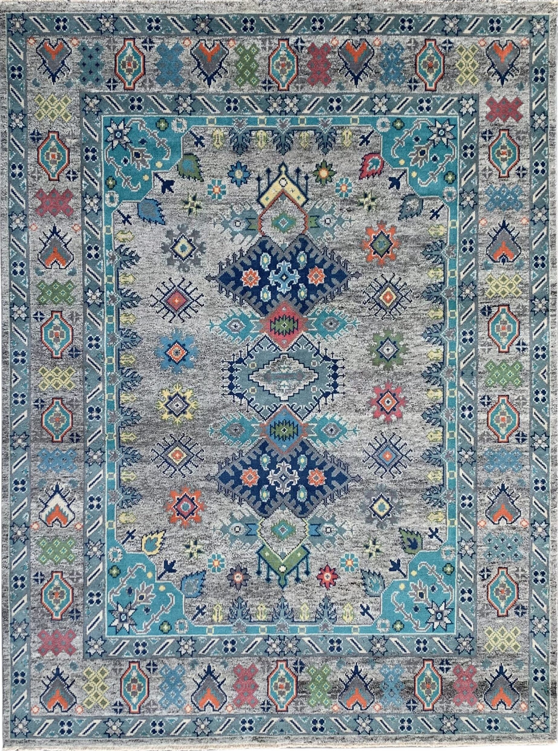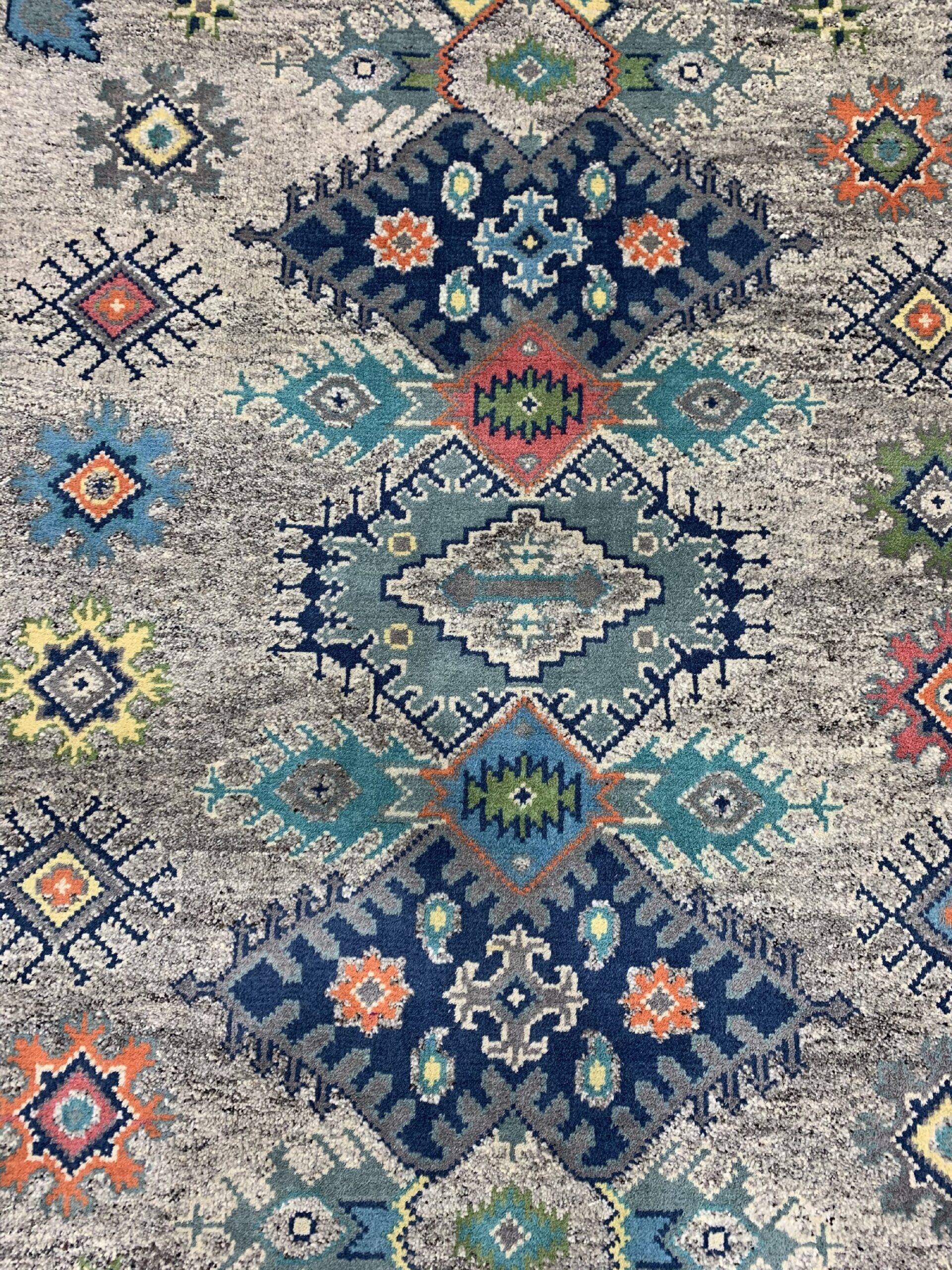 The field is defined by a nuanced, mottled texture that utilizes varying shades of gray color rugs to create depth and movement. Against this neutral canvas, a vibrant array of stylized geometric and floral motifs—rendered in teal, deep blue, coral, and sage—populates the space, offering unexpected visual energy that prevents the design from feeling static.