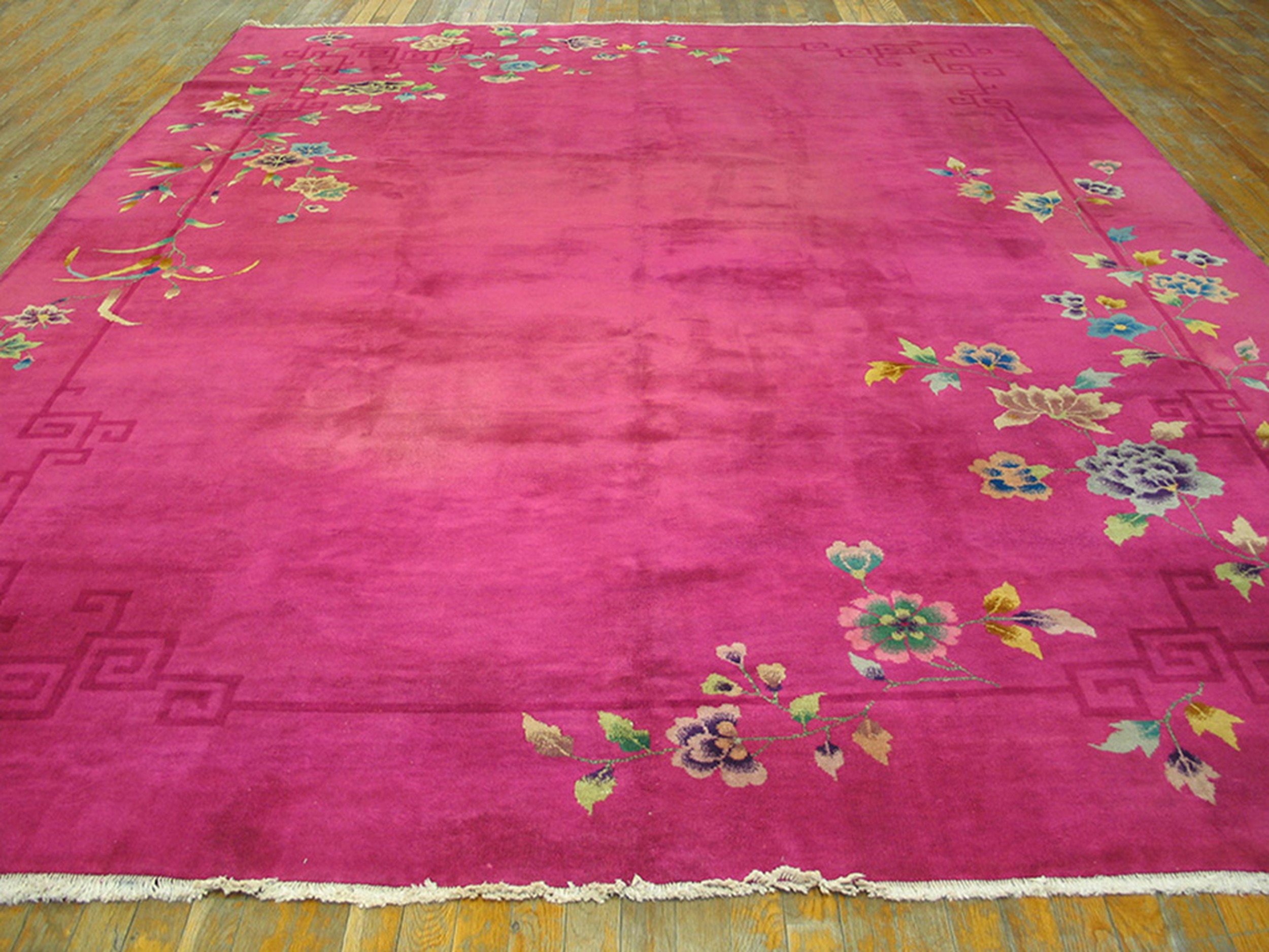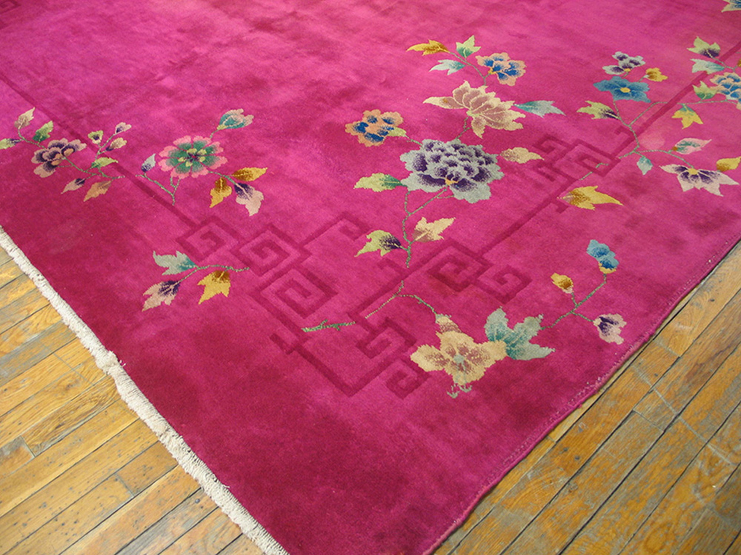 Woven from high-quality wool, the pile retains a luxurious density and sheen, reflecting the meticulous craftsmanship of the era. This striking textile is a superb example of early 20th-century Chinese weaving that successfully bridged traditional aesthetics with modern sensibilities, making it a highly desirable addition to any collection of antique rugs.