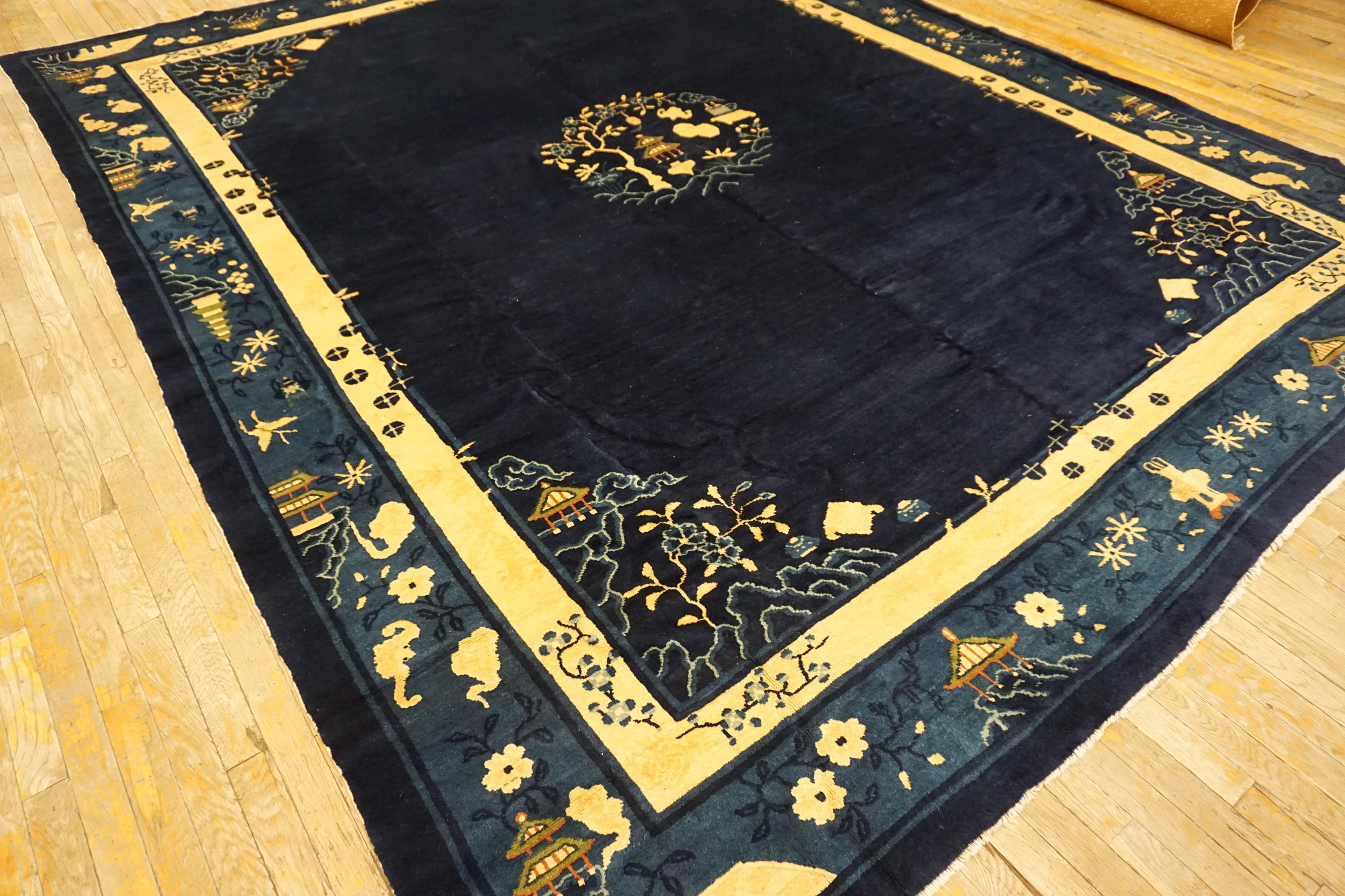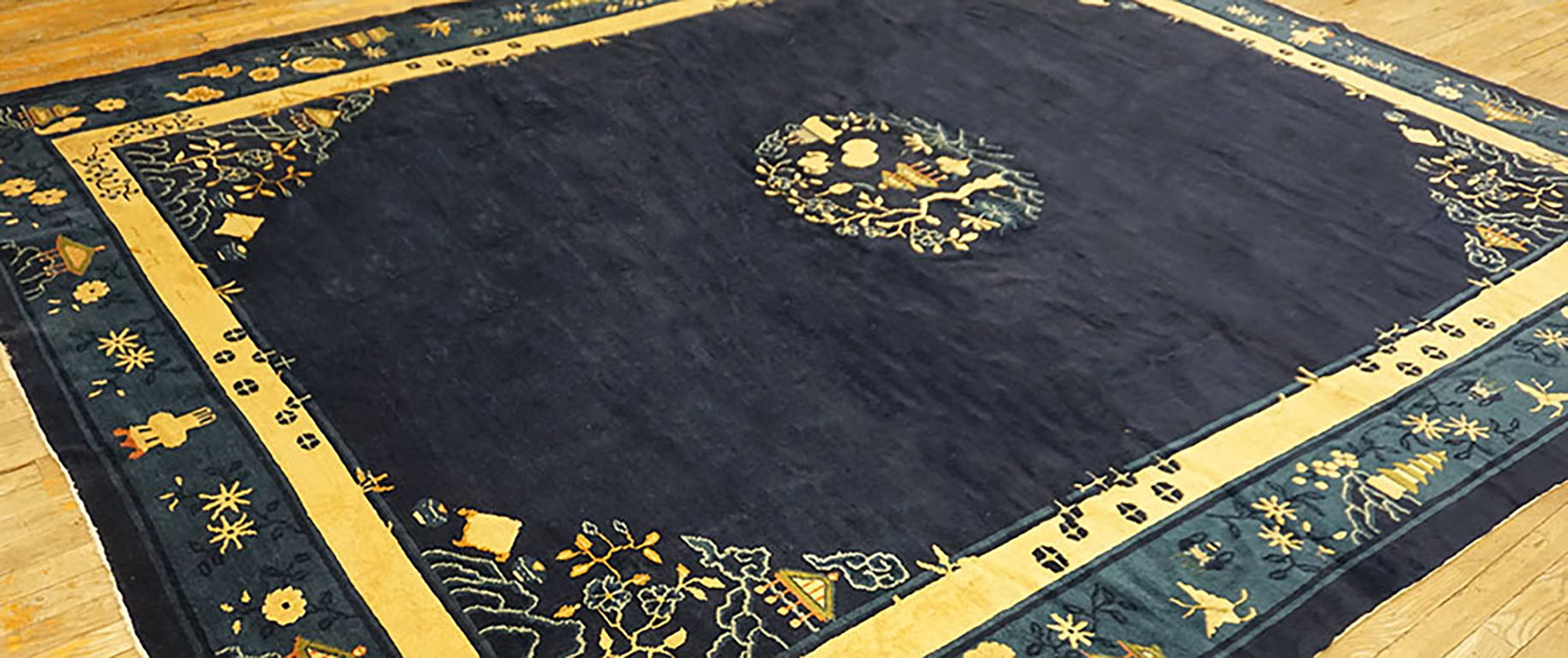 Knotted Antique Chinese Wool Blue – Peking Rectangle 1920s Room Size Rug, Circa Date: 1920s. This exceptional piece represents the height of early 20th-century Chinese weaving, a period when traditional motifs were adapted for Western export markets. Its construction and design integrity confirm its status among the finest antique rugs available today.